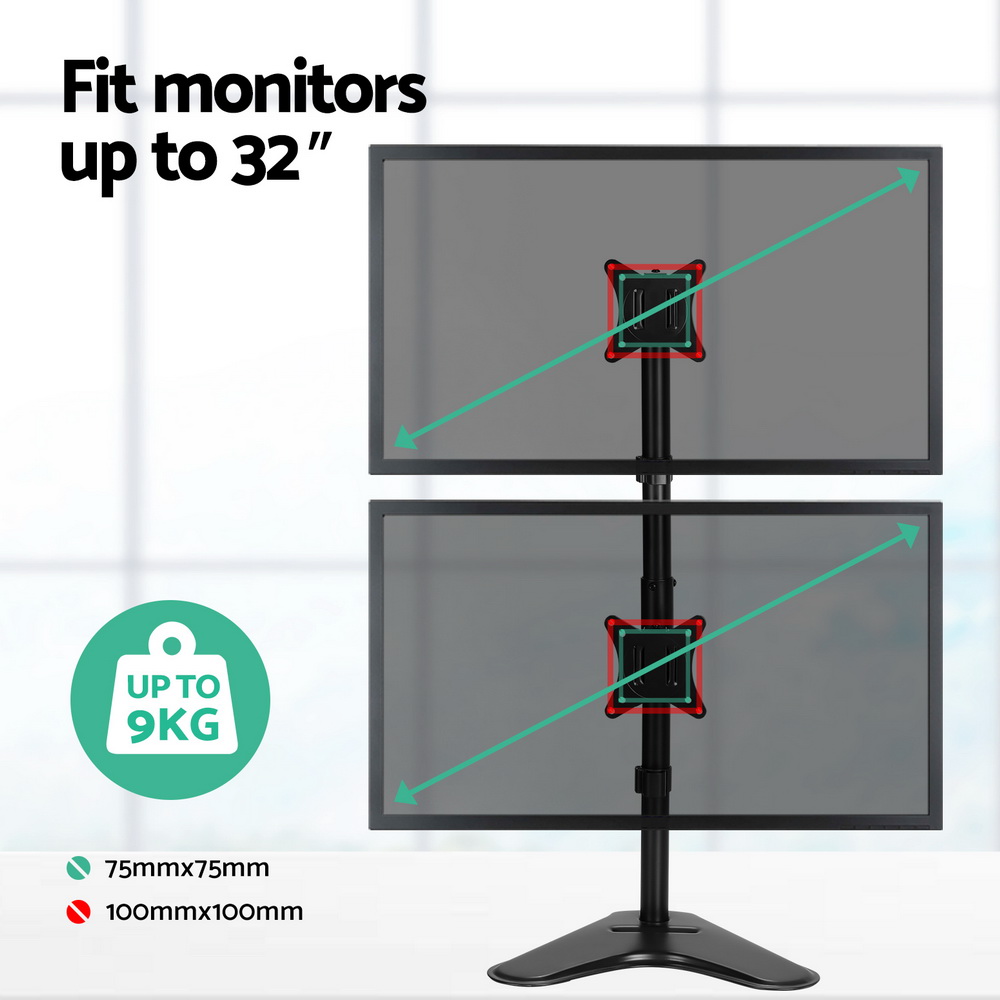 Extend your working display with an Artiss Adjustable Dual Monitor Arm. Easily support two computer monitors on a single arm. Tilt, rotate and swivel your monitors to find the perfect angle. Using the detachable VESA mounts, you can mount any monitor size between 17-32″”. Other great features include a freestanding V-shaped base that does not need any drilling or clamping, cable loops for tidy cabling and an Allen key holder. Made from heavy-duty steel, the monitor arm is designed to stand up to long-lasting use without missing a beat. All the necessary mounting hardware and an assembly manual are included in the package for a hassle-free set-up. Double your productivity with an Artiss Adjustable Dual Monitor Arm today.