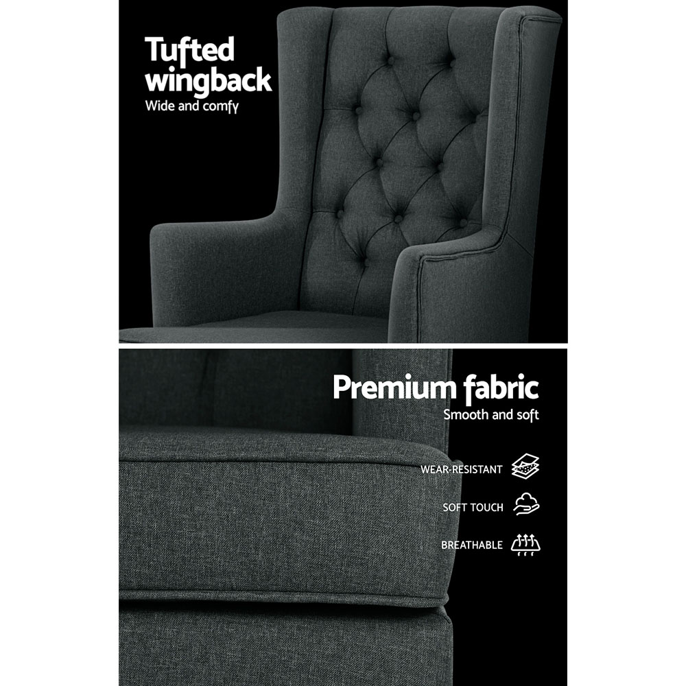 Be swayed. Rock on and relax with our Artiss Gaia Rocking Chair. It comes with two sets of removable legs so that you can use it as a rocking chair or a stationary chair. The gentle swaying of the rocking chair would be perfect for reading, listening to music, taking a much-needed nap, or even rocking your baby to sleep. Or simply swap the legs over and you have a classic accent chair. The iconic design and the tufted wingback exude elegance and timeless appeal. This makes the chair suitable for any décor, from your living room to your nursery. The extra thick foam padding and wide back ensure ultimate comfort with exceptional support. The armchair feet are fitted with pads to keep your floors pristine from scratches and damage. Together with a reinforced wooden frame and quality faux linen fabric upholstery, our armchair is guaranteed to stand up to durable use for many years to come.