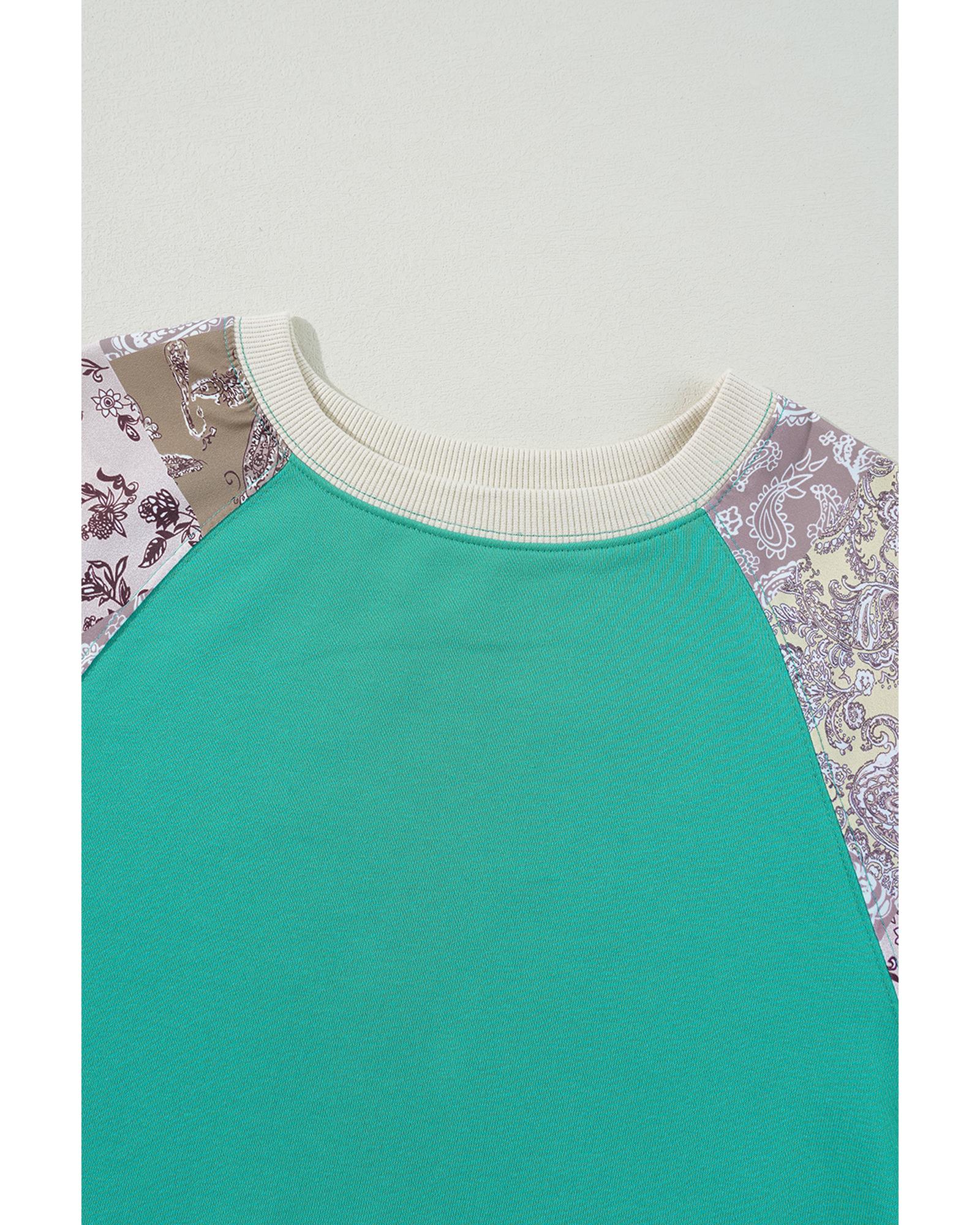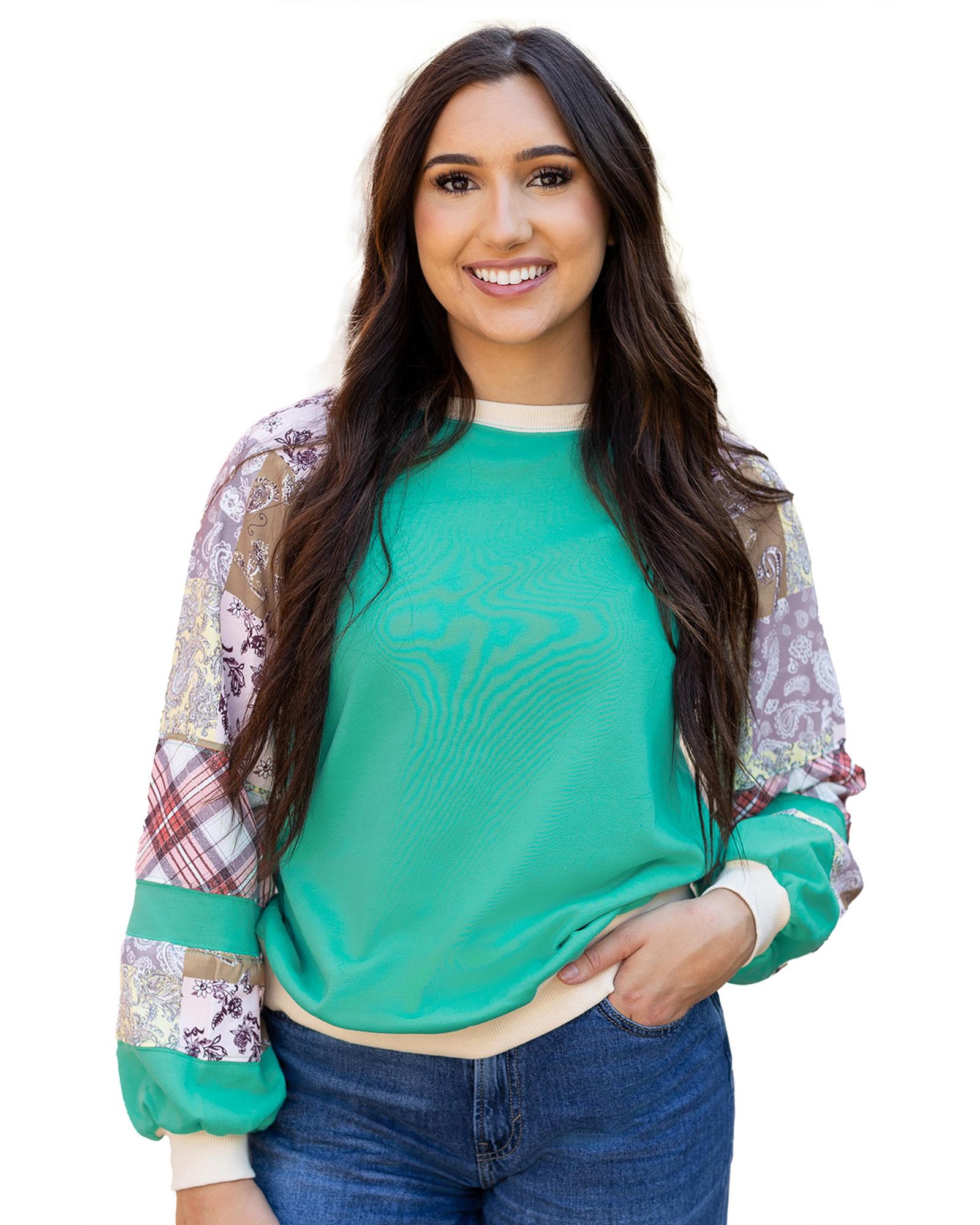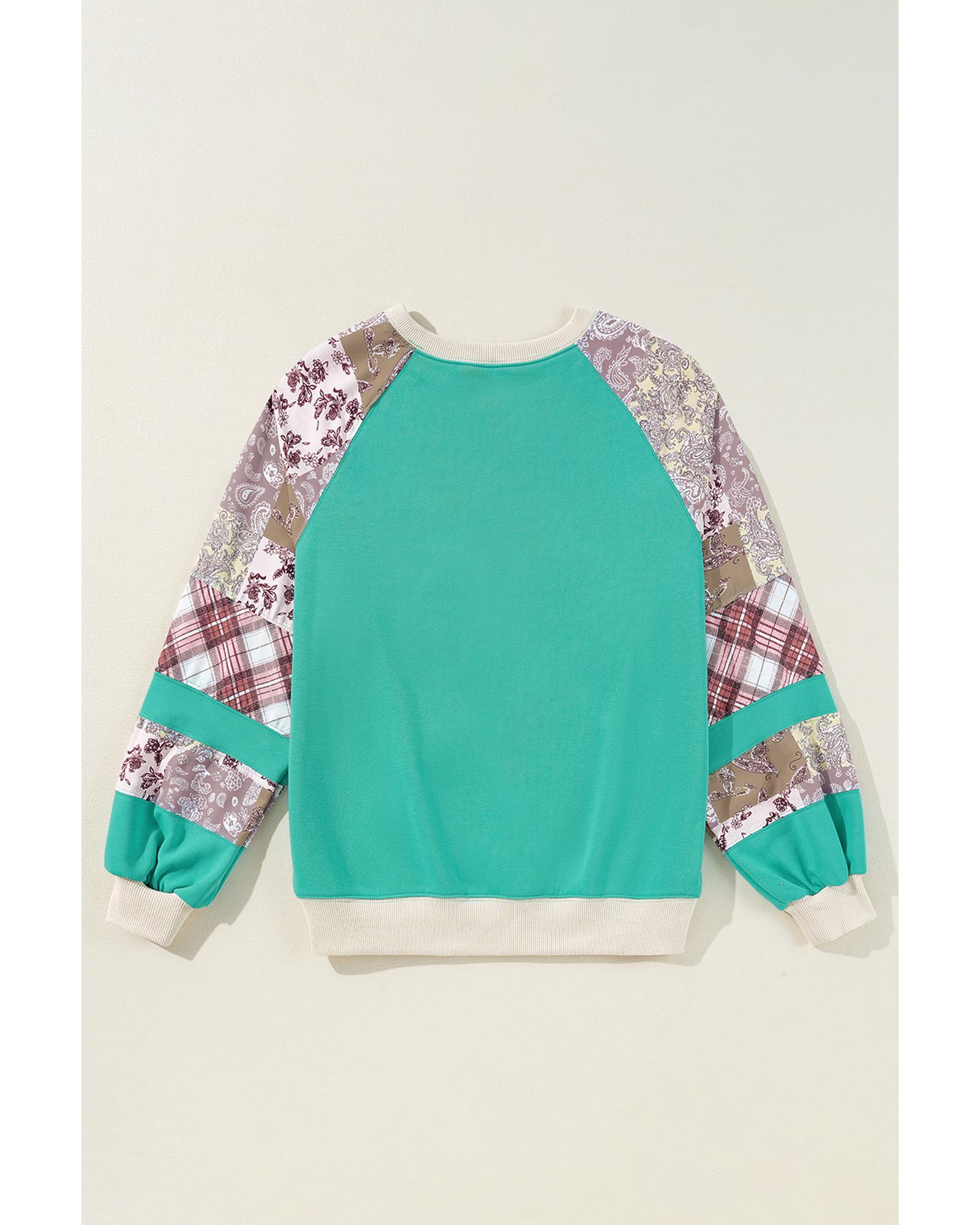 Aruba Blue Plaid Vintage Paisley Patchwork Long Sleeve Raglan Top – L