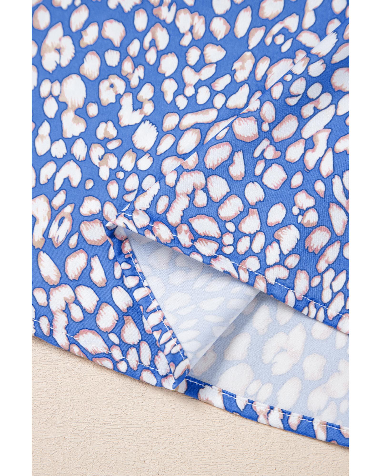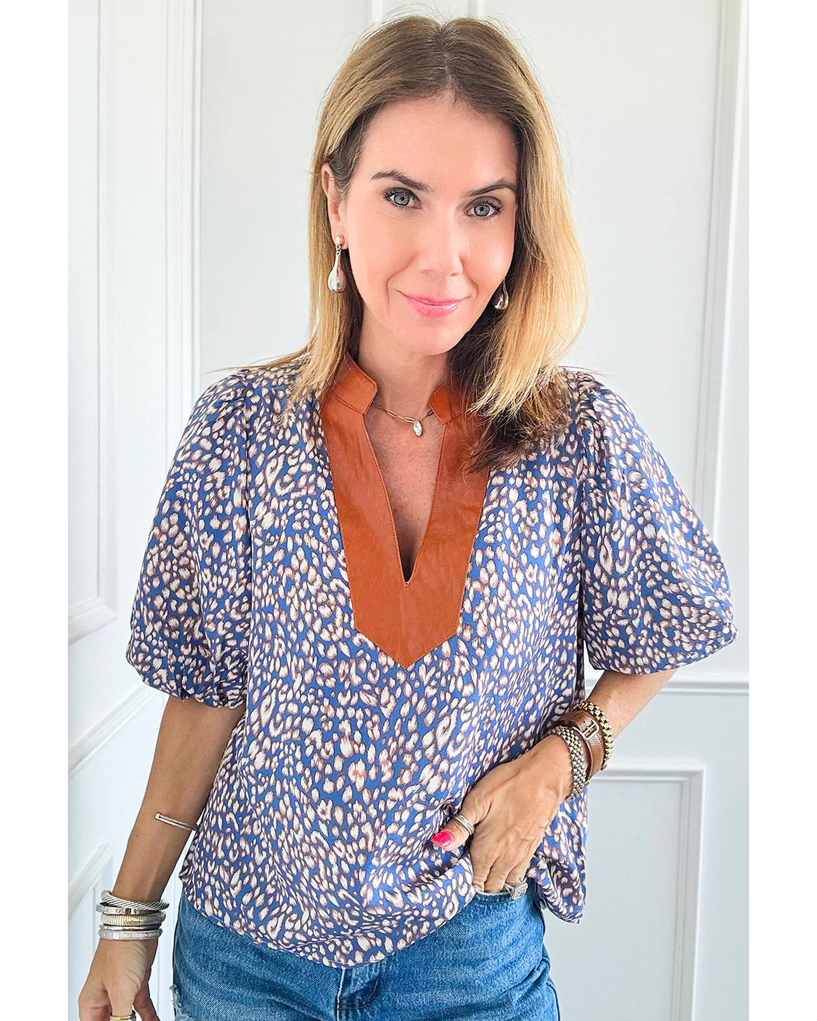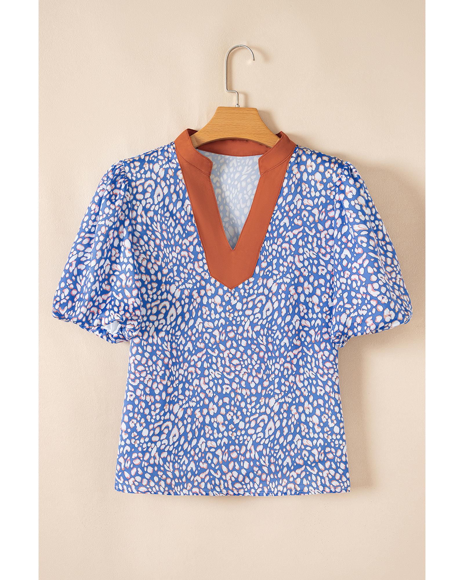 - Ashleigh Blue Leopard Print Spot Contrast V Neck Half Puff Sleeve Shirt