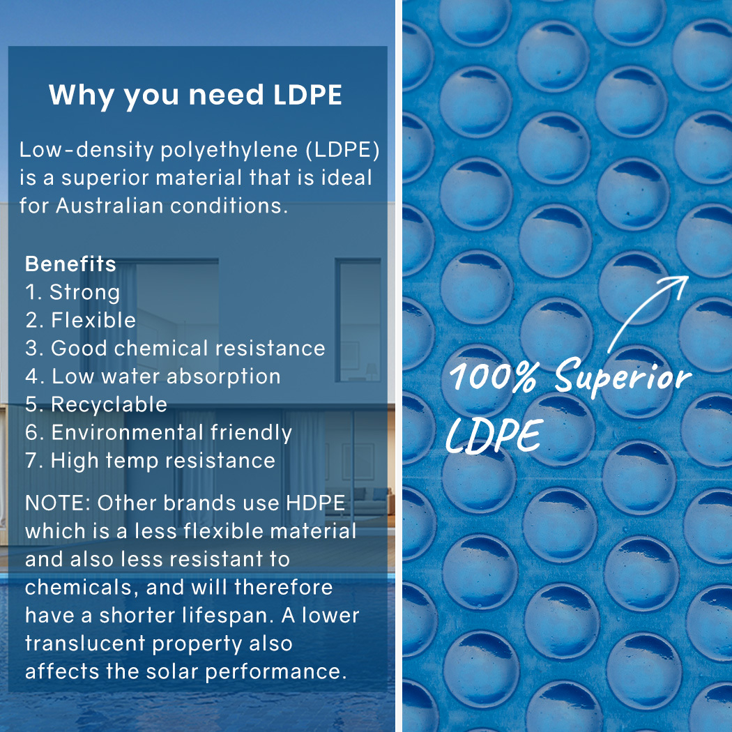 Low-density polyethylene (LDPE) is preferred for Australian conditions due to its durability, flexibility, and high-temperature resistance. Some other brands use HDPE, which is less flexible, less chemical-resistant, and has lower translucency, leading to a shorter lifespan and reduced solar performance.