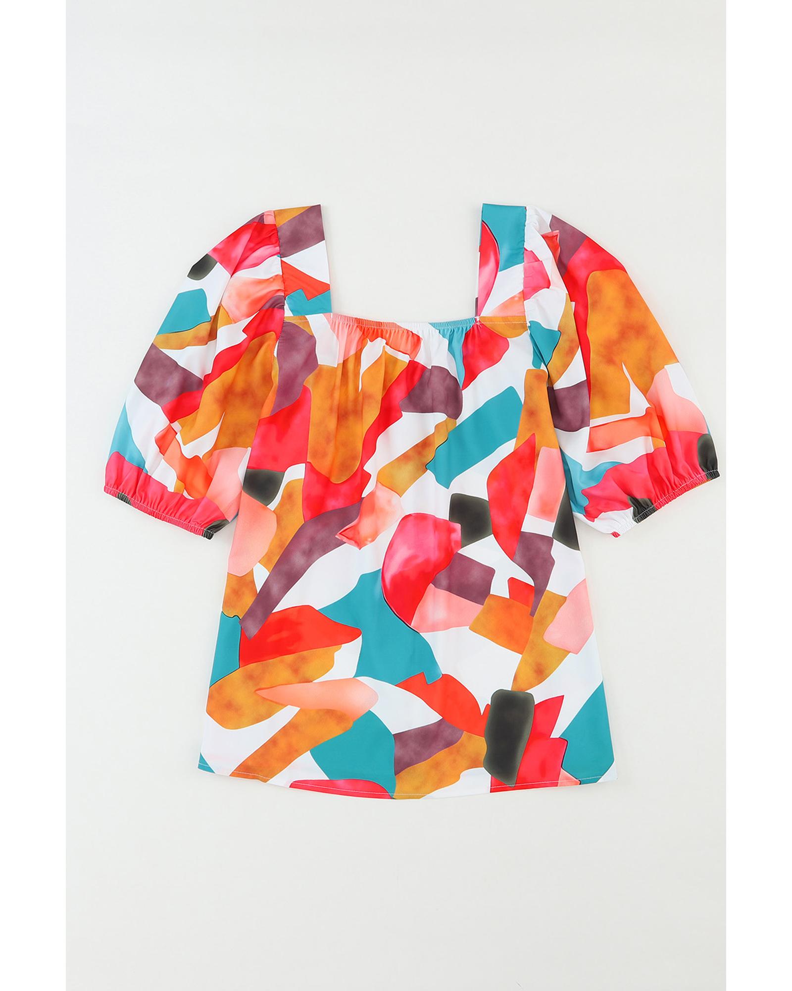 • Multicolor Square Neck Abstract Print Short Sleeve Blouse