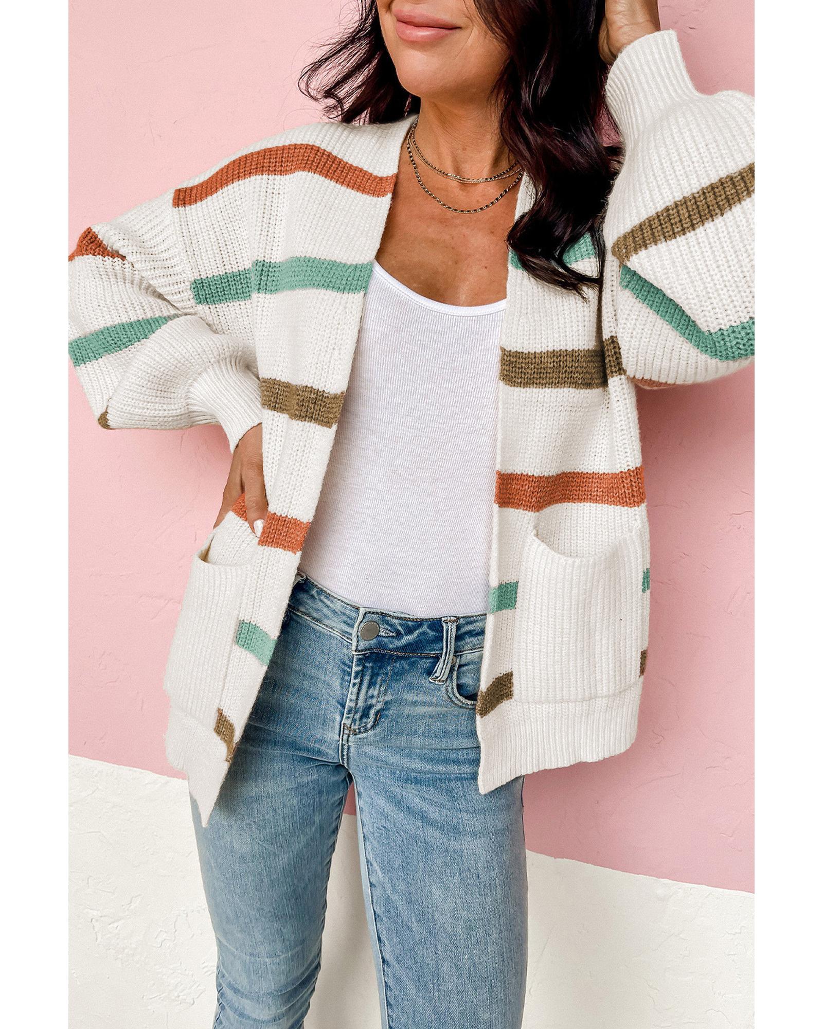 Azura Exchange Beige Drop Shoulder Pocketed Stripe Sweater Cardigan – S