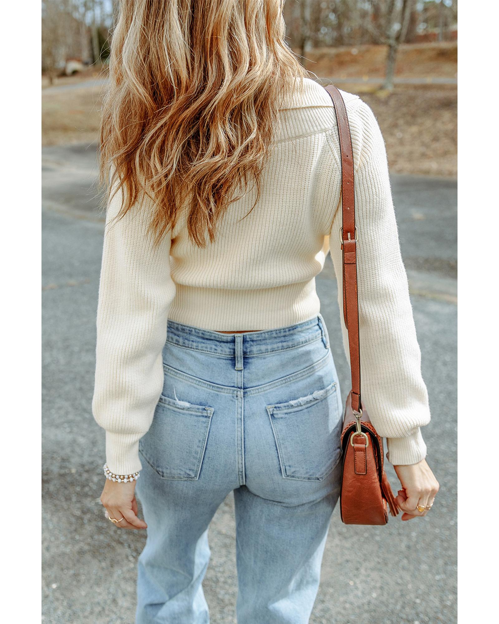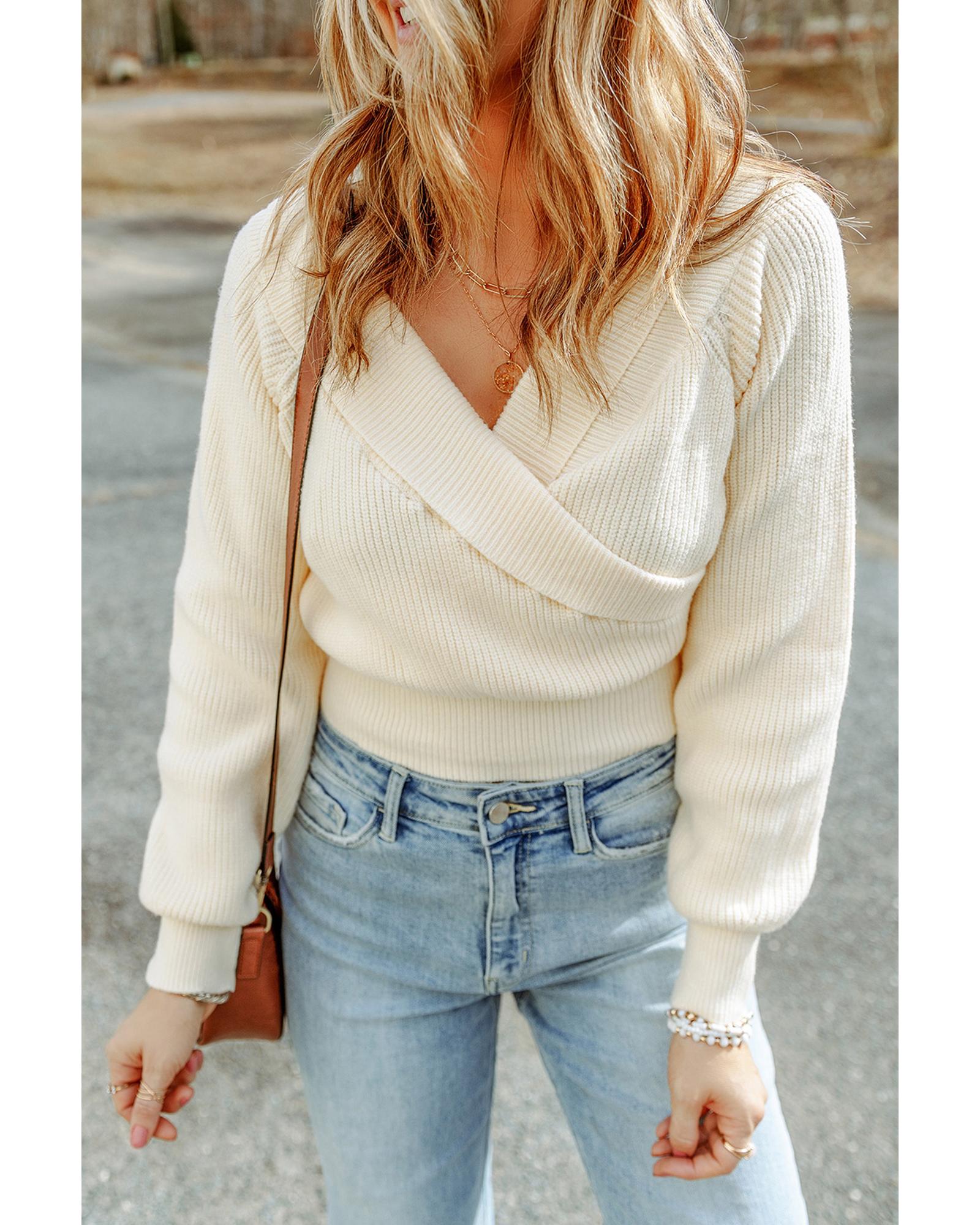 Azura Exchange Beige Ribbed Long Sleeve Surplice Crop Sweater – L