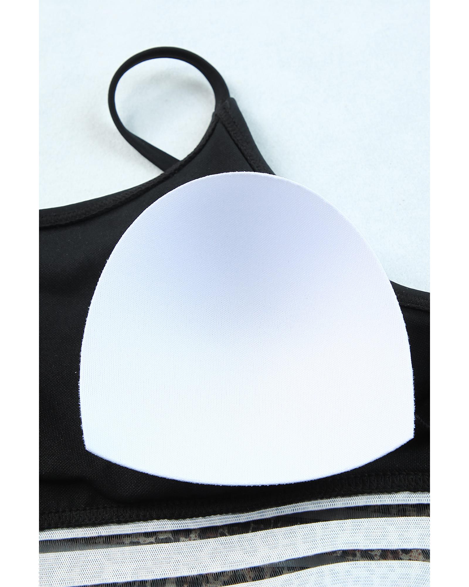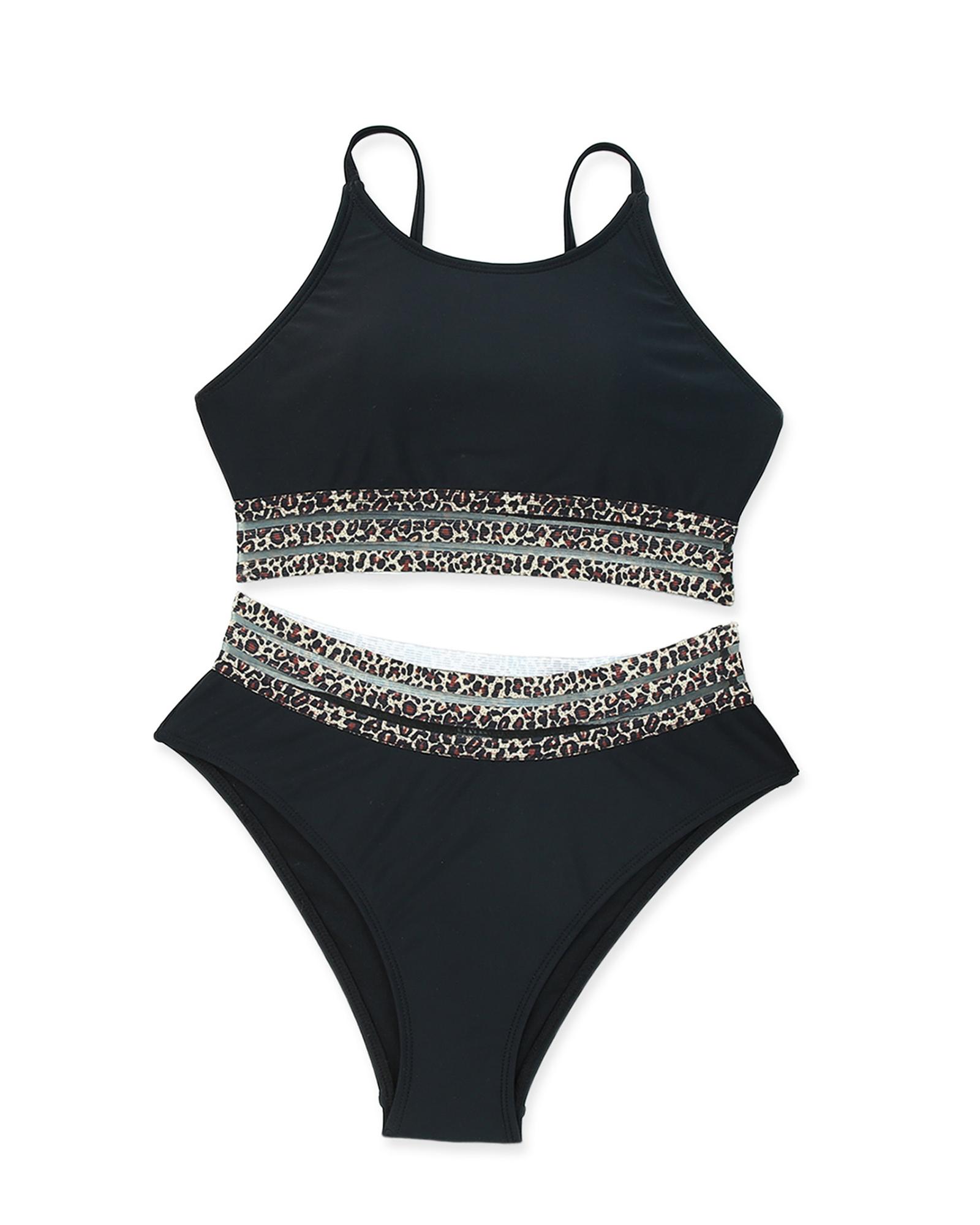 • piece bikini set characterized by leopard mesh trim