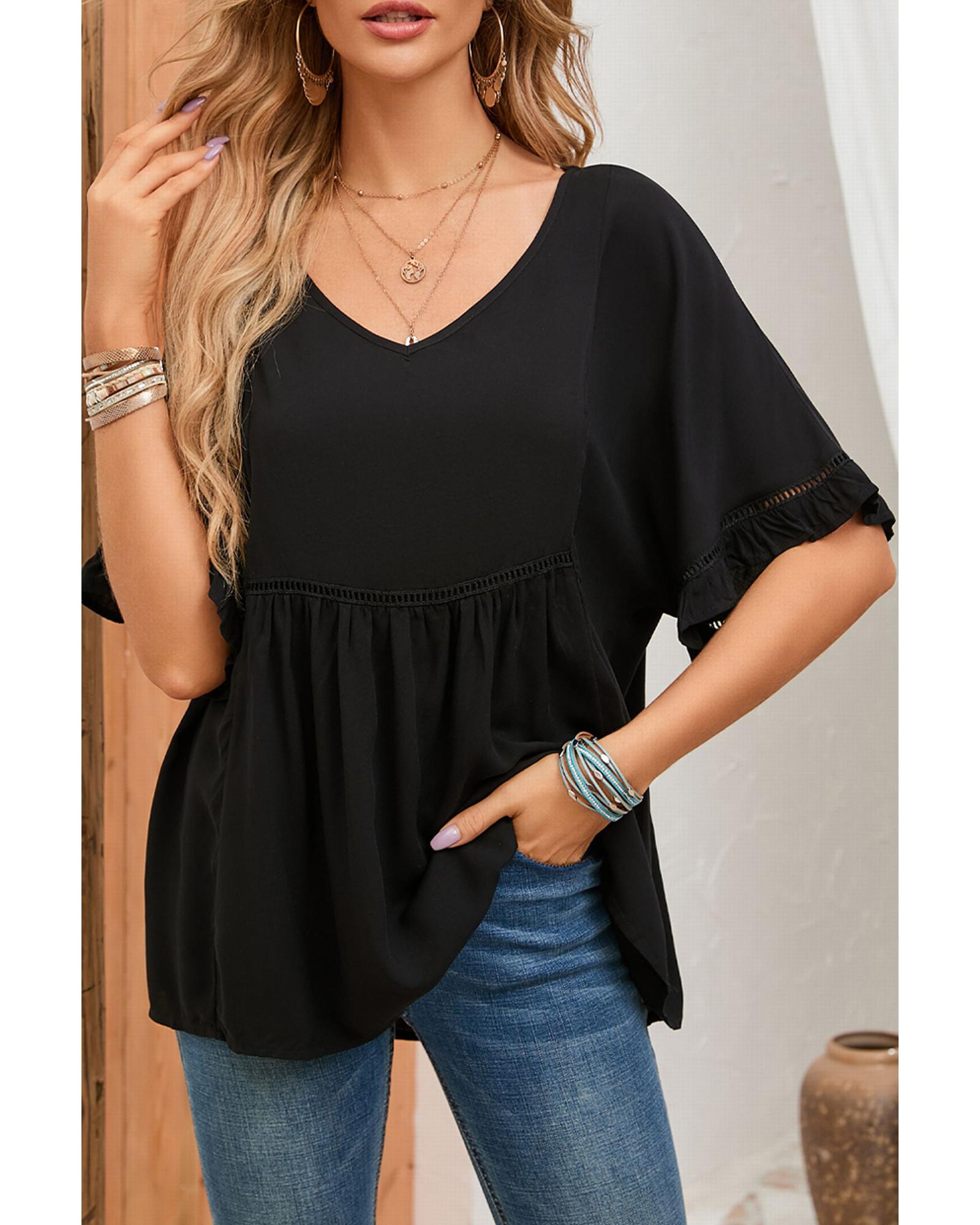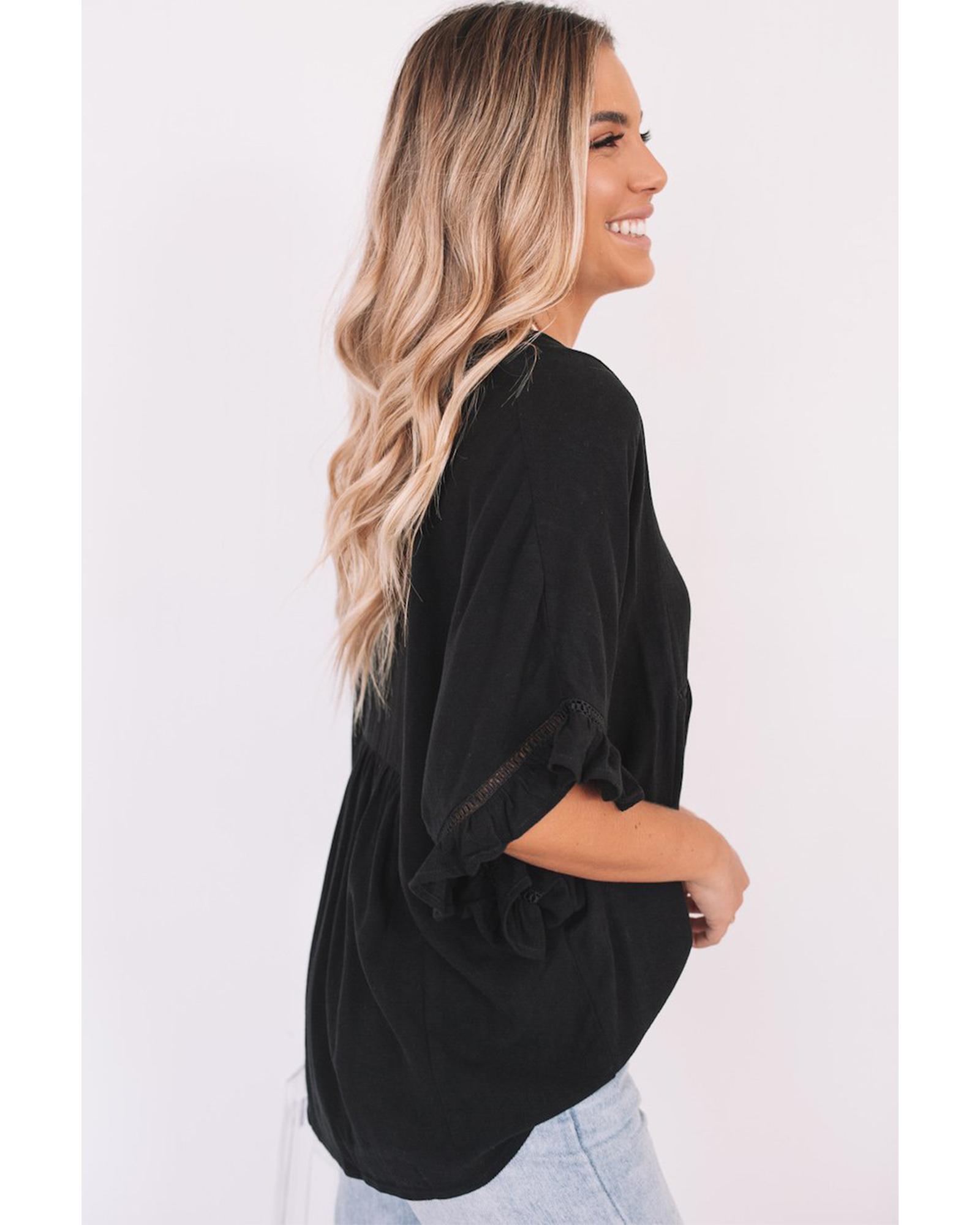Azura Exchange Black Ruffled Lace Detail Loose V Neck Top – S