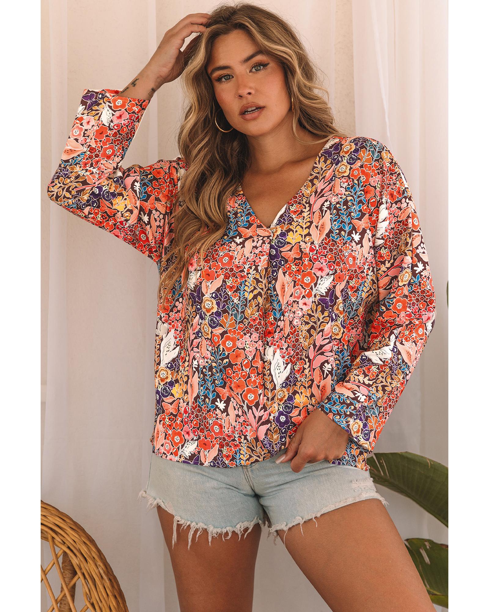 • Multicolor Boho Floral Long Sleeve V-Neck Blouse