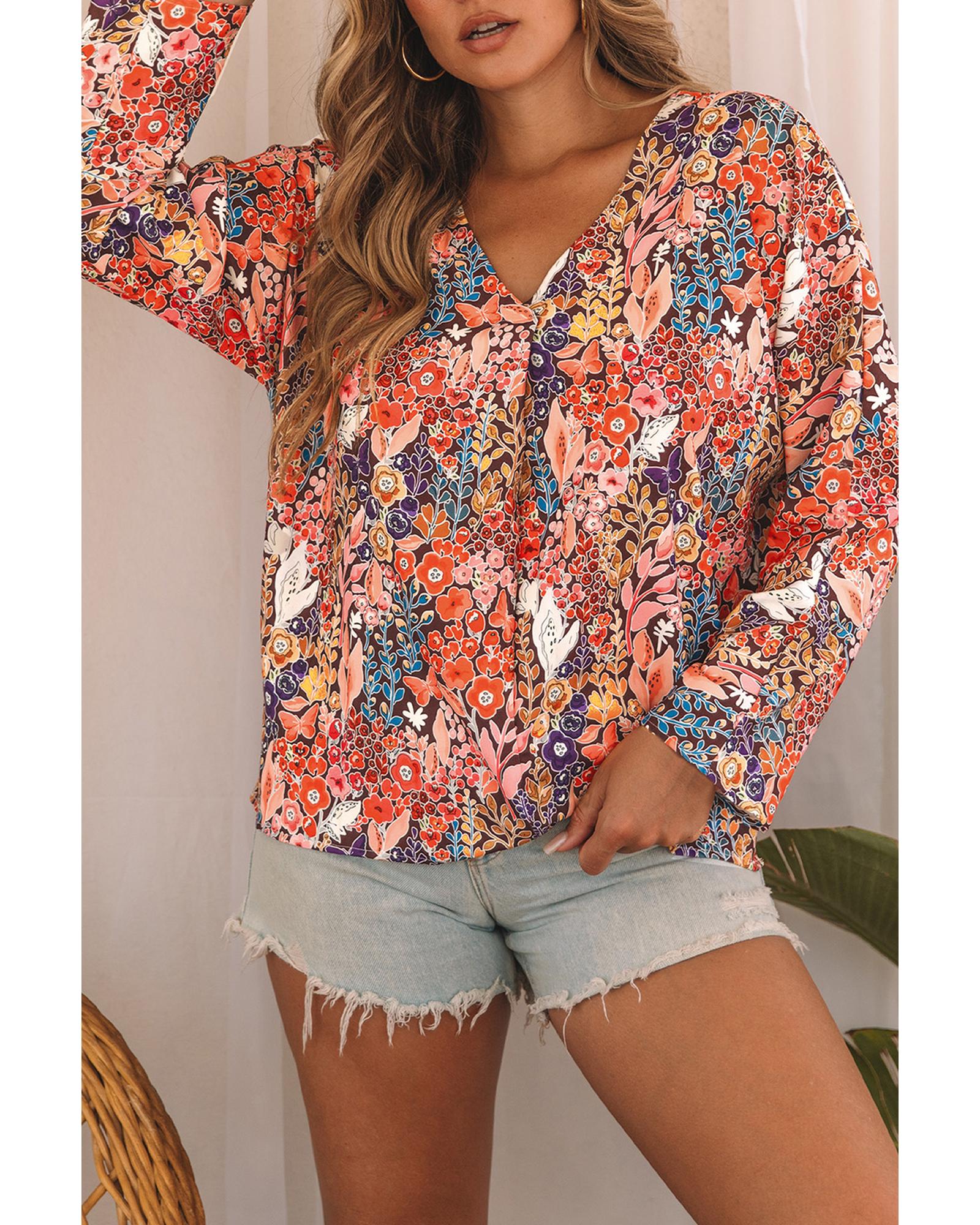 • Multicolor Boho Floral Long Sleeve V-Neck Blouse