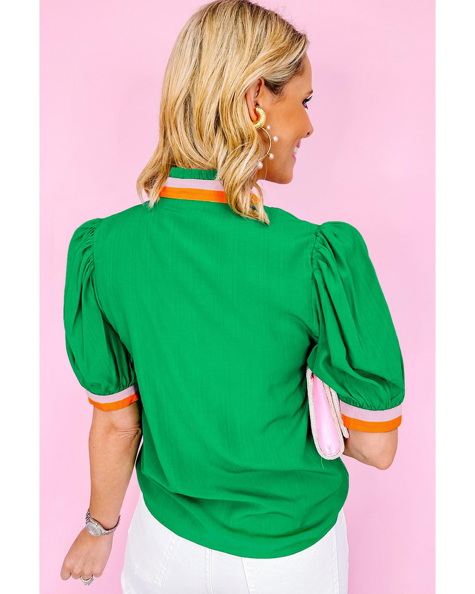 Azura Exchange Bright Green Colorful Trim V Neck Short Sleeve Blouse – M