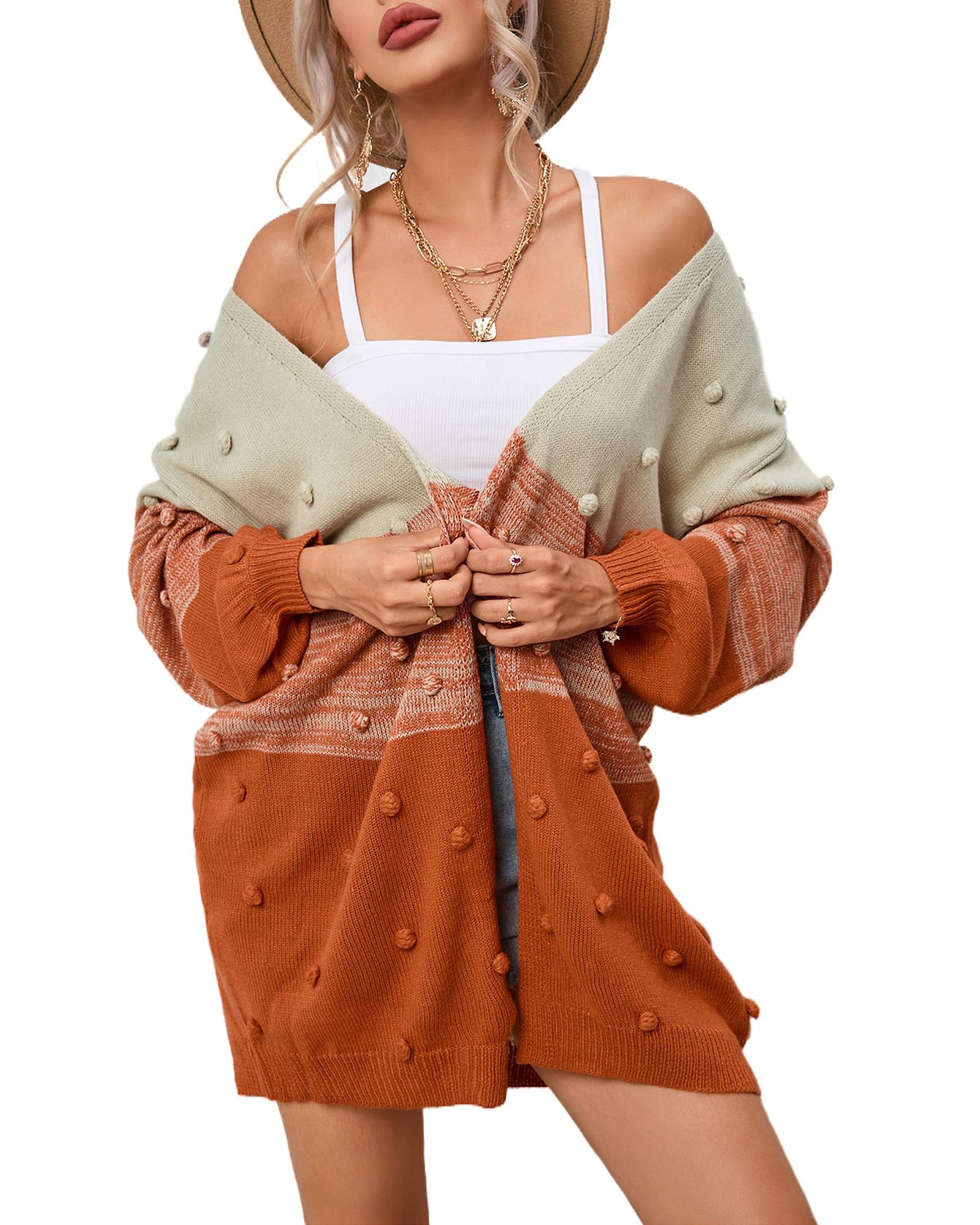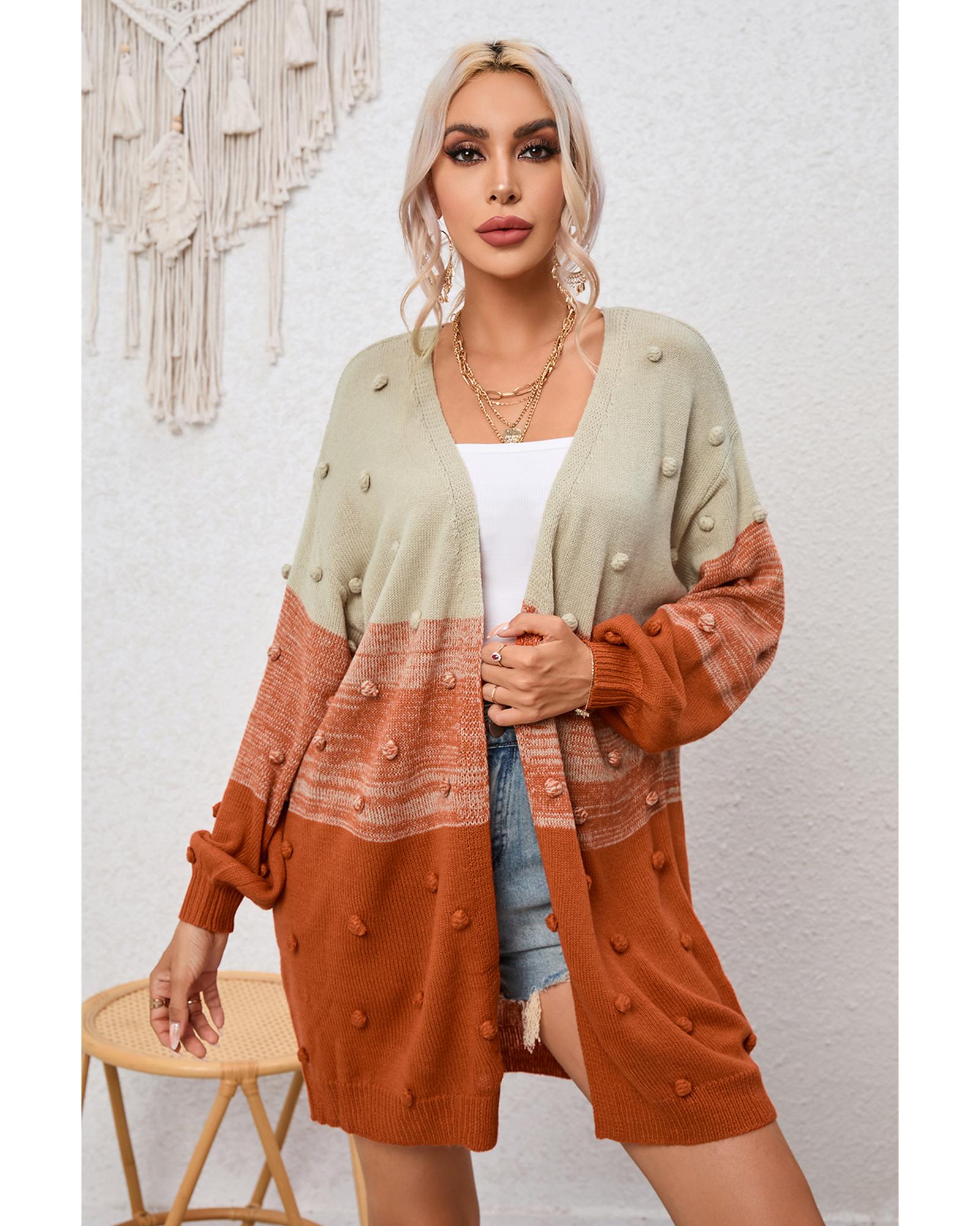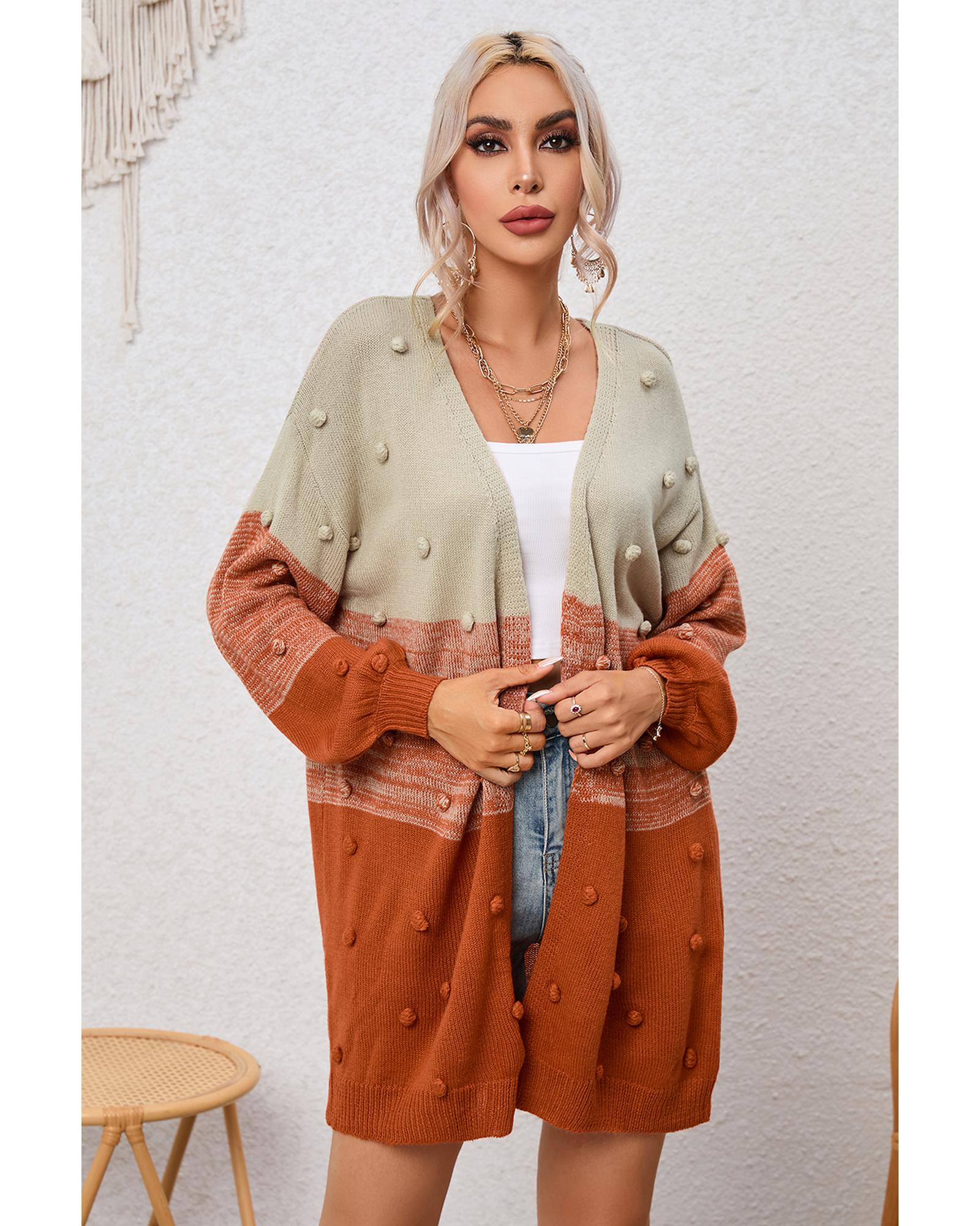 Azura Exchange Brown Pompom Color Block Open Front Cardigan – L