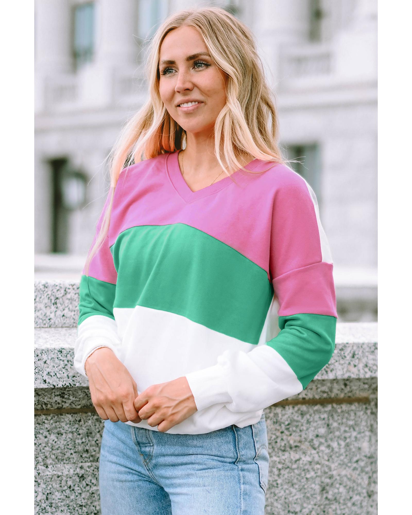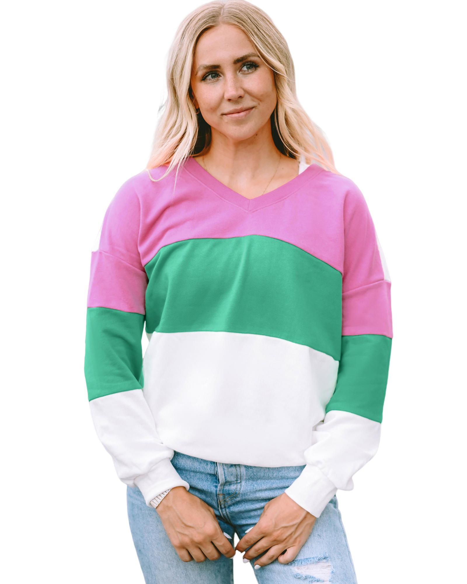 - Ribbed V Neck Color Block Patchwork Sweatshirt