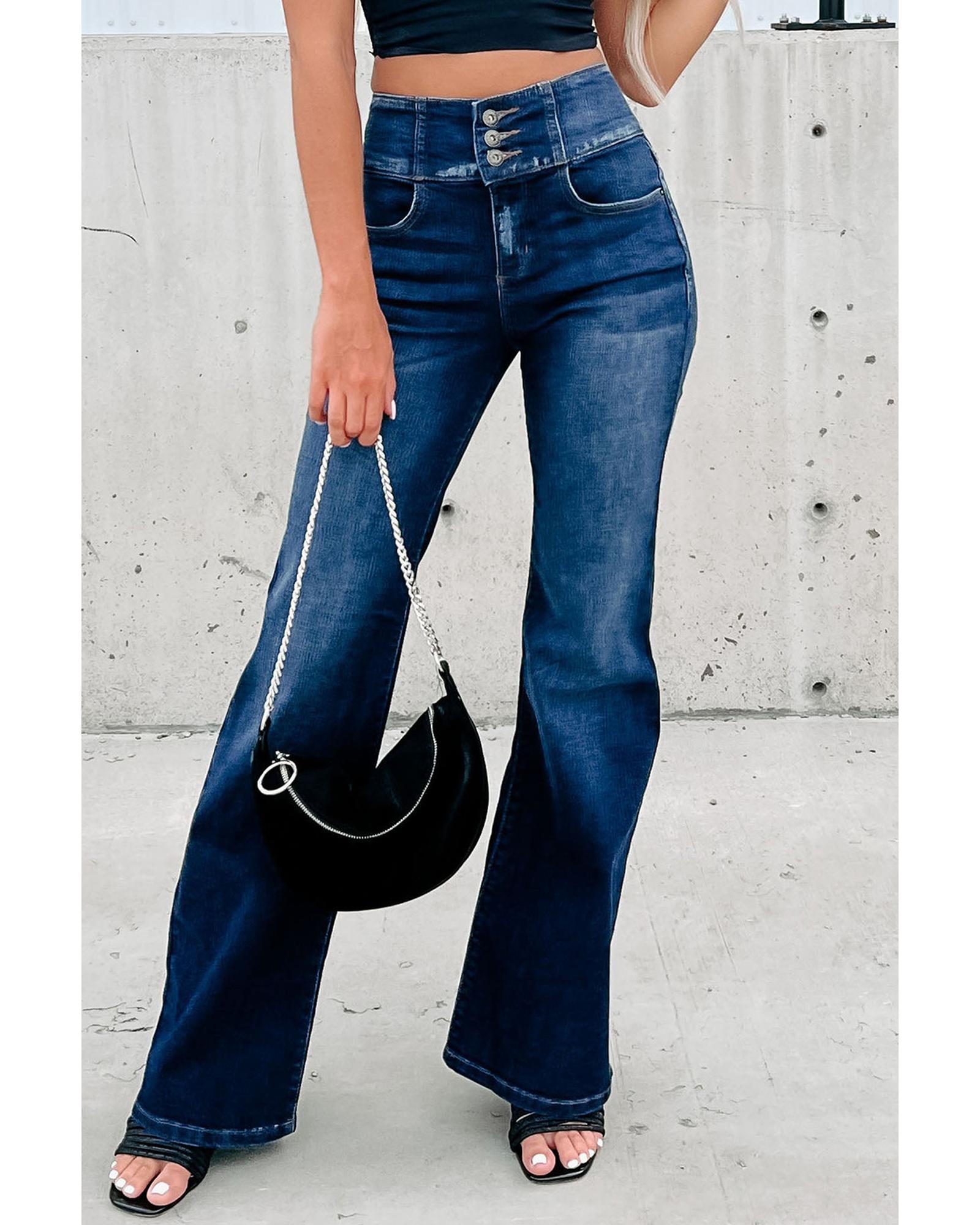 • Womens Buttons Elastic Wide Waistband Back Flare Jeans