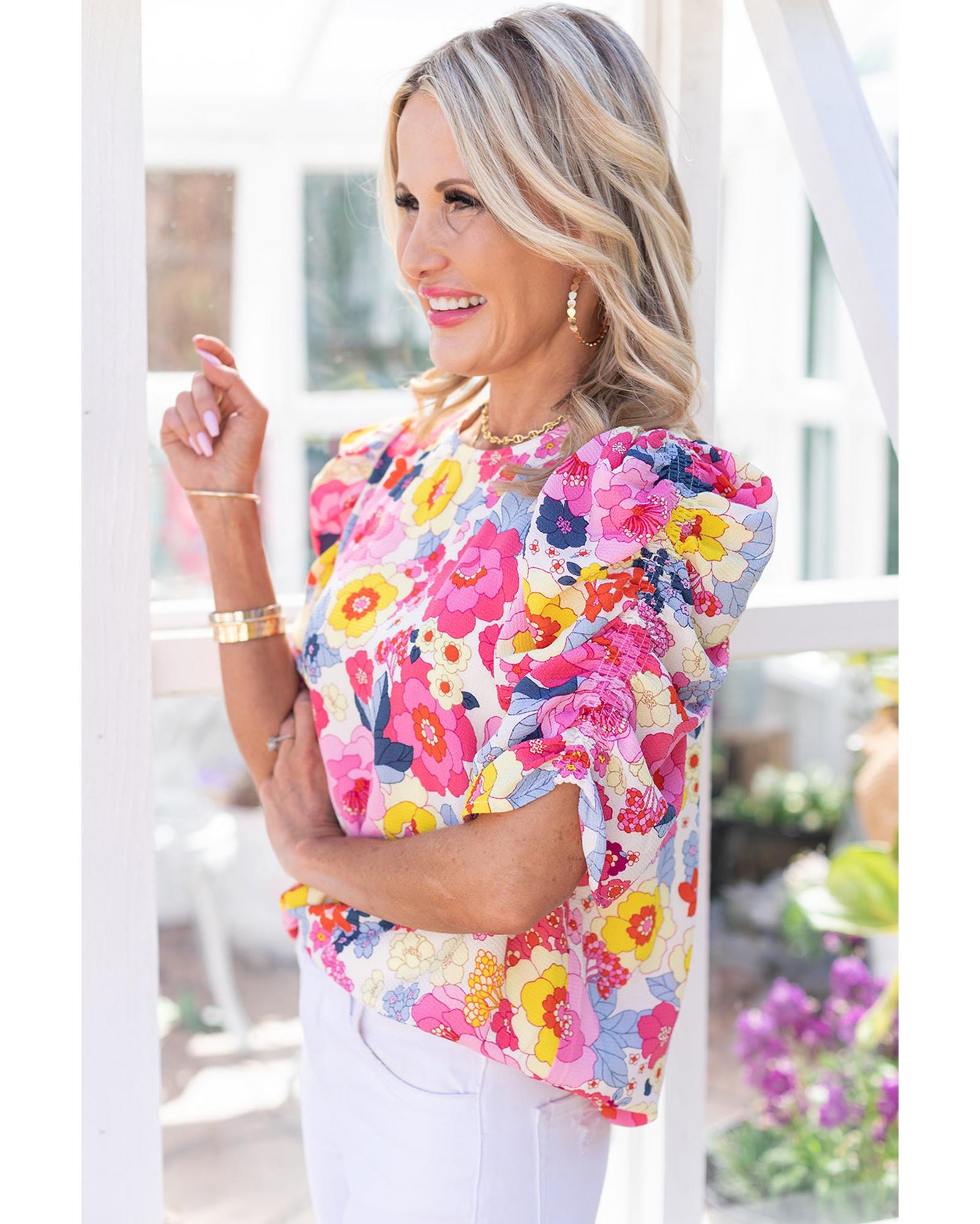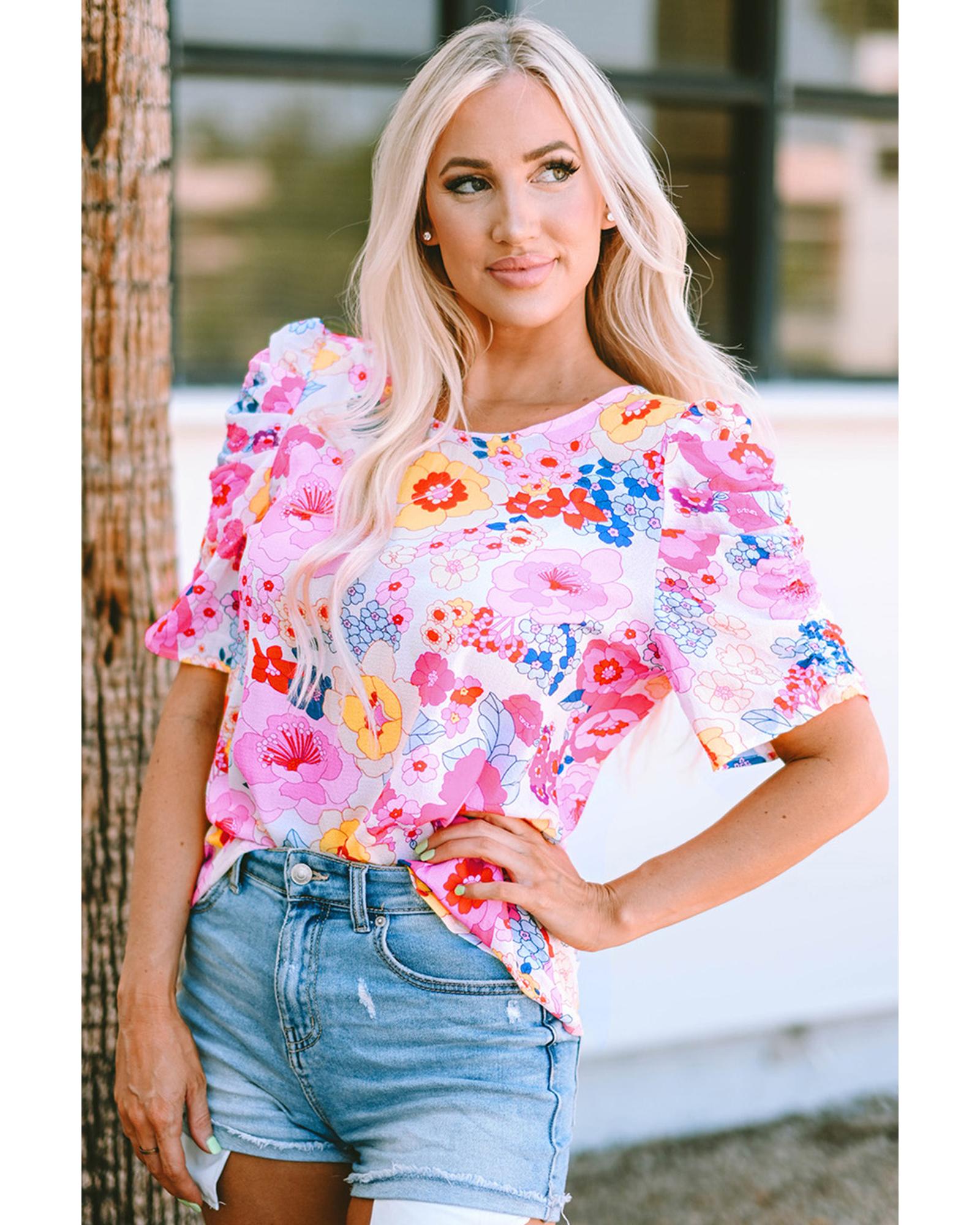 • Luxurious Ruched Puff Sleeve Floral Blouse