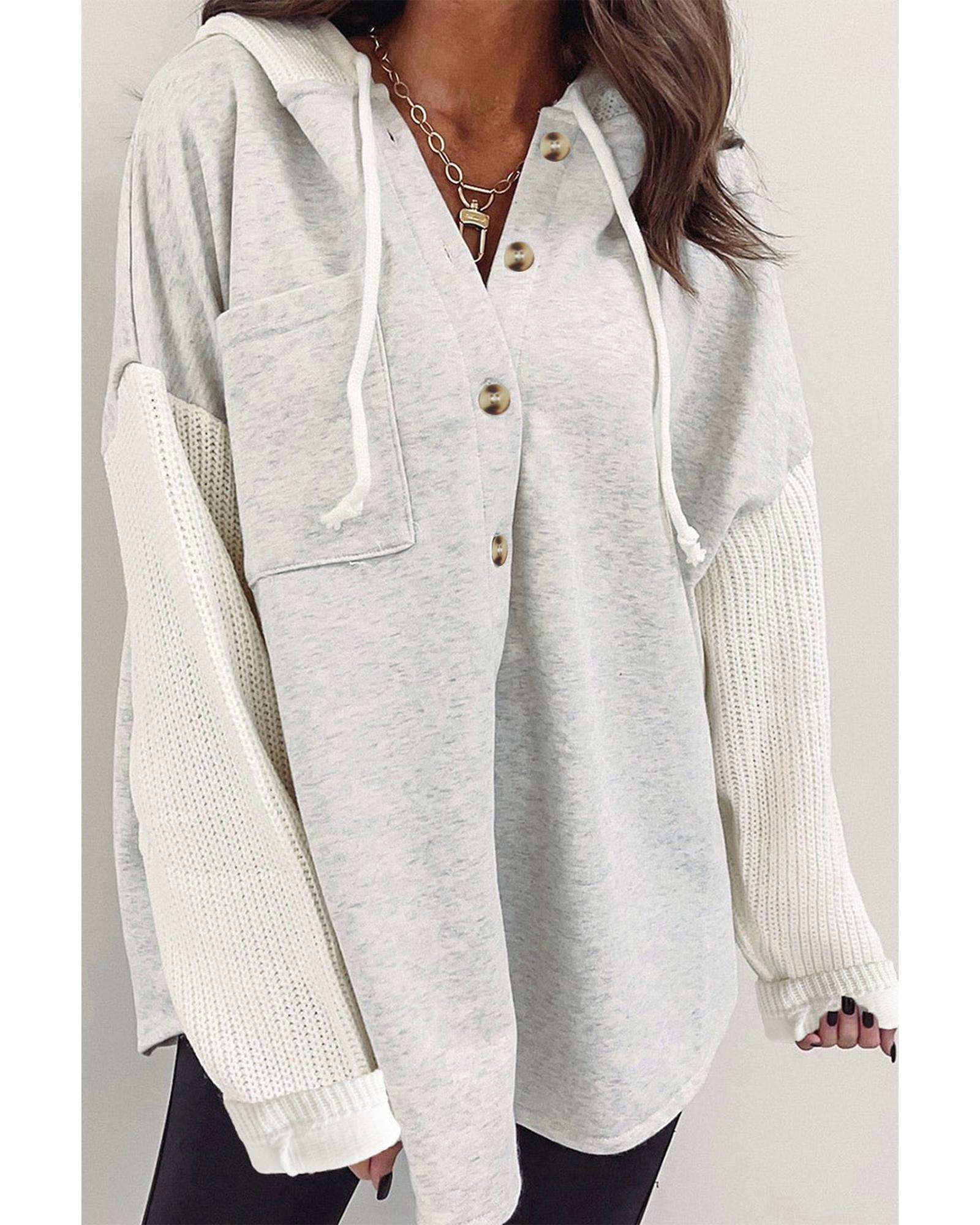 - Stay cozy and stylish with our Gray Button Up Contrast Knitted Sleeves Hooded Jacket