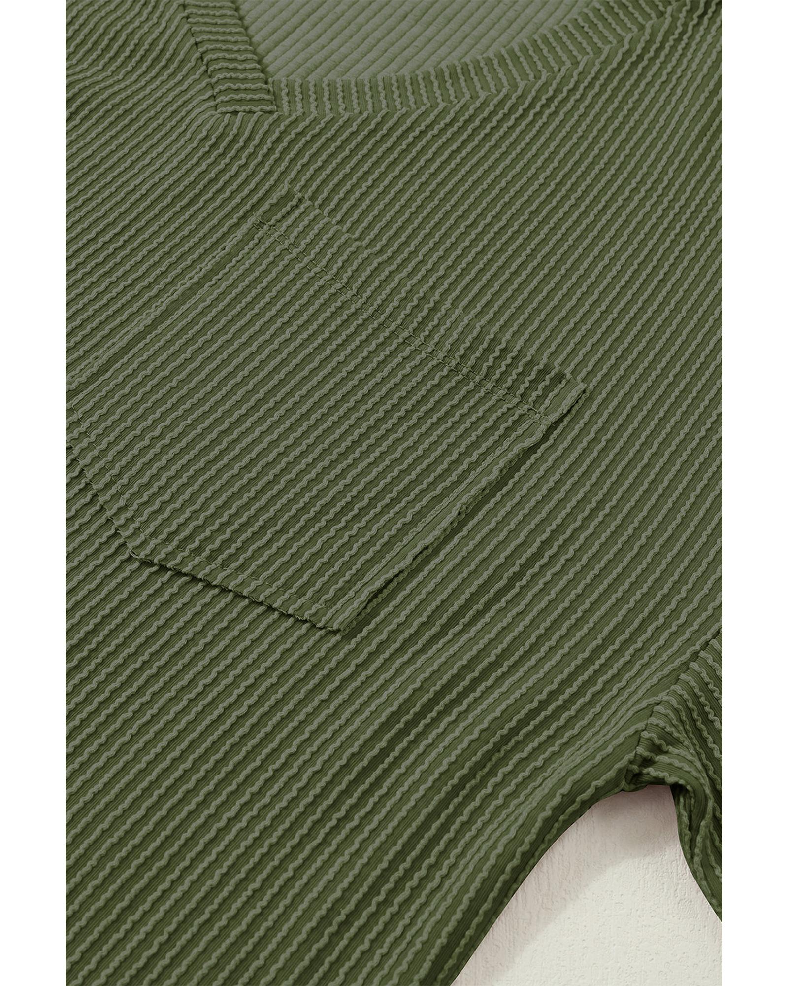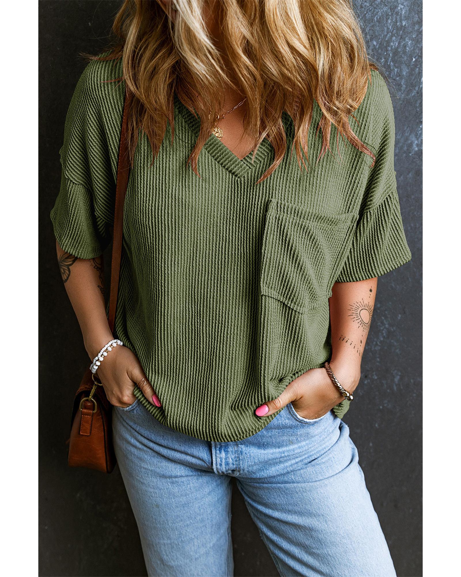 - Jungle Green Corded V Neck Chest Pocket Loose T