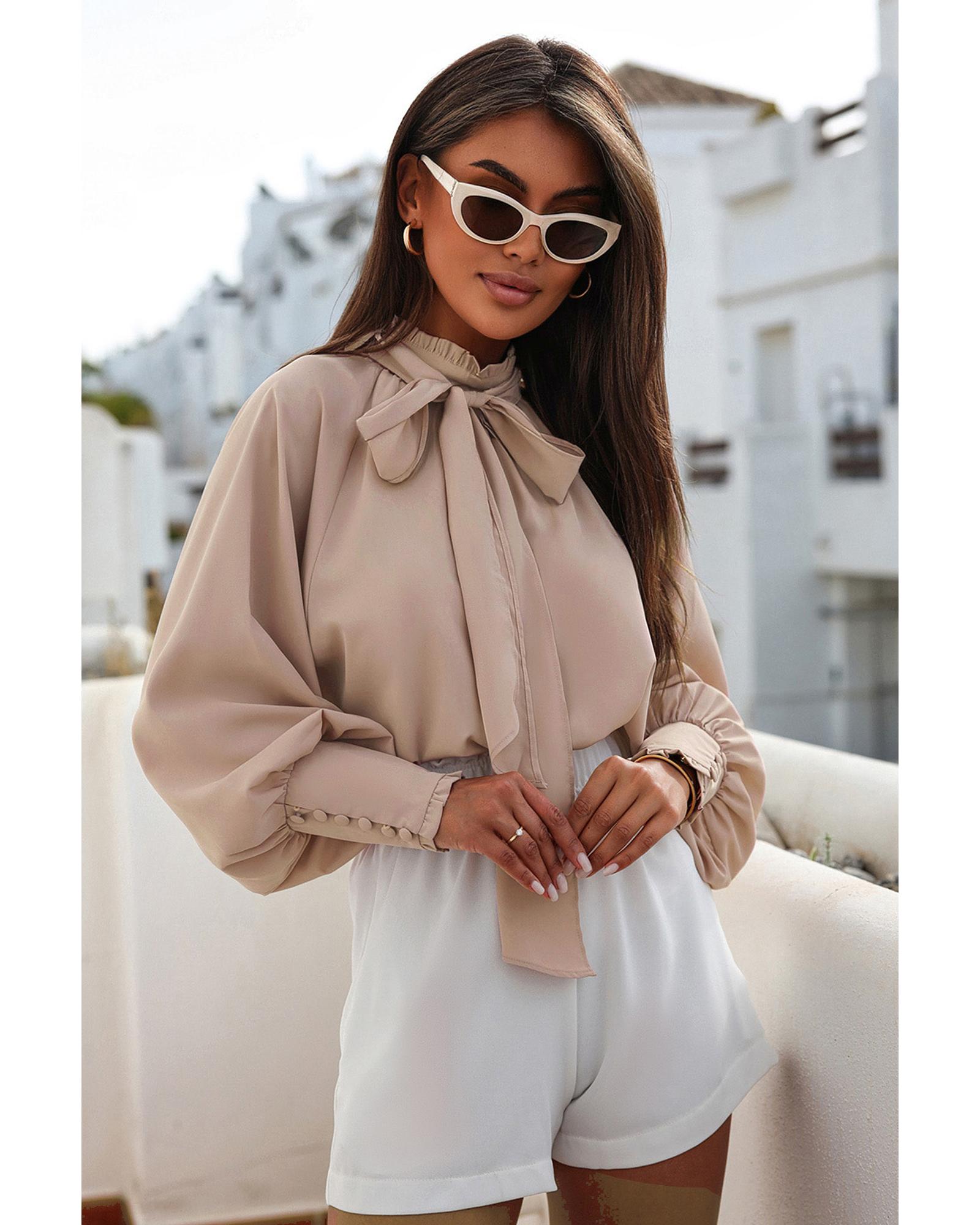 Azura Exchange Khaki Frilled Knotted Blouse with Bishop Sleeves – XL