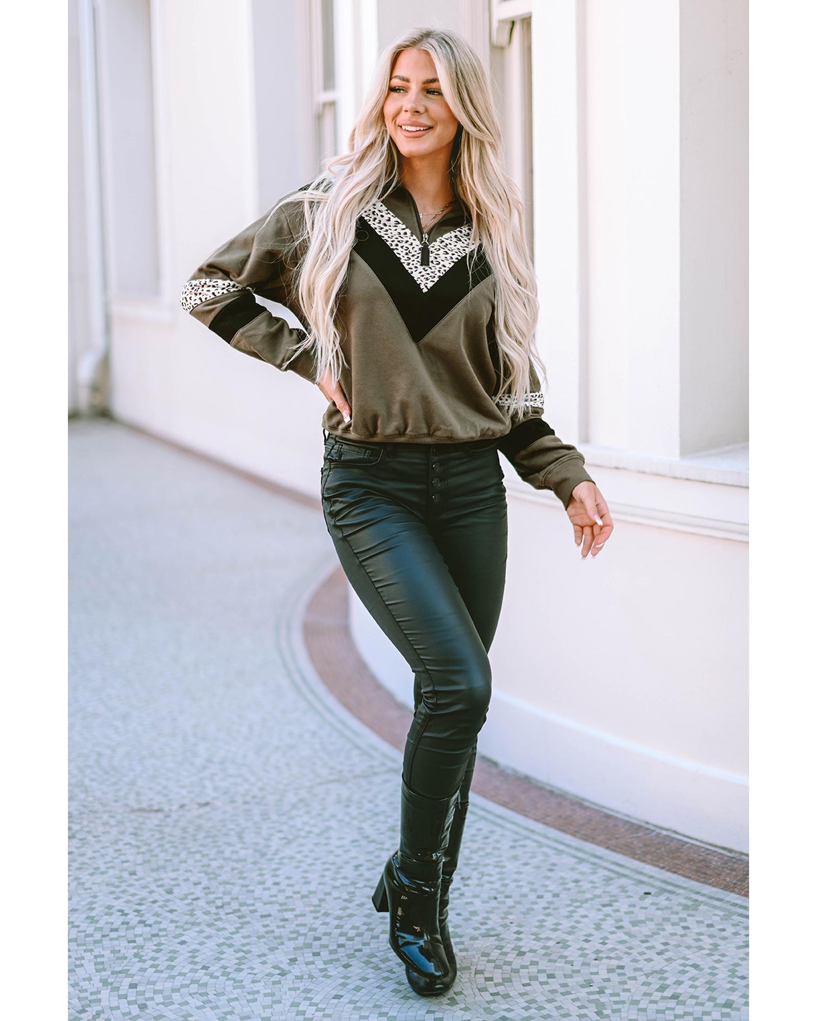 - Green Leopard Contrast Splicing Quarter Zip Sweatshirt