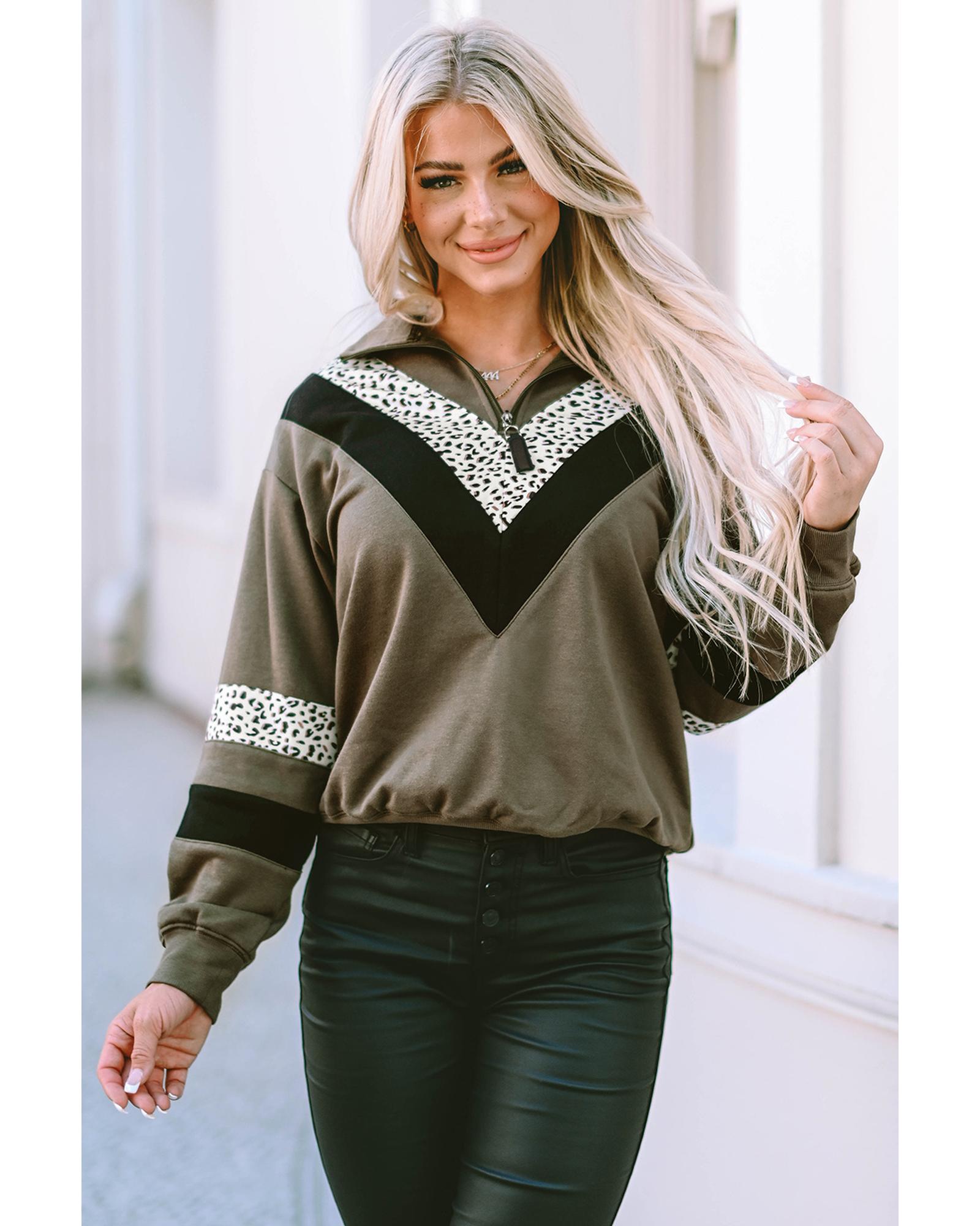 Azura Exchange Leopard Contrast Splicing Quarter Zip Sweatshirt – S
