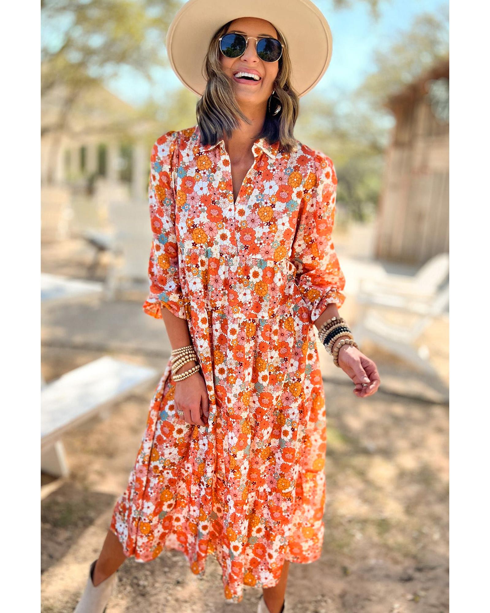 Azura Exchange Multicolor Boho Floral Collared Long Sleeve Ruffled Dress – S