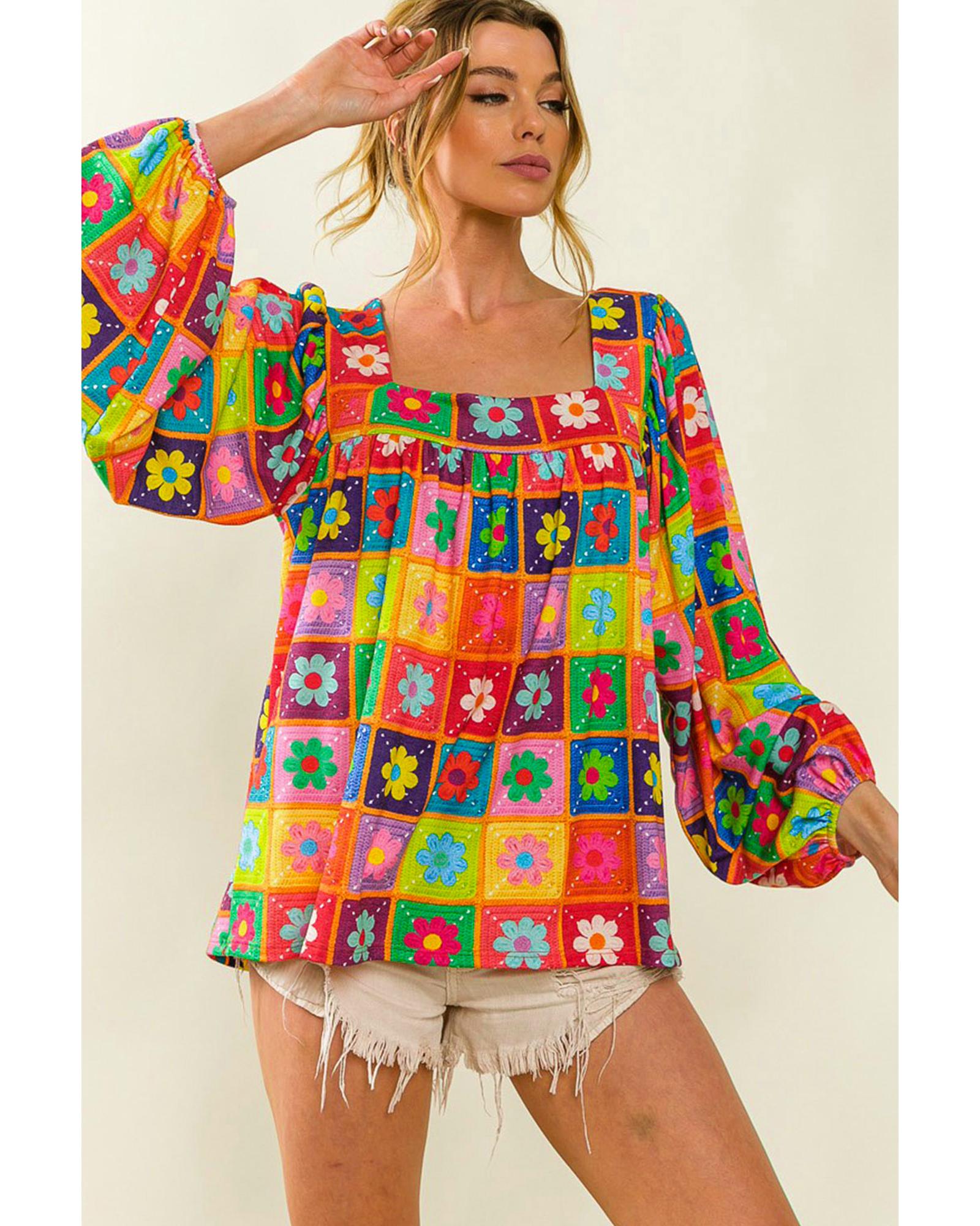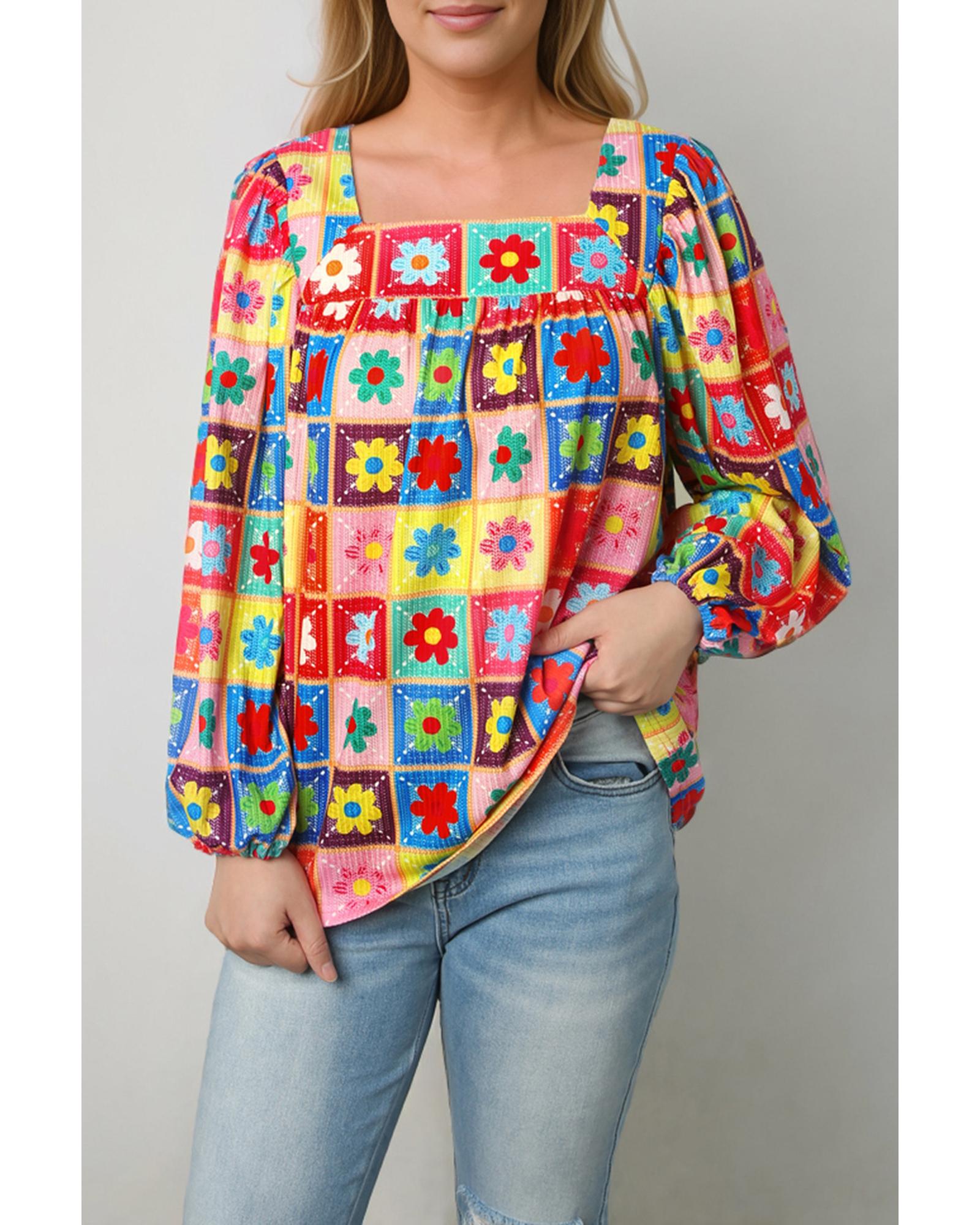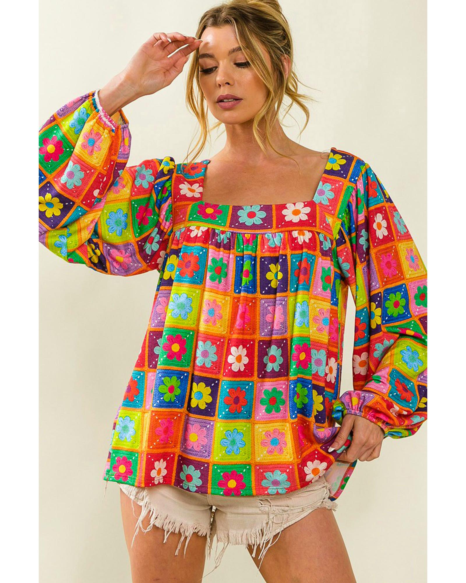 Azura Exchange Multicolor Floral Crochet Square Neck Puff Sleeve Blouse – M