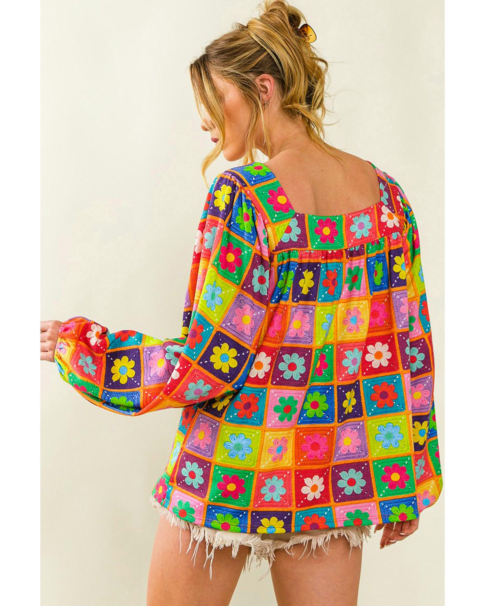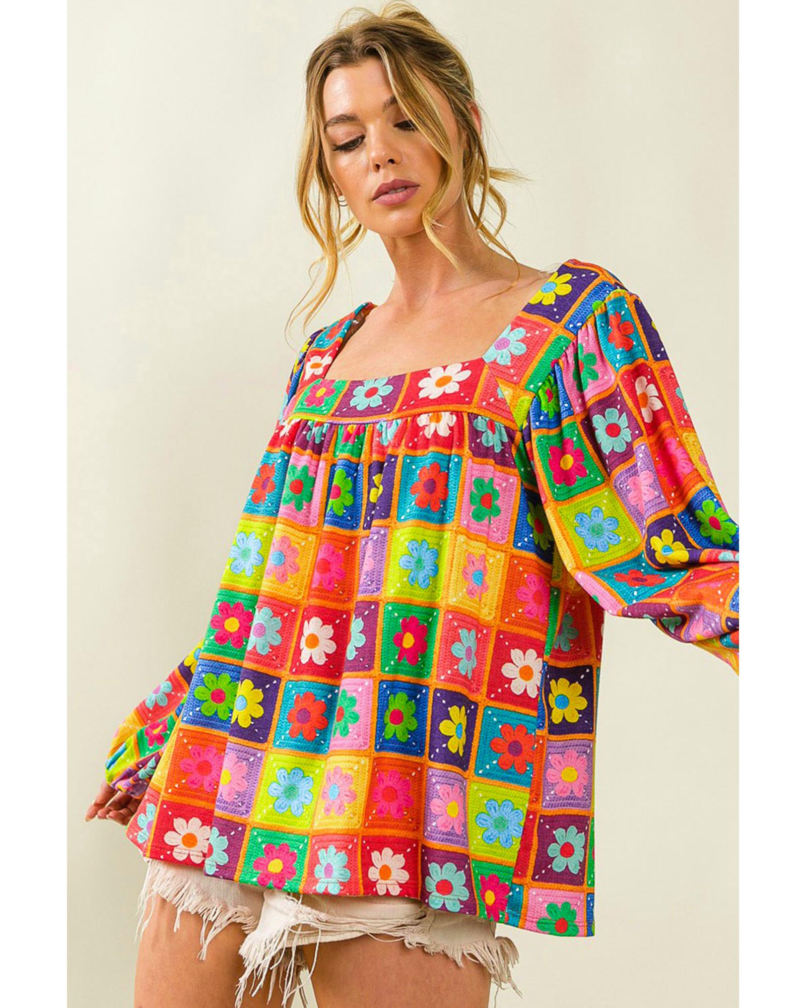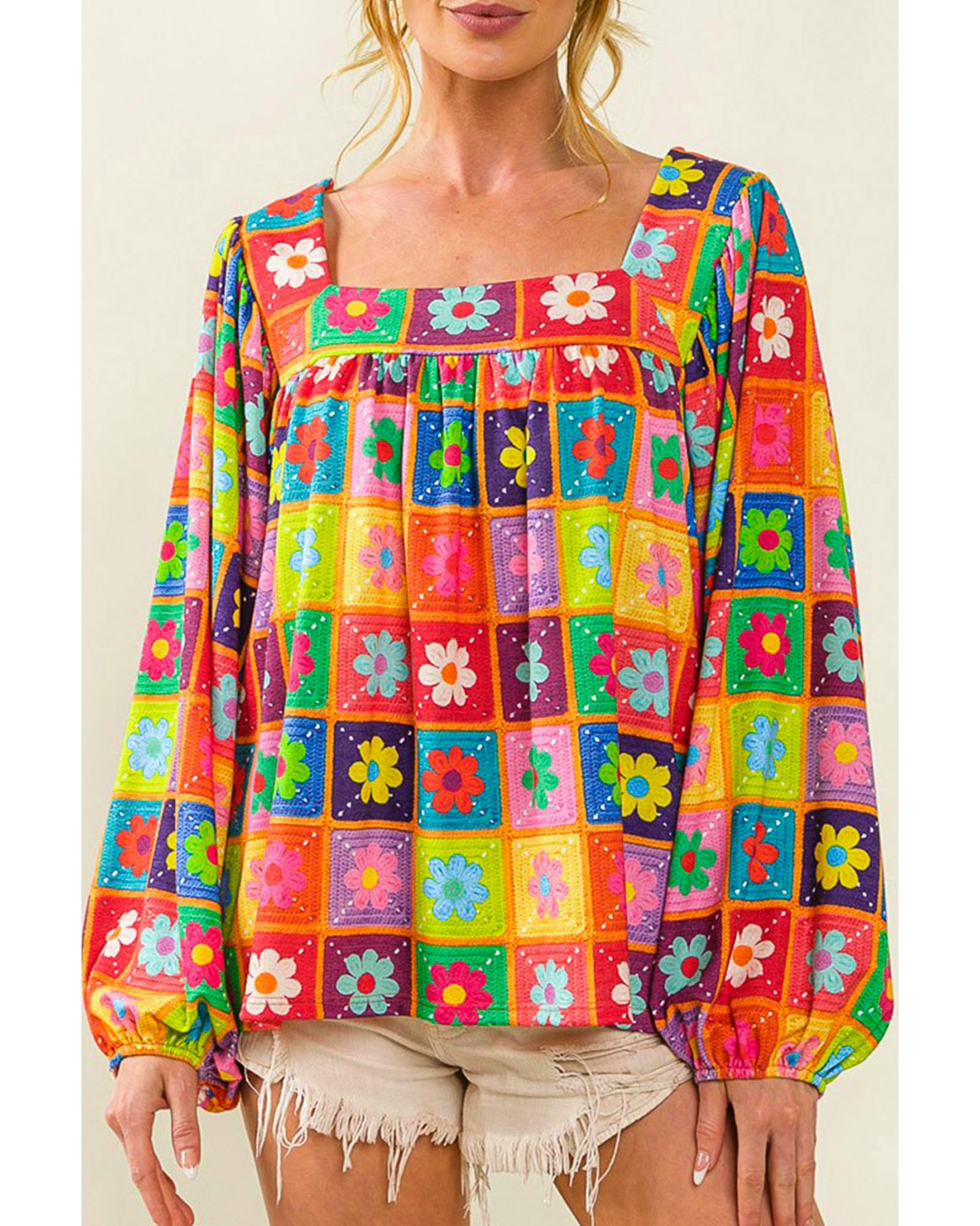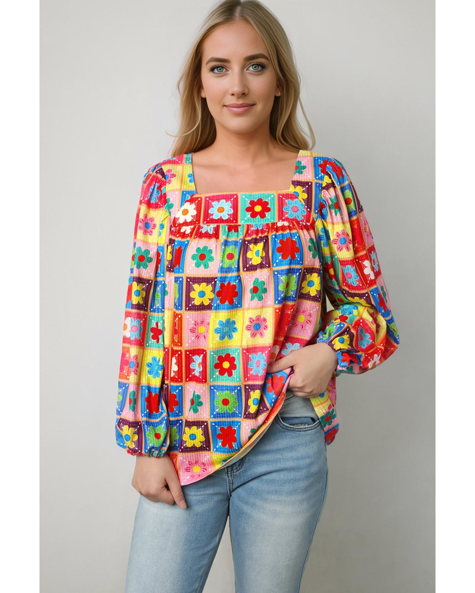 Azura Exchange Multicolor Floral Crochet Square Neck Puff Sleeve Blouse – M