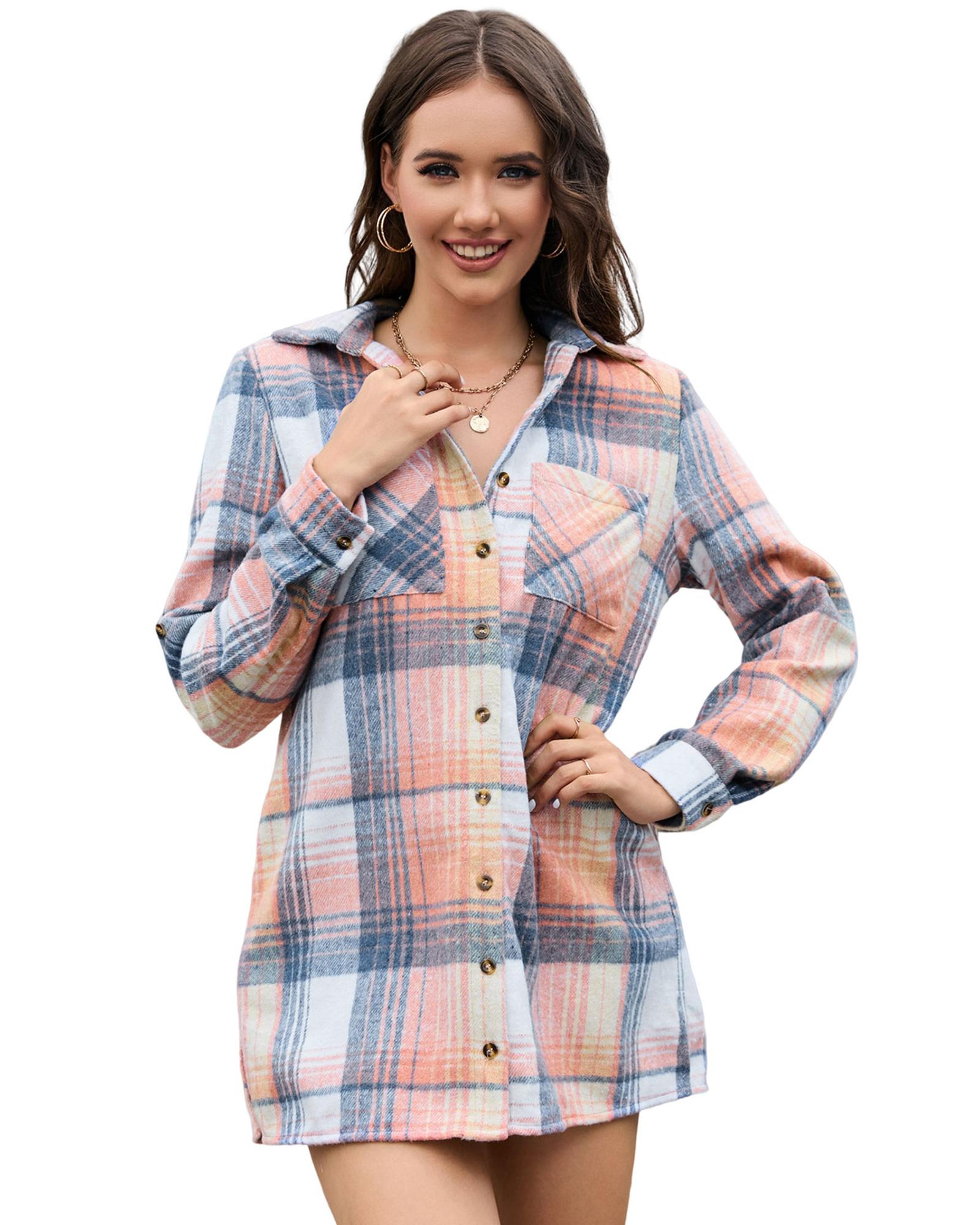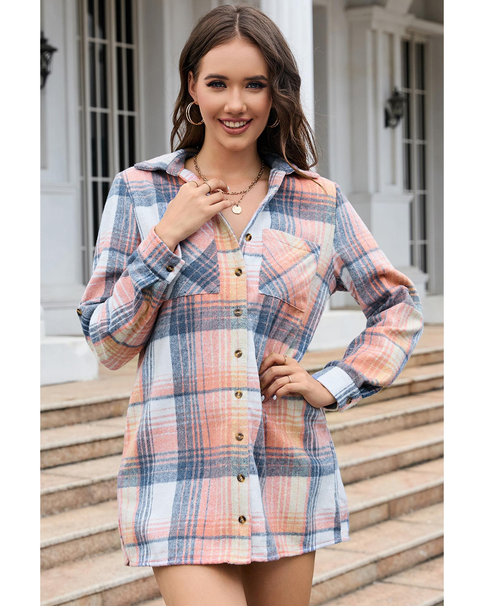 Azura Exchange Pink Plaid Roll-tab Sleeve Side Slit Shirt Dress - XL