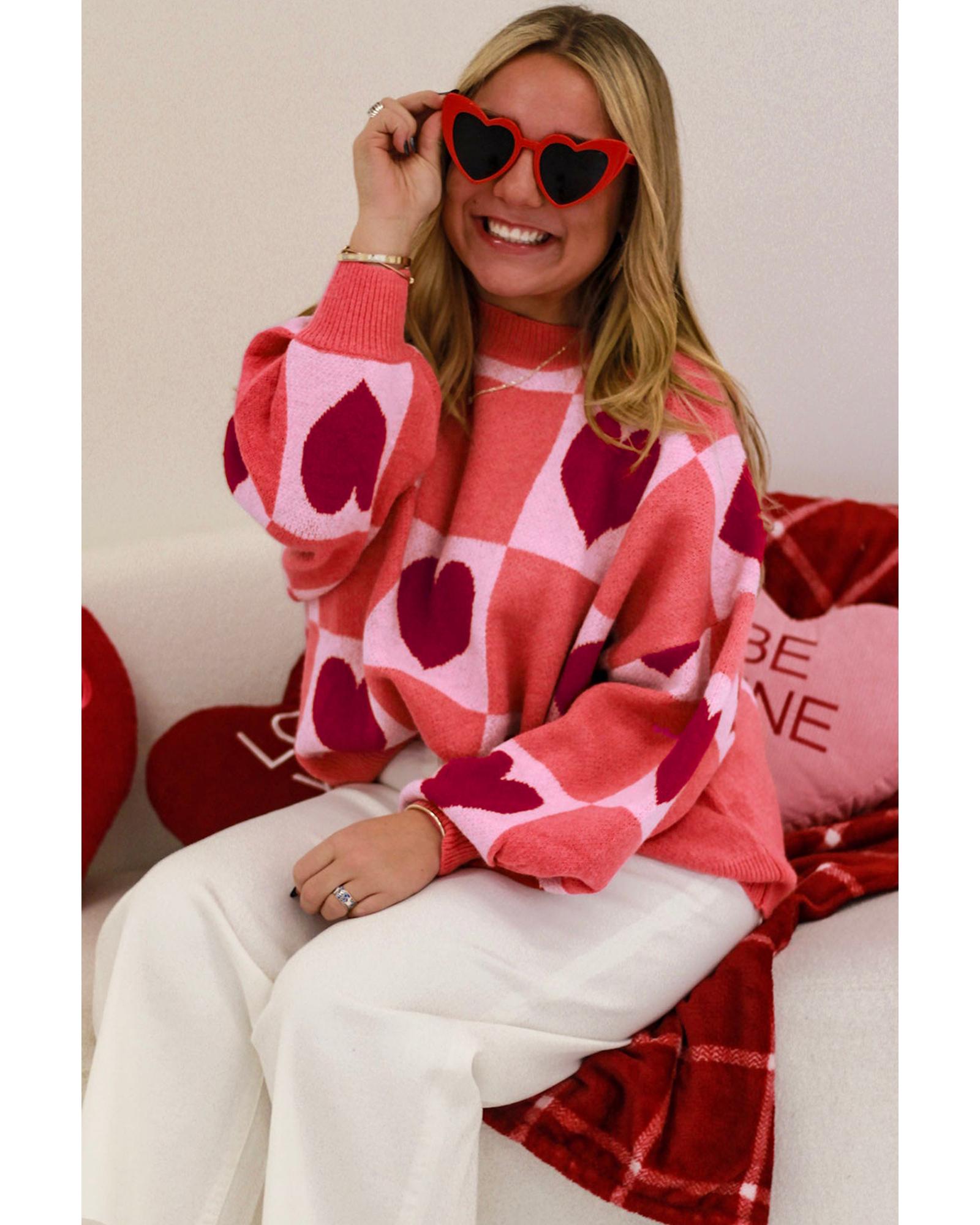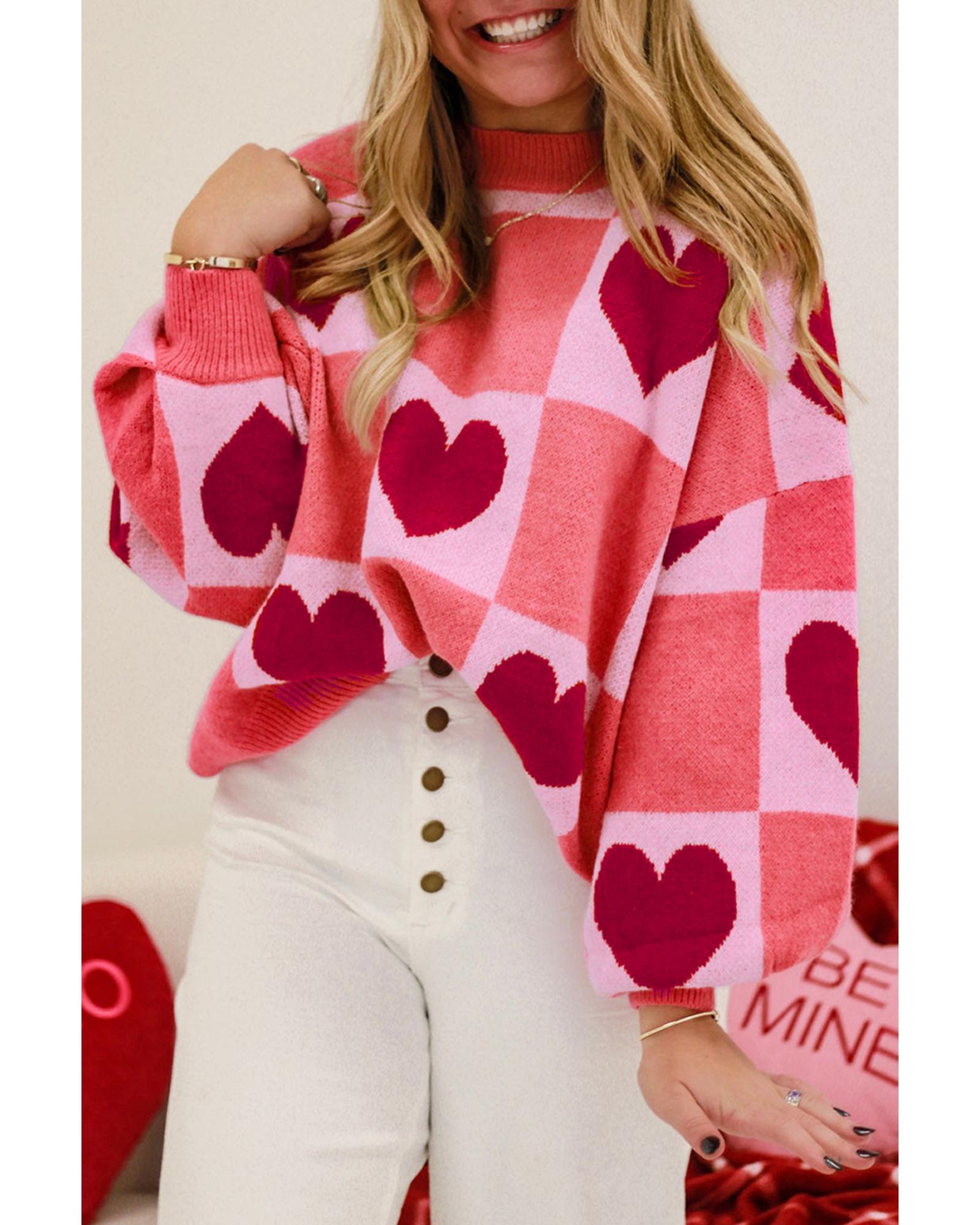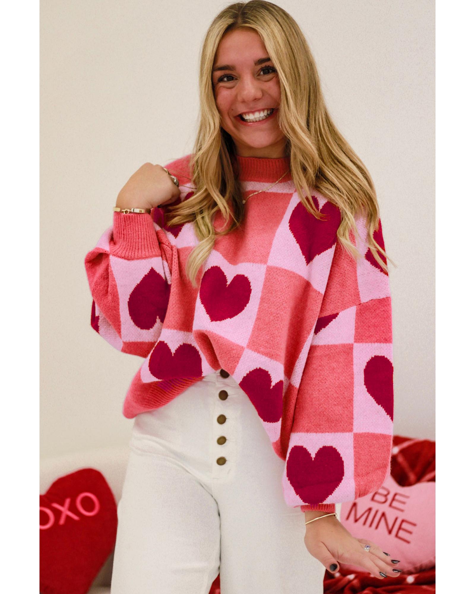 Azura Exchange Pink Plus Size Love Heart Block Mock Neck Lantern Sleeve Valentine Sweater – 2X
