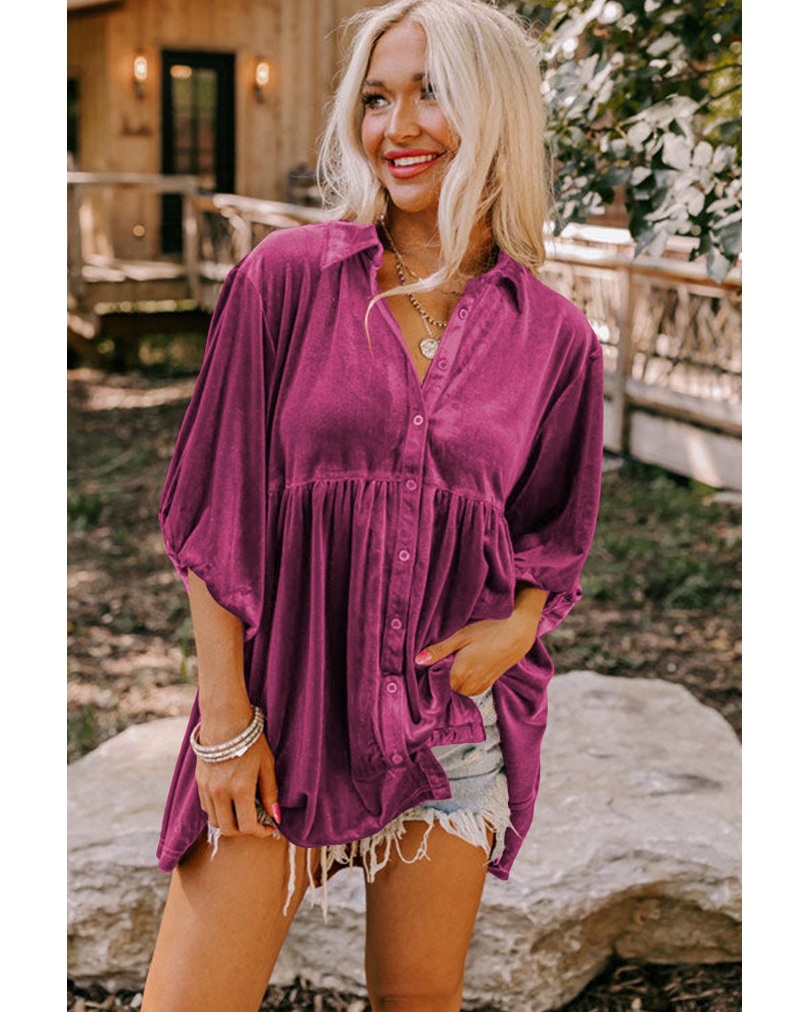 - Unisex Pitaya Pink 3/4 Sleeve Tunic Babydoll Velvet Shirt