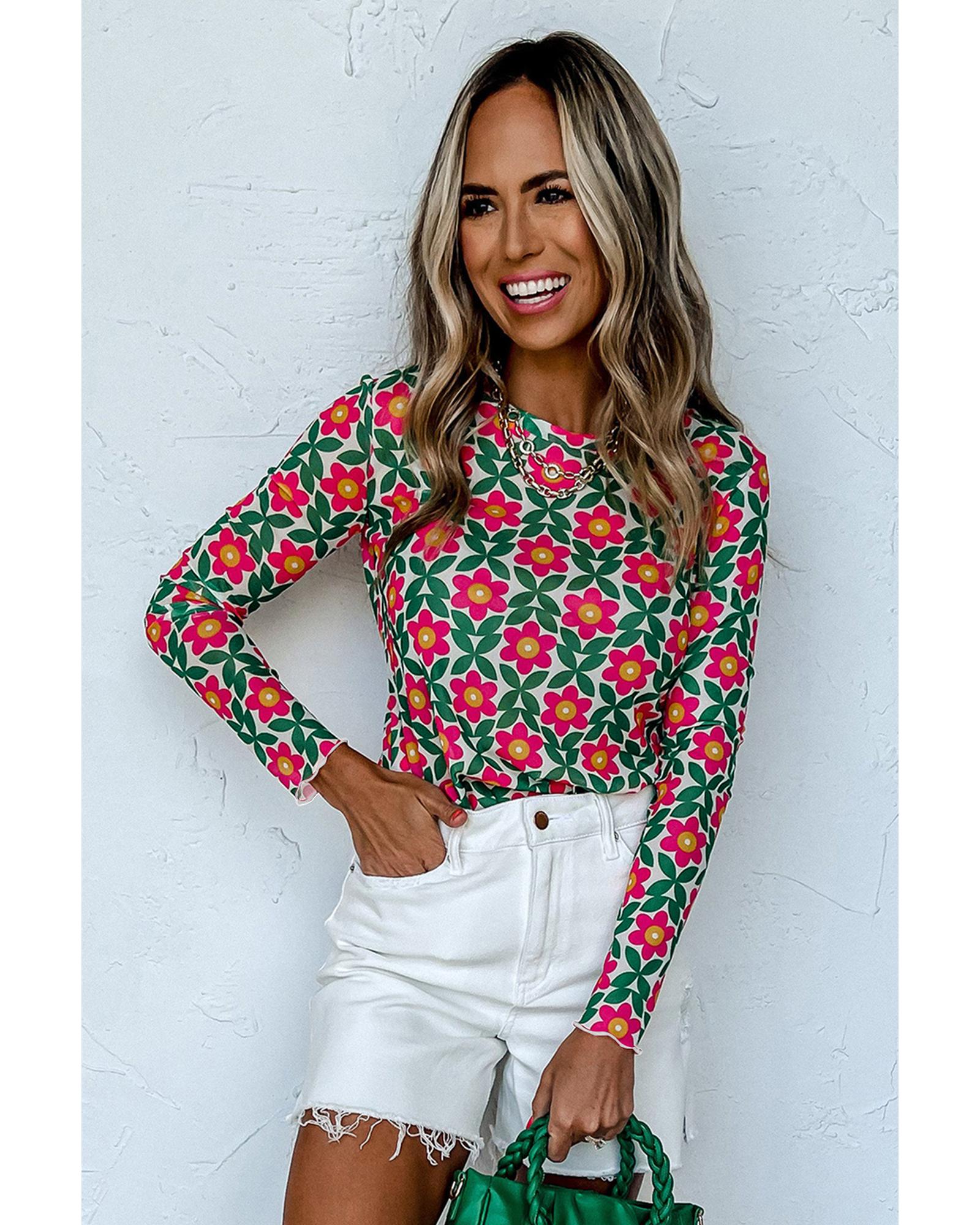 Azura Exchange Retro Floral Print Stretchy Long Sleeve Top – XL