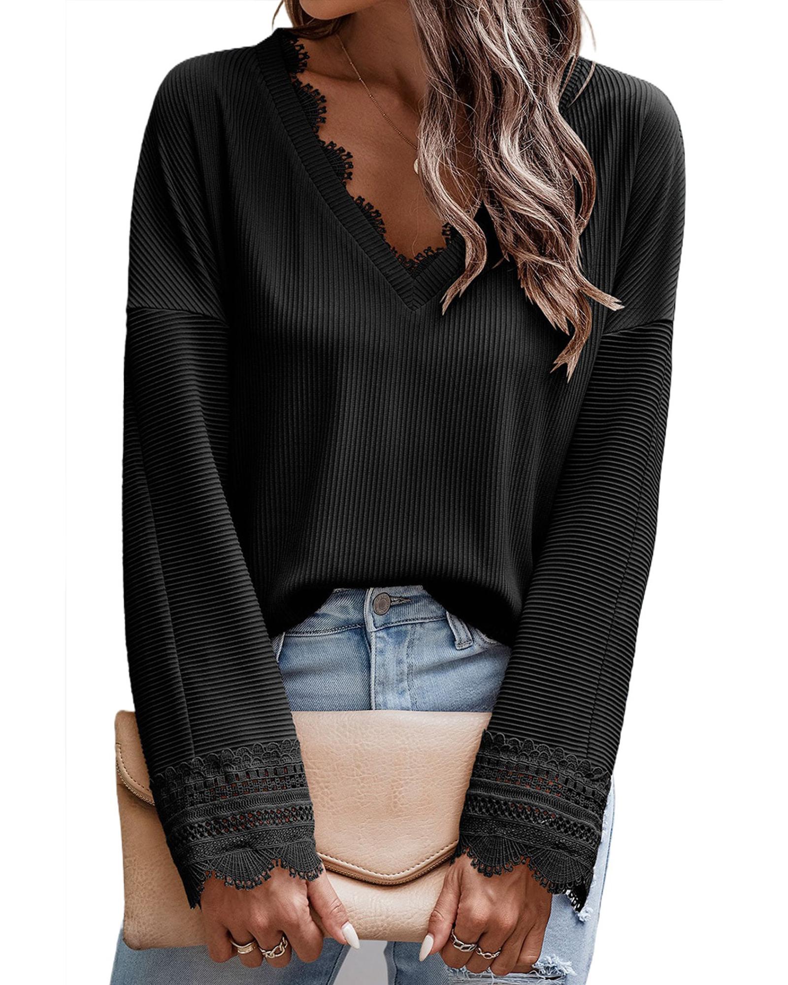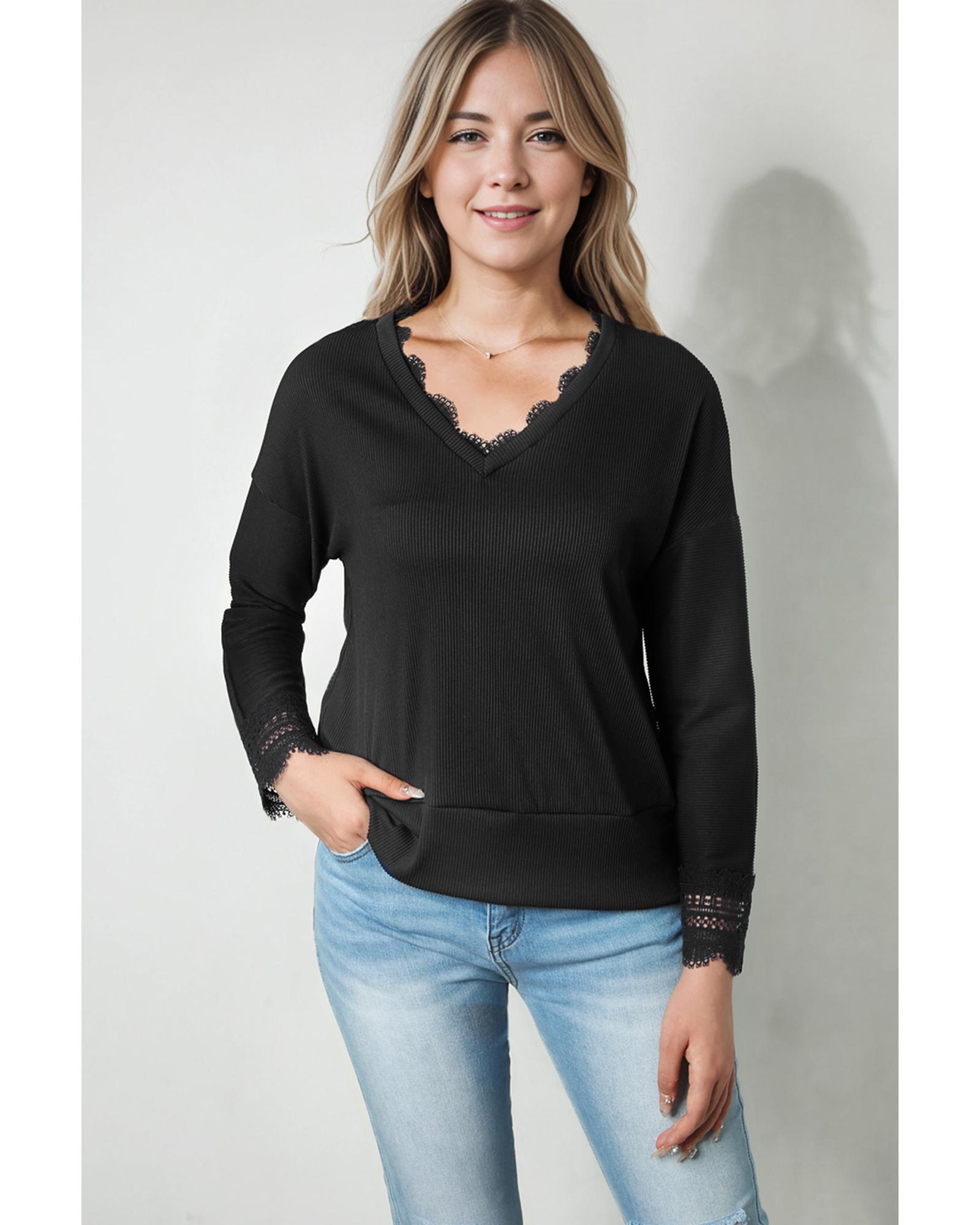 Azura Exchange Ribbed Texture Lace Trim V Neck Long Sleeve Top – S