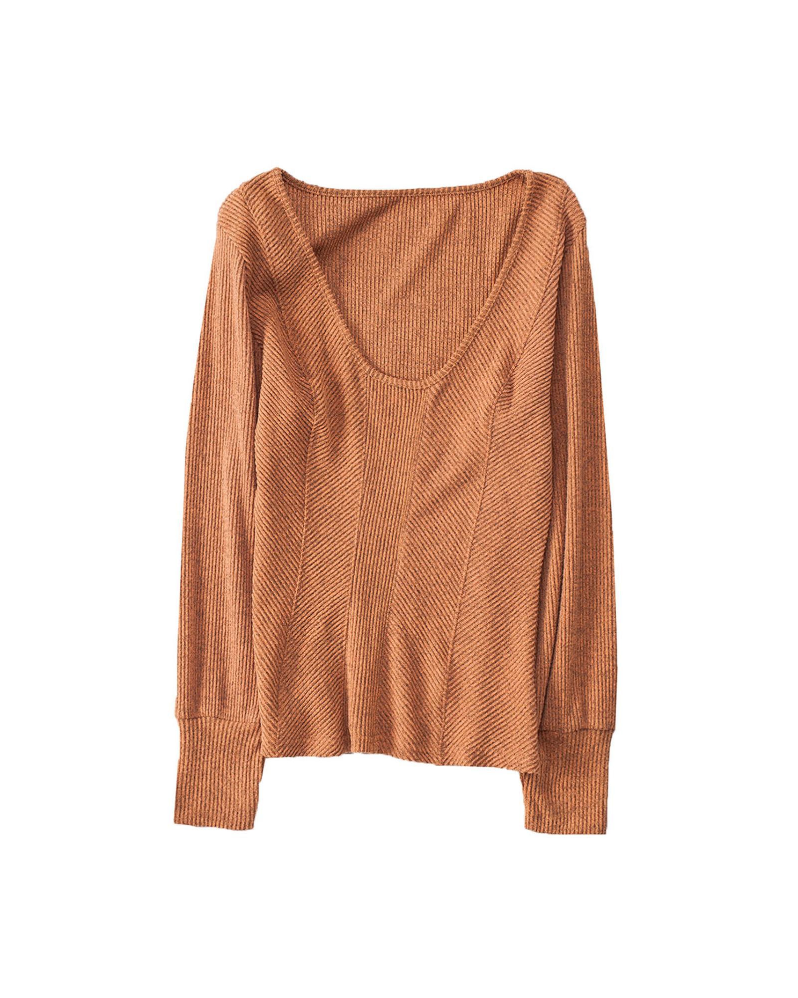 - Brown U Neck Textured Long Sleeve Top