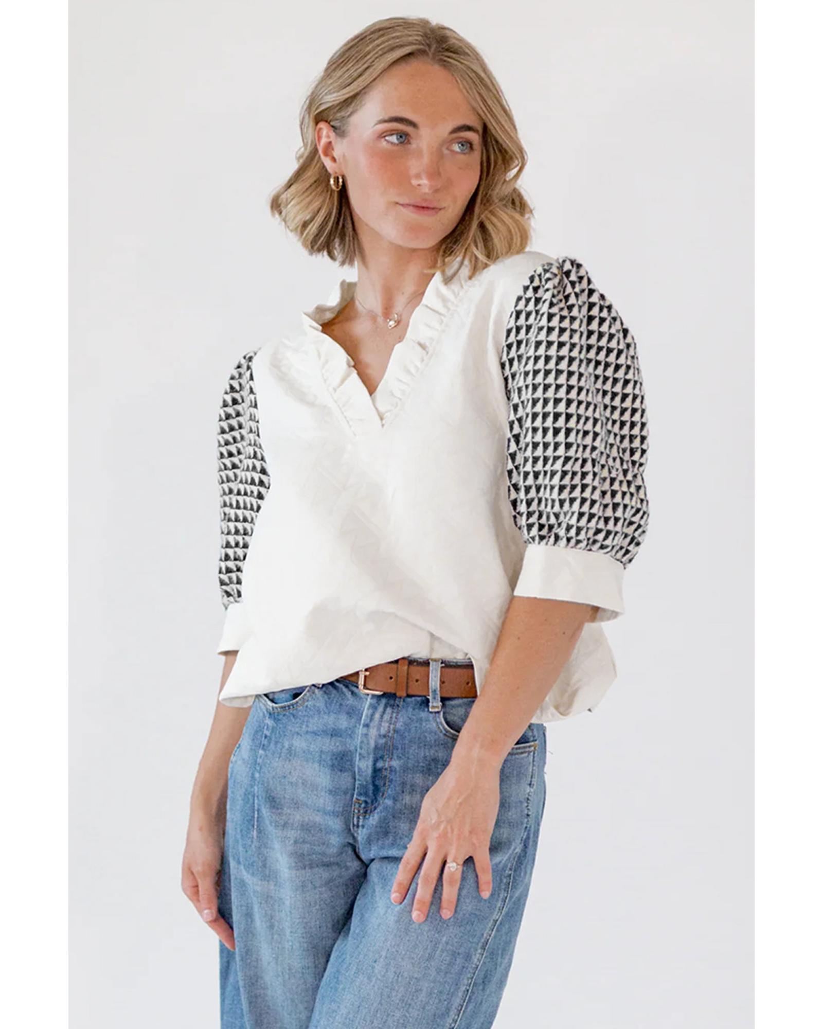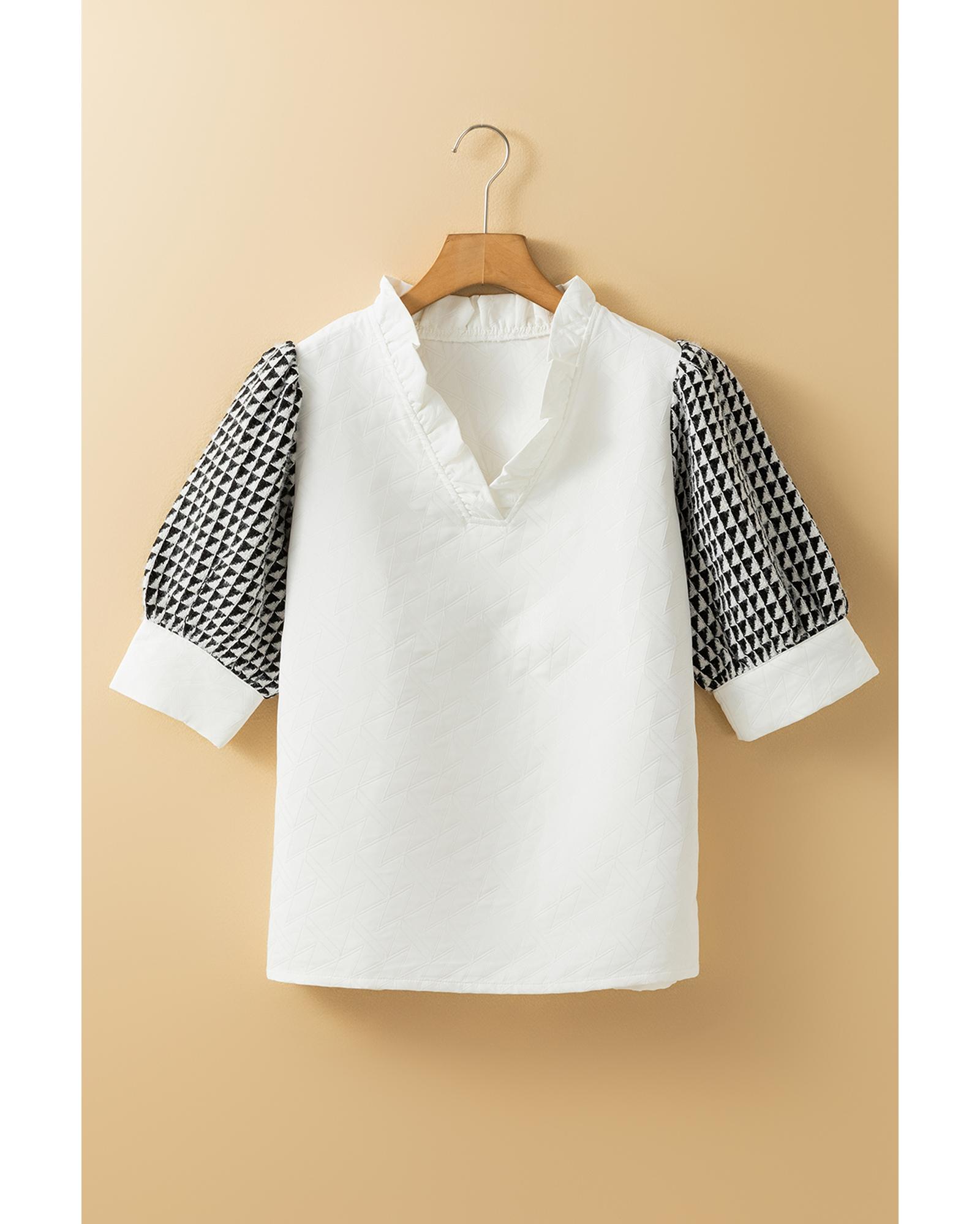 Azura Exchange White Geometric Textured Short Sleeve Frilly V Neck Blouse – L