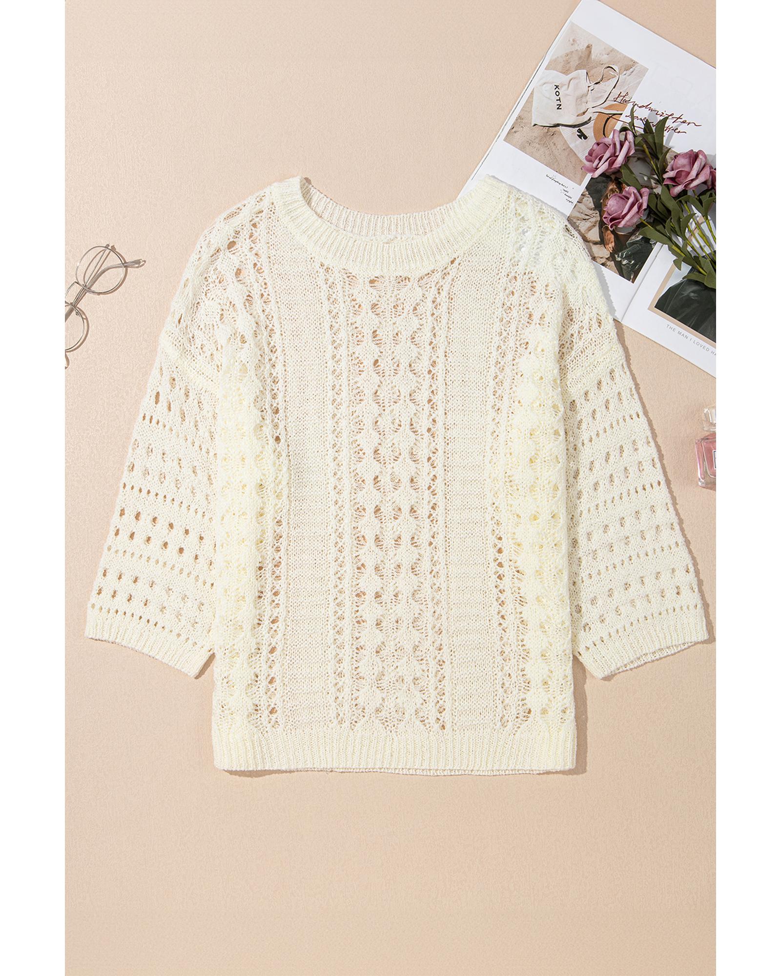 Azura Exchange White Hollow Out Knit Bracelet Sleeve Drop Shoulder Sweater – L