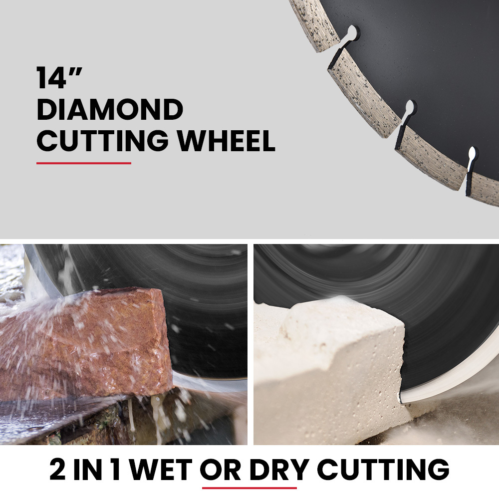 - 350mm diamond blade cuts through concrete, brick, stone, and more