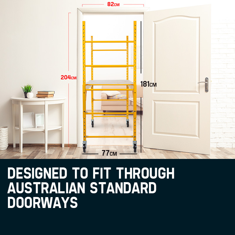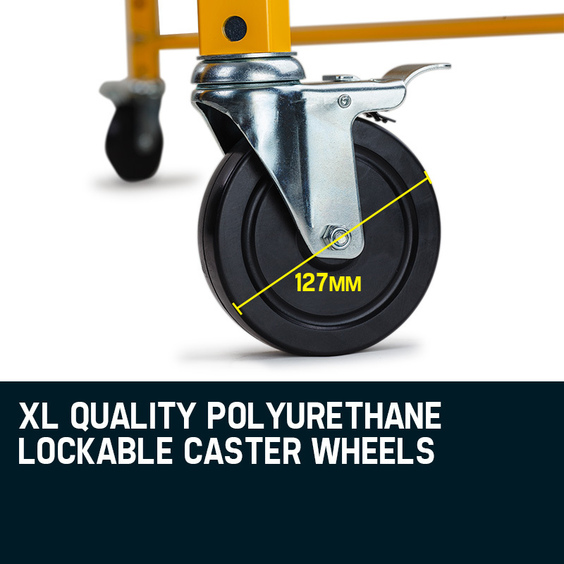 Moreover, the steel reinforced 1.45m2 wooden platform provides plenty of surface space for you and a range of your equipment, while at the same time, it’s been purposely designed slim enough to fit through Australian standard doorways. It’s fitted with four extra-large 127mm polyurethane lockable caster wheels that ensure optimal traction without the scuff marks. These casters are suitable for both indoor and outdoor use and lock firmly in place to secure your scaffold wherever you need it.