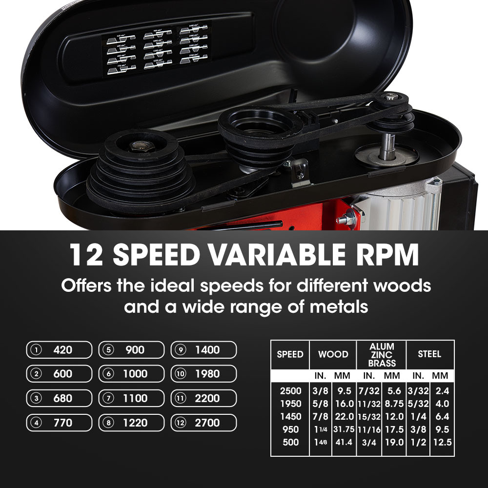 • Variable Speeds (rpm): 420 / 600 / 680 / 770 / 900 / 1000 / 1100 / 1220 / 1400 / 1980 / 2200 / 2700