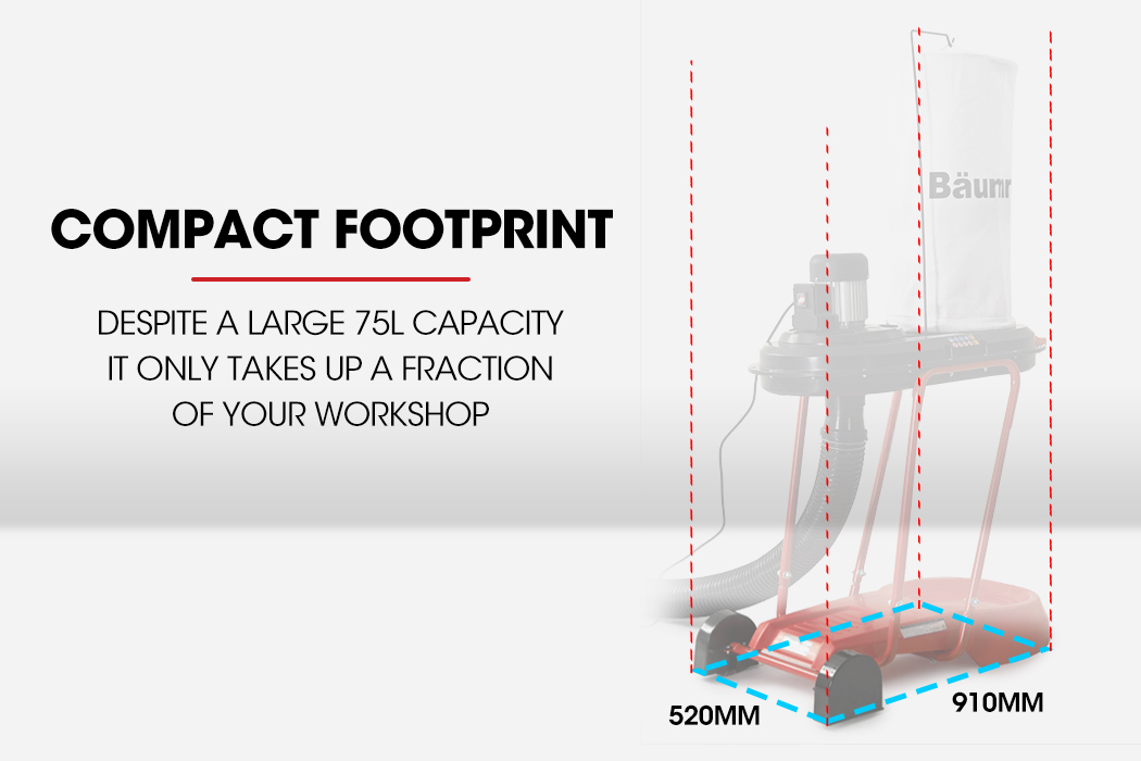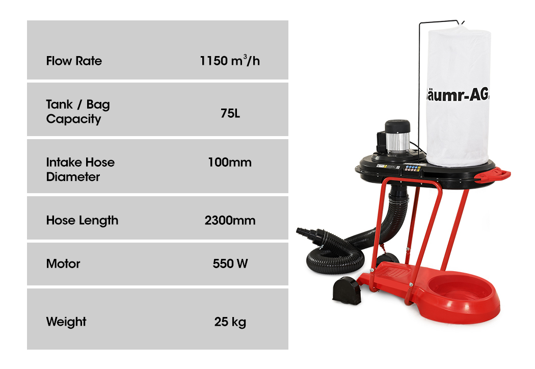 The Baumr-AG 75L Woodworking Dust Collector ideal choice for the serious craftsman that is after a portable or stationary solution to extract dust from your tools. It is of course a much simpler alternative to an entire fixed dust collection system, and only takes up a very small footprint. This Baumr-AG has a powerful, yet relatively quiet 3/4HP motor that can perform high volume extraction of up to 1150 m3/h.