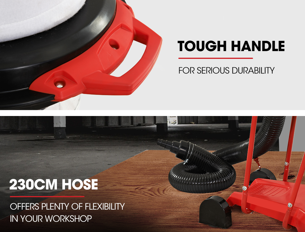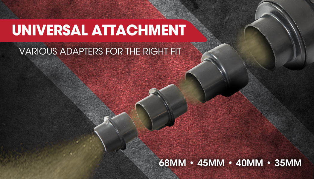 The rugged yet lightweight design and strong handle ensures portability, and the generous 75L capacity of this dust separator allows for extended cleaning periods with less frequent emptying. Just attach the generous 2.3m flexible hose to your power tools via the universal attachment which has various adaptors for the right fit.
