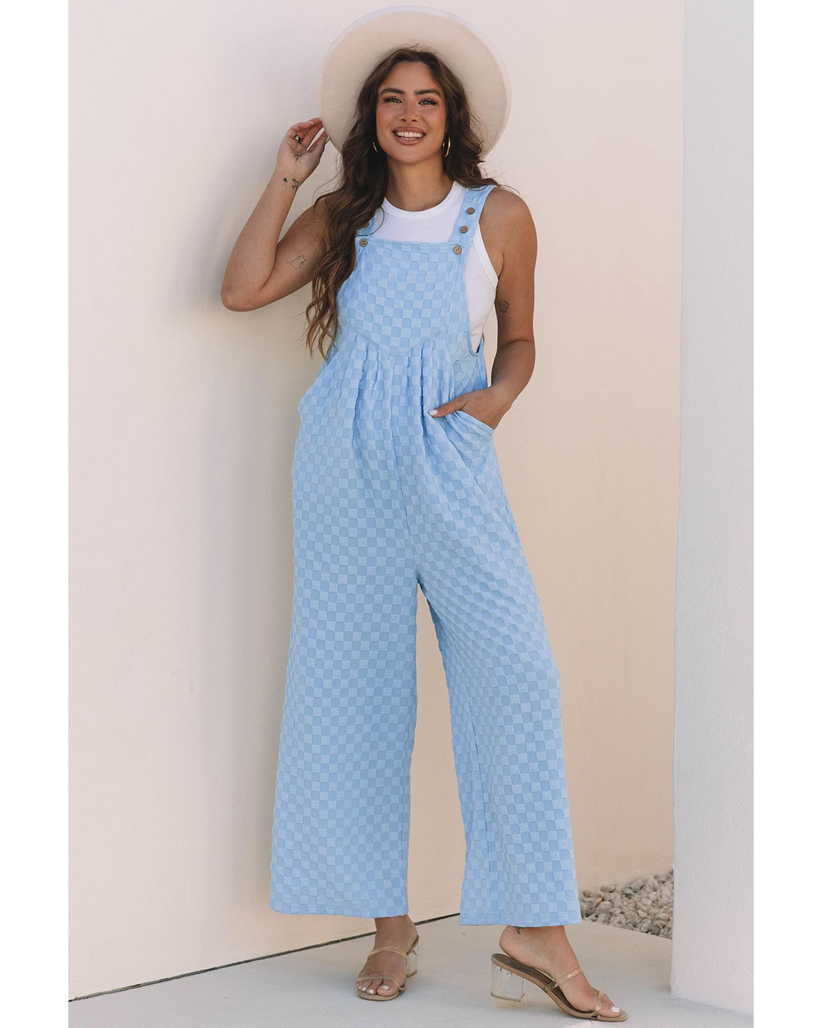 Beau Blue Checkered Pocketed High Waist Wide Leg Overall – M