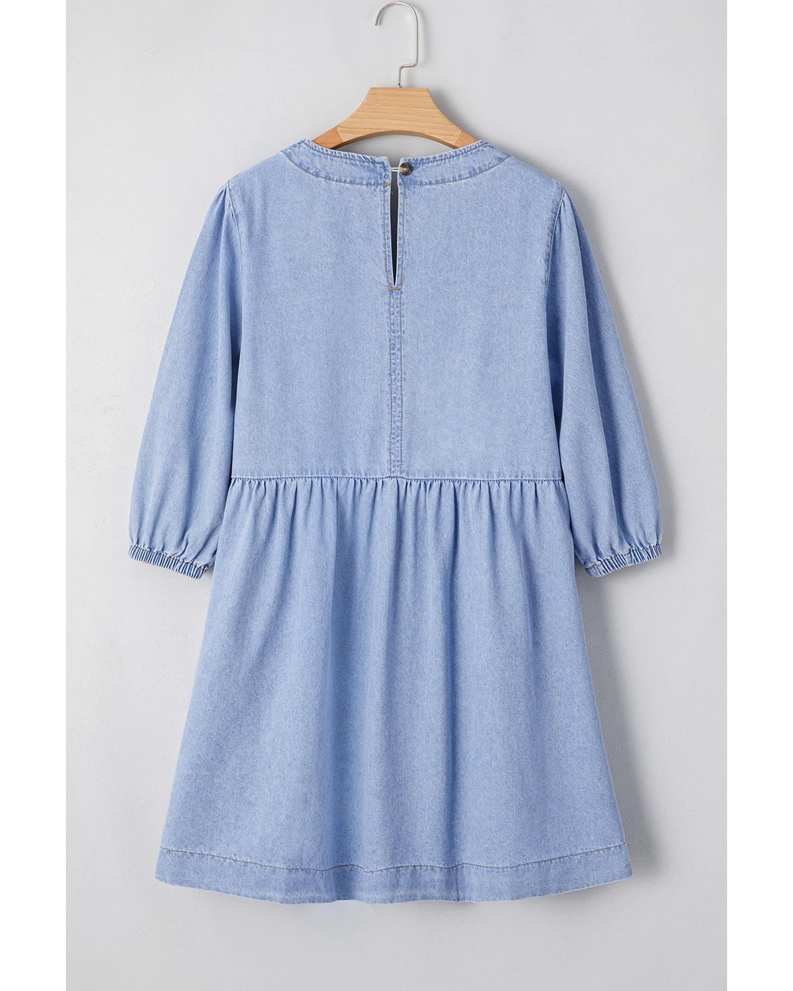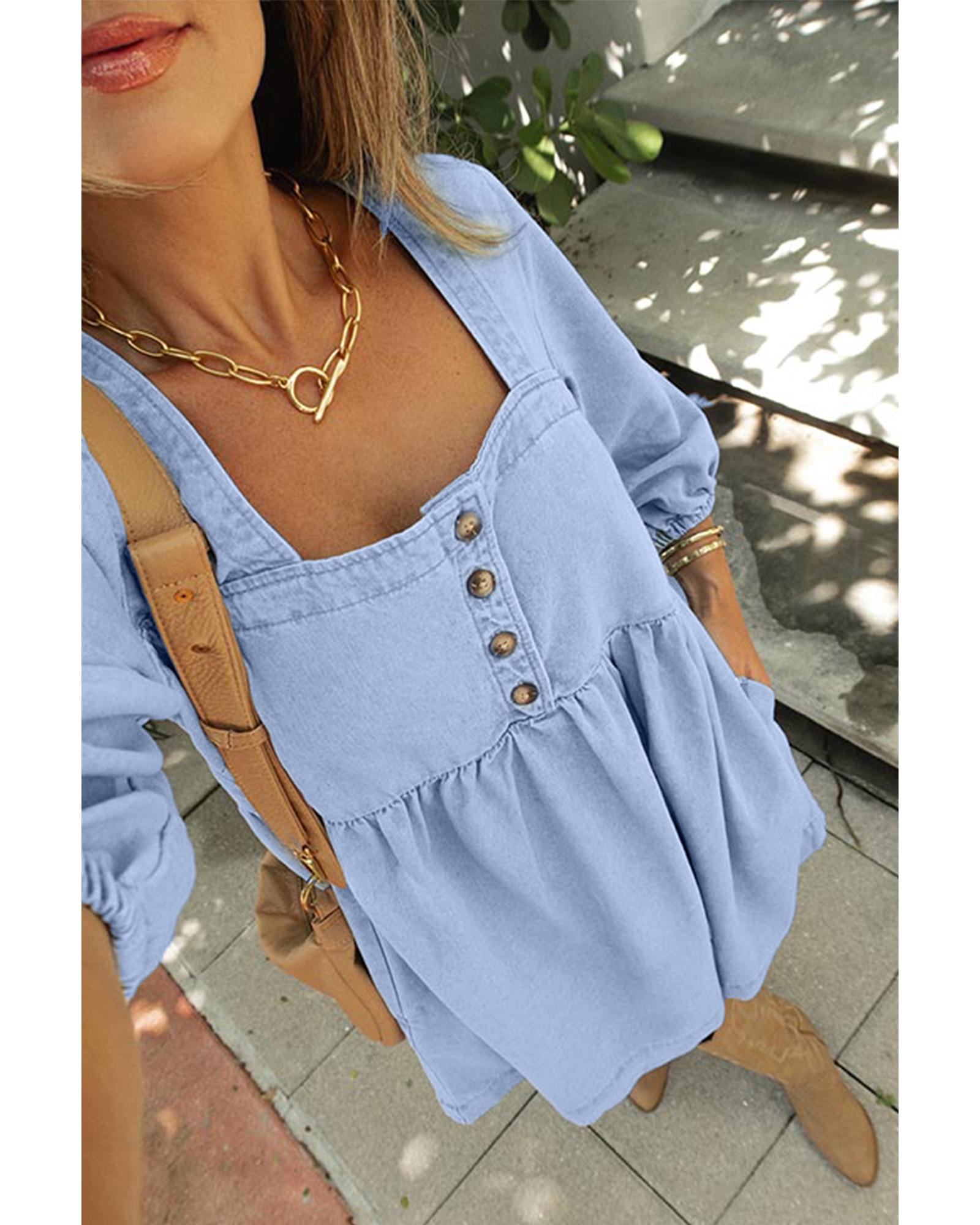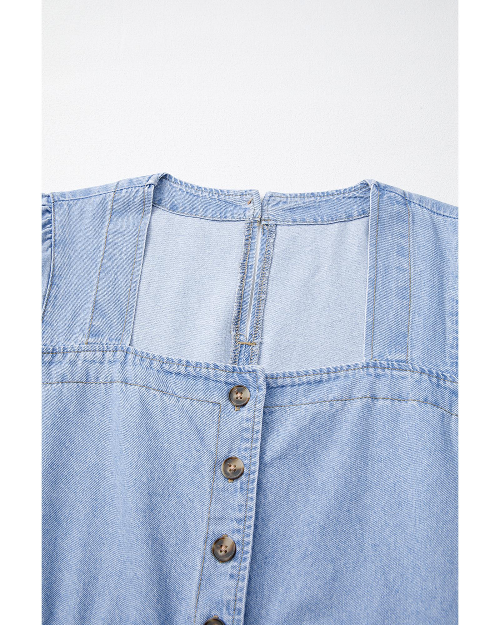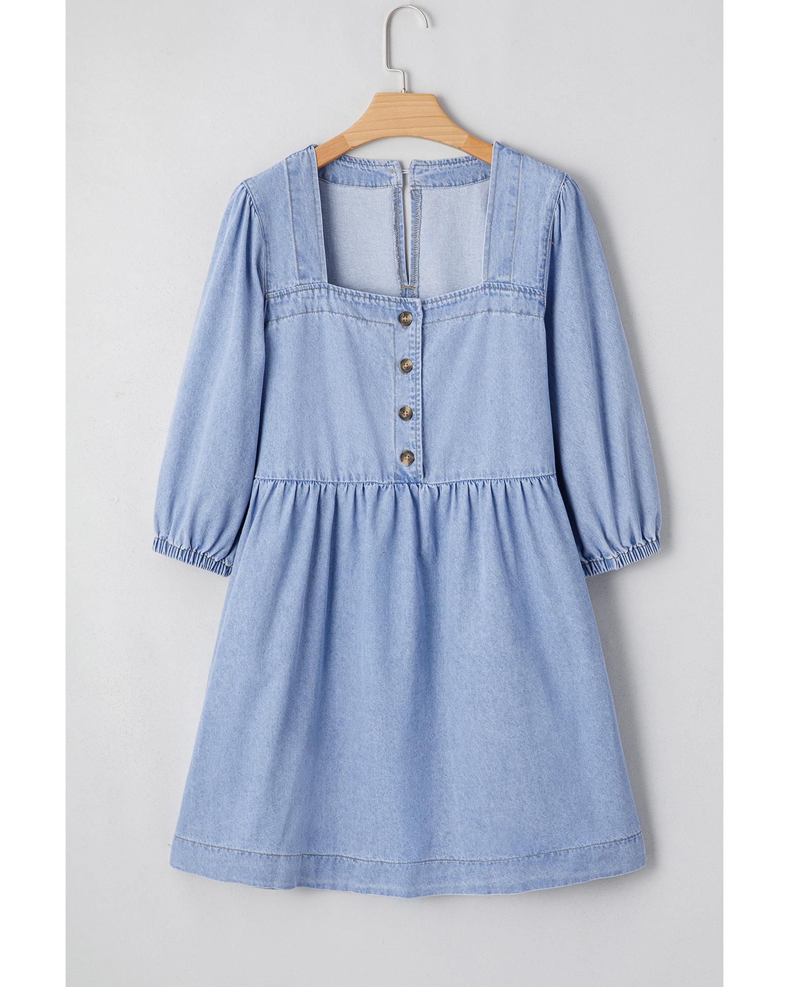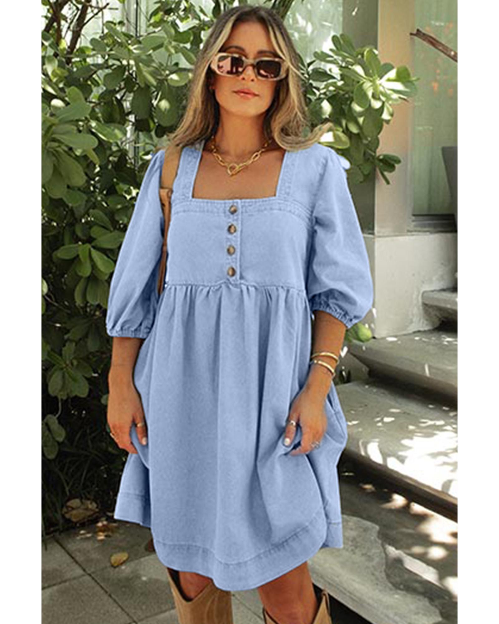 Beau Blue Denim Button Detail Babydoll Square Neck Mini Dress – L