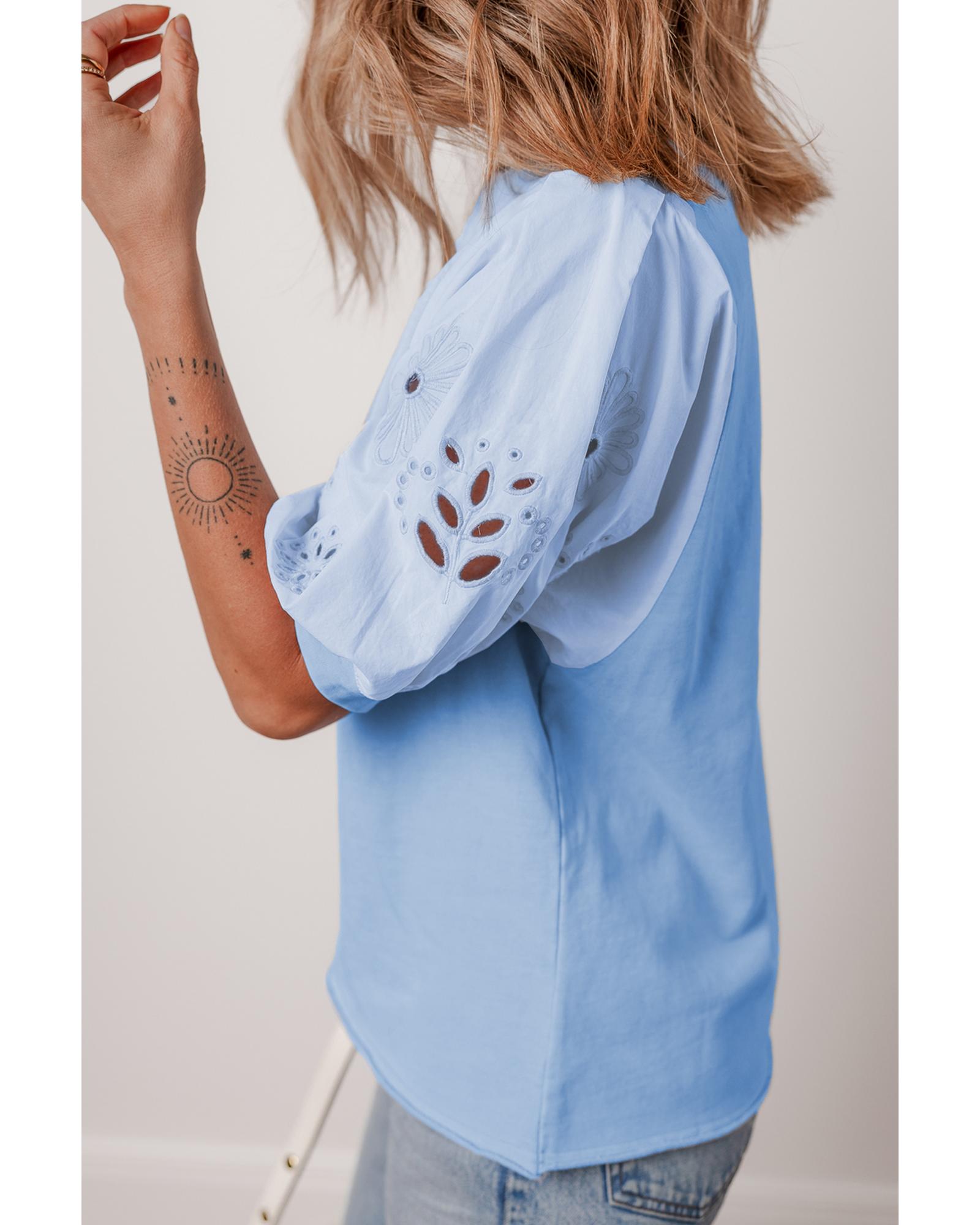 Beau Blue Eyelet Flower Embroidered Puff Short Sleeve Patchwork Crew Neck Blouse – S