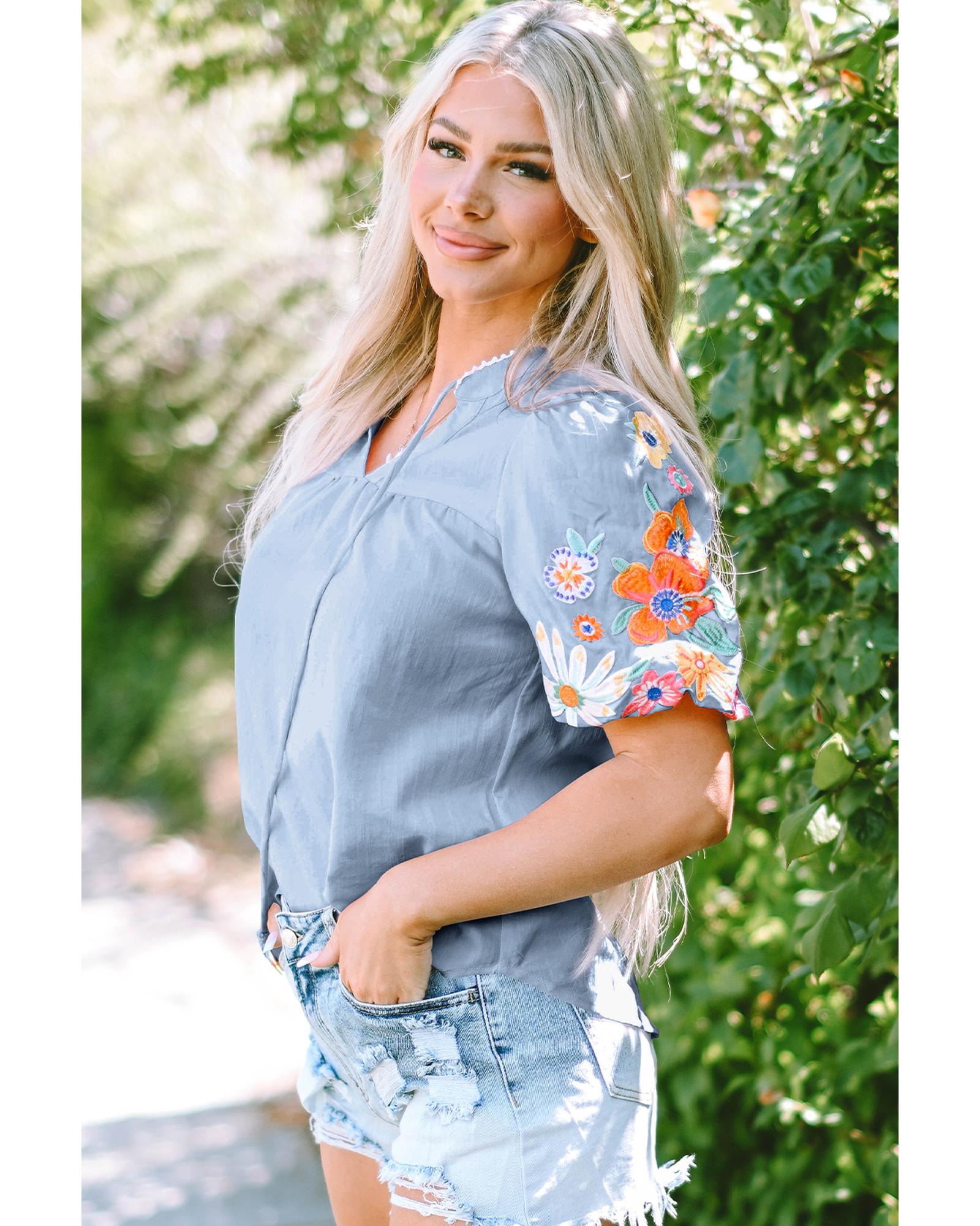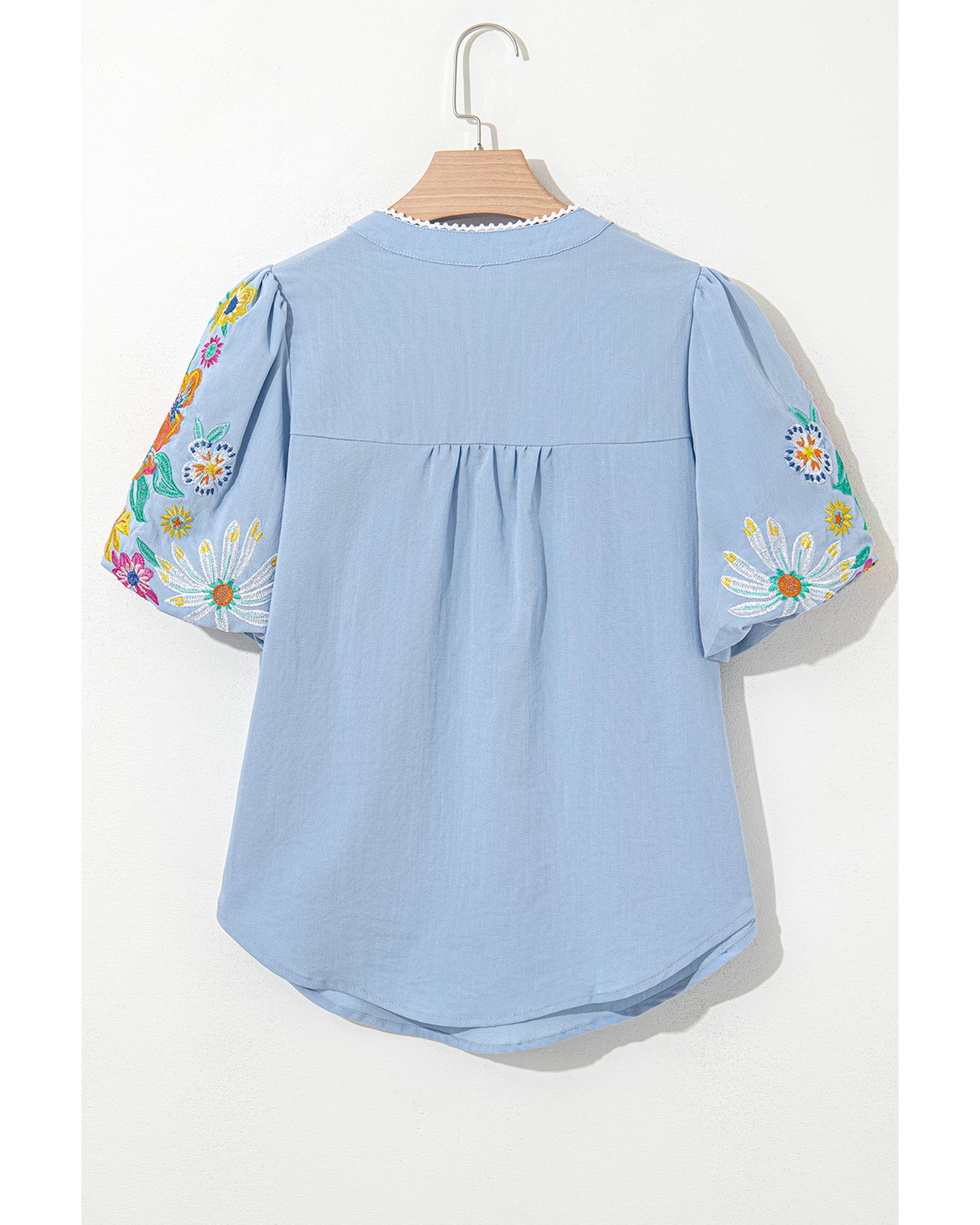 Beau Blue Floral Embroidered Puff Sleeve Split Neck Blouse – L