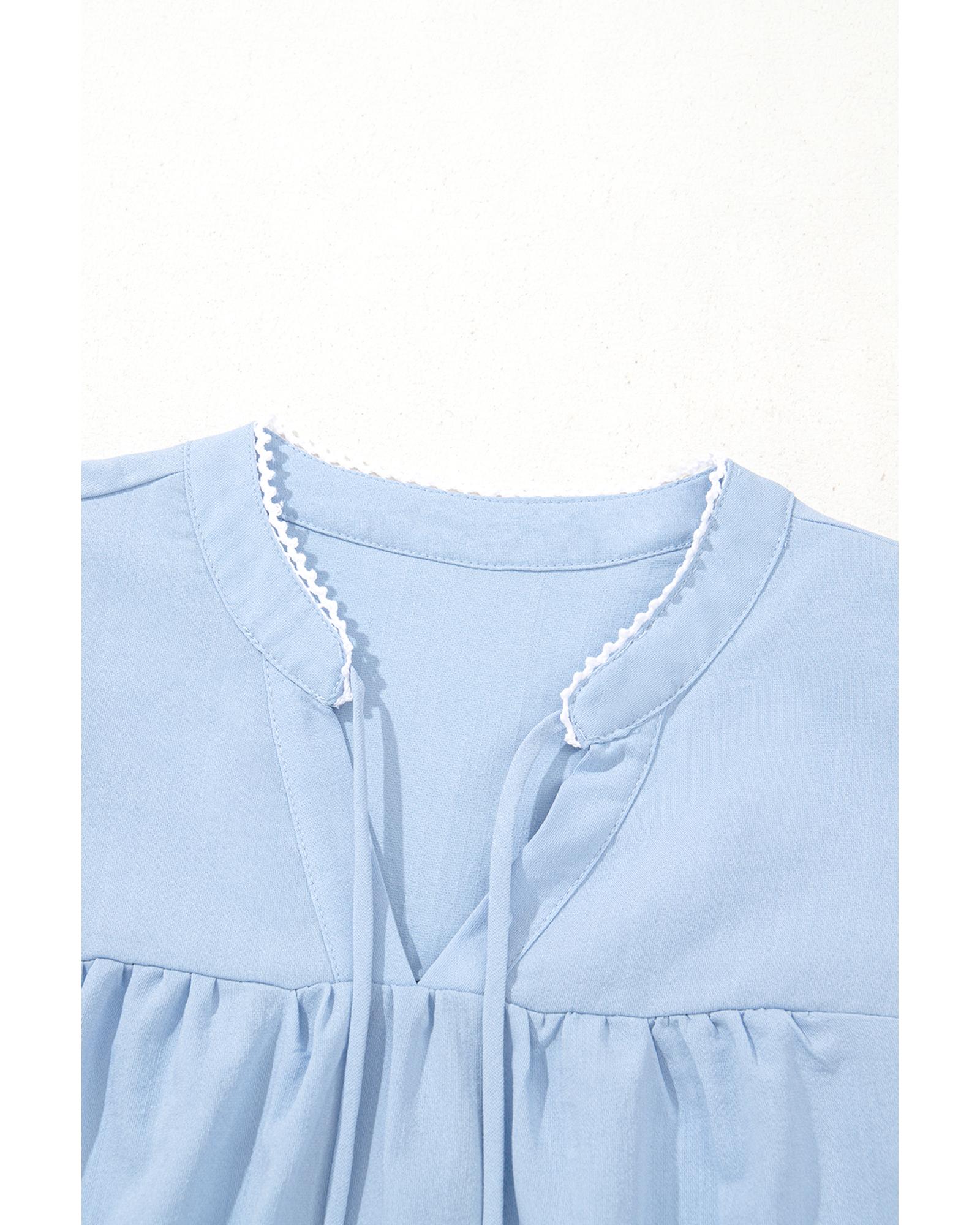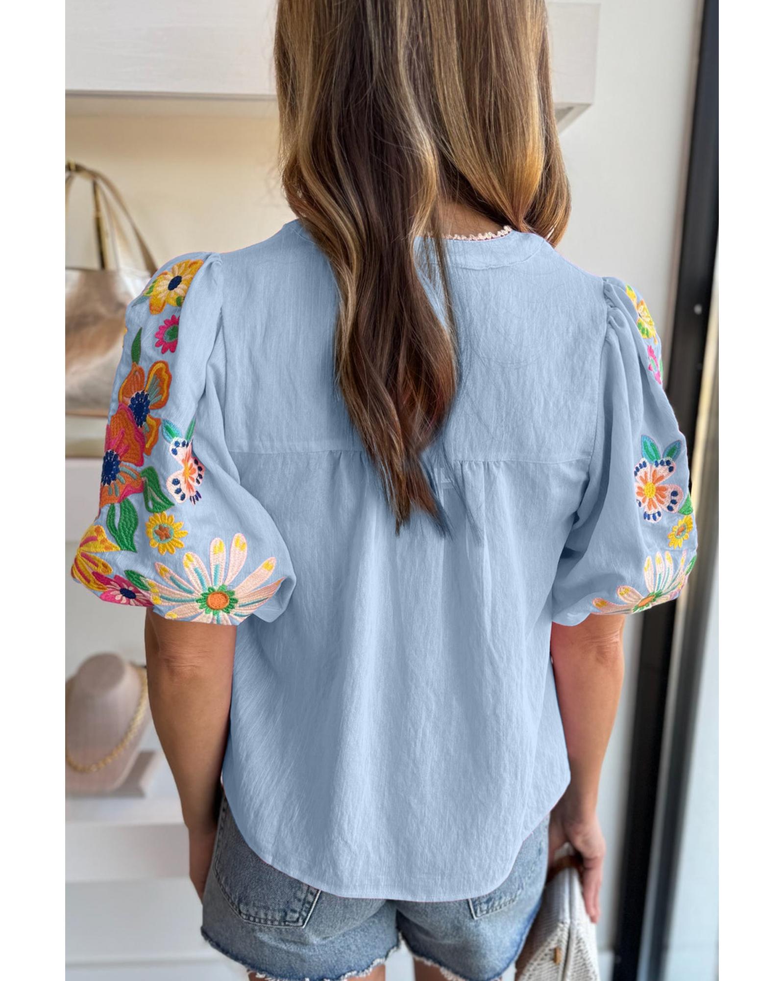 Beau Blue Floral Embroidered Puff Sleeve Split Neck Blouse – XL