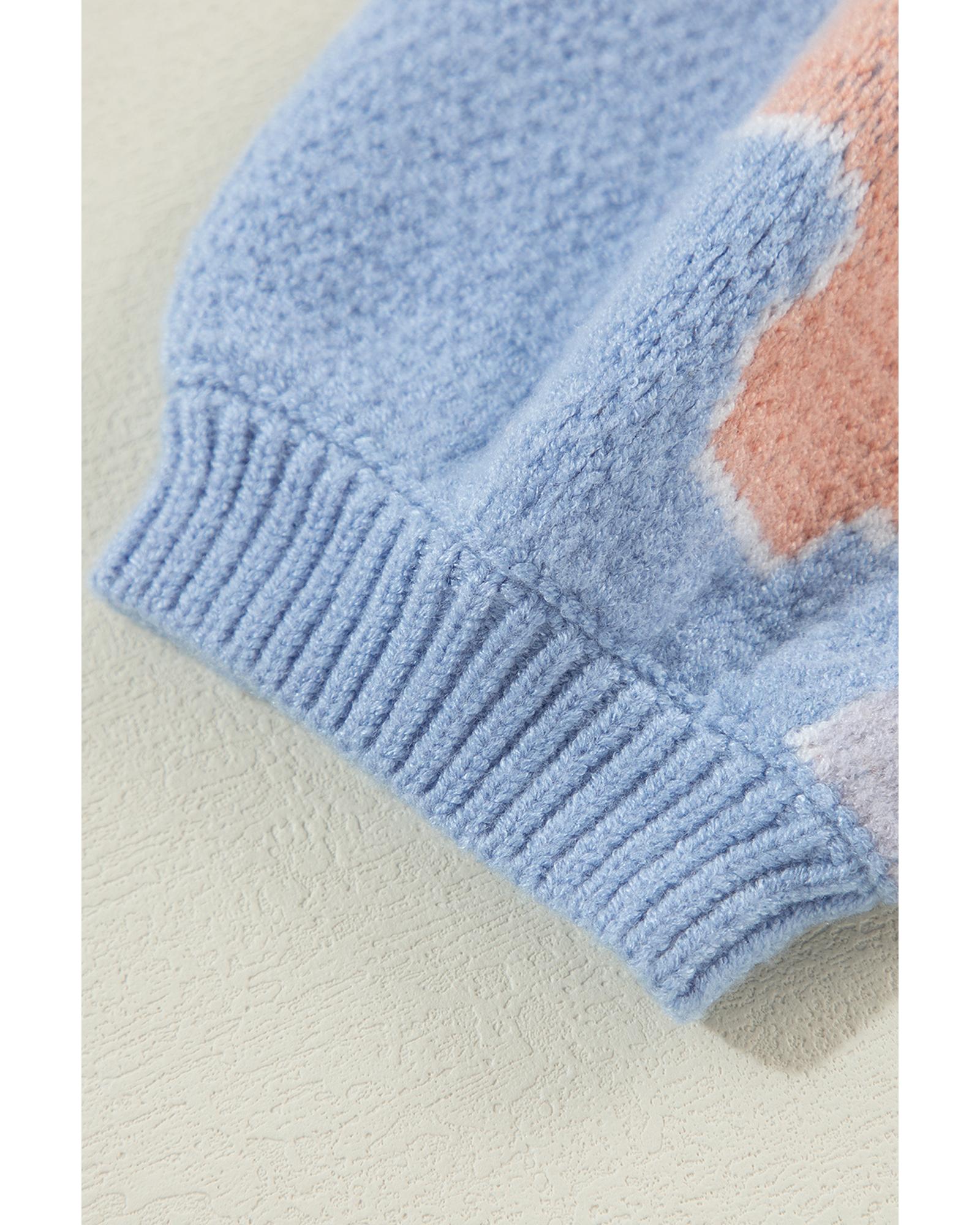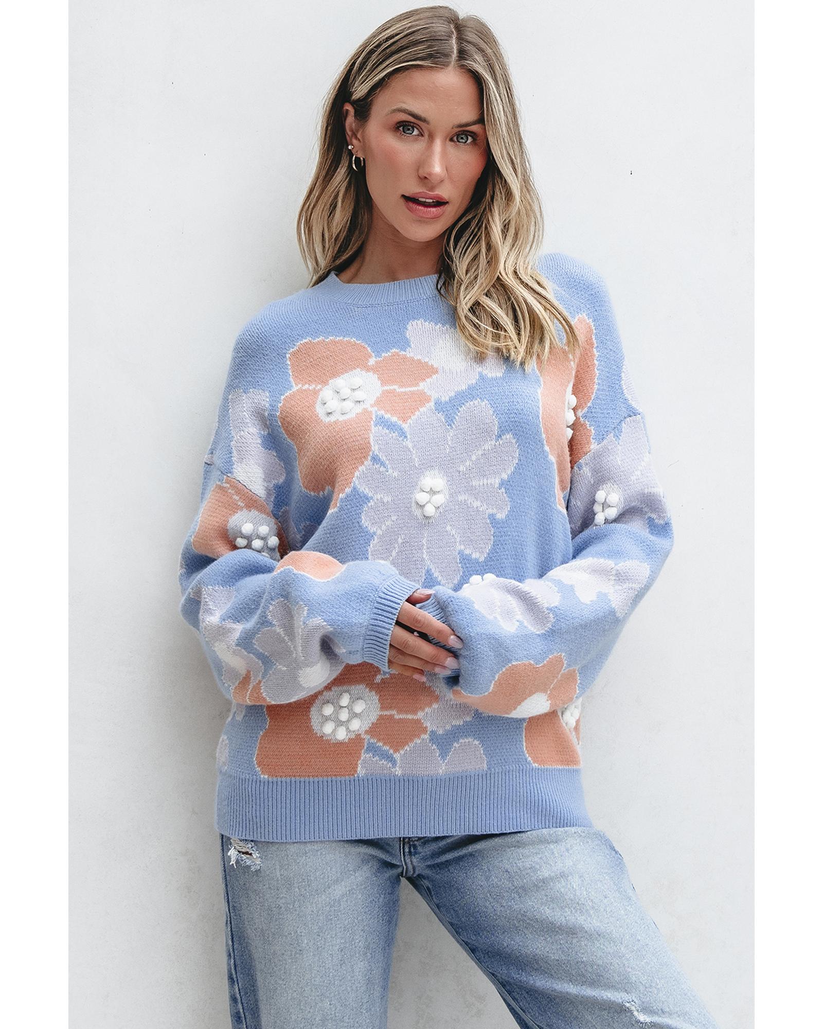 Beau Blue Floral O Neck Drop Shoulder Knitted Sweater – S
