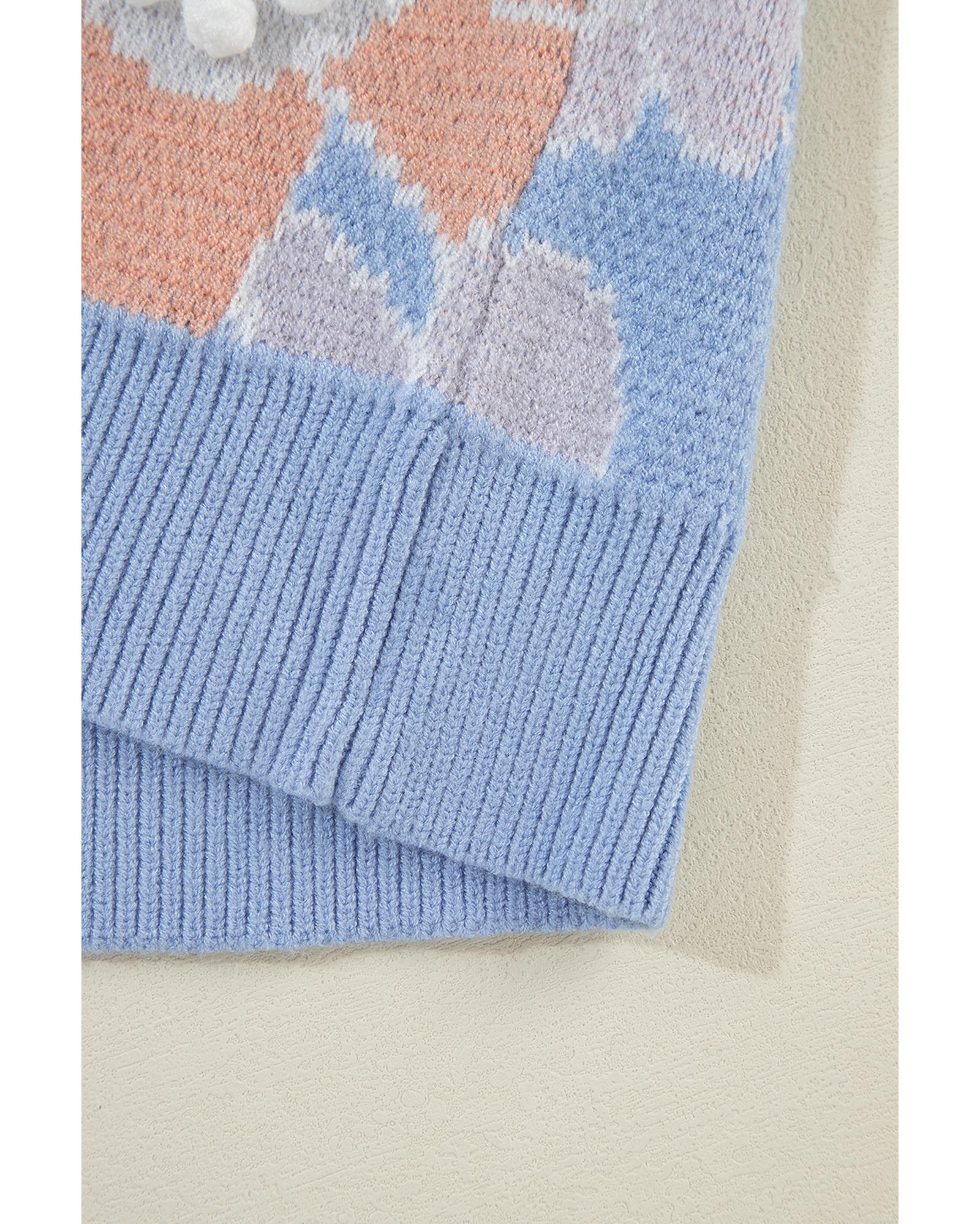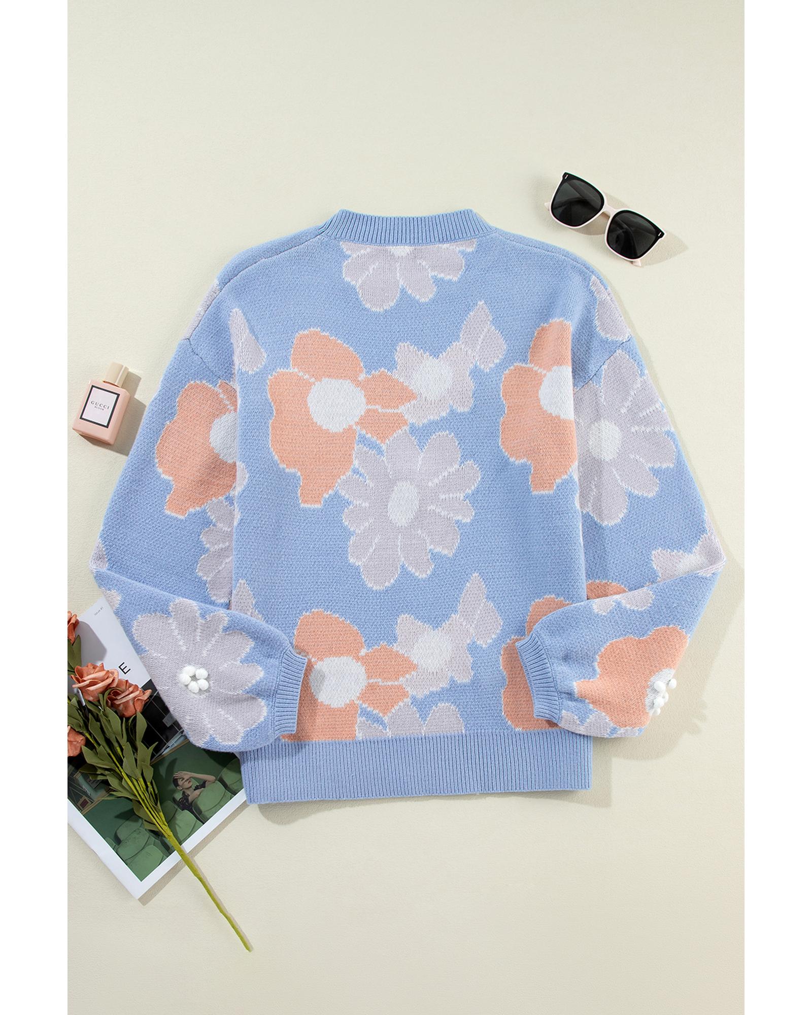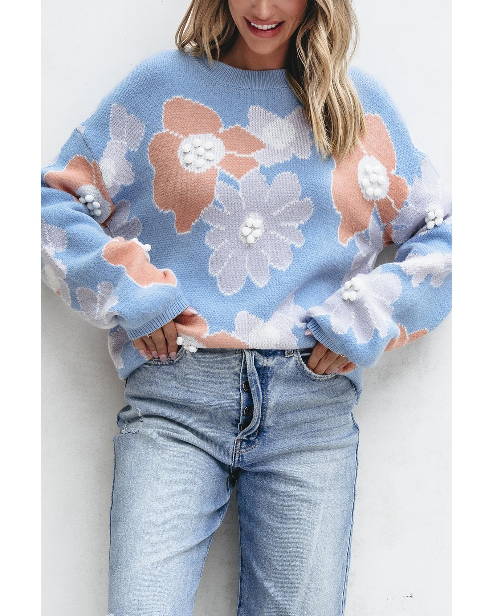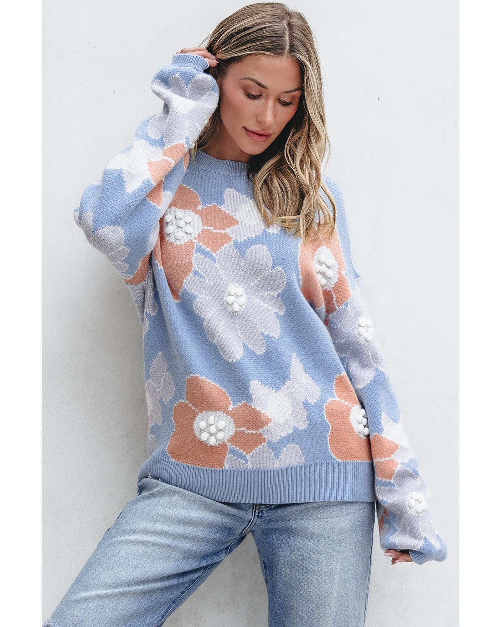 Beau Blue Floral O Neck Drop Shoulder Knitted Sweater – XL