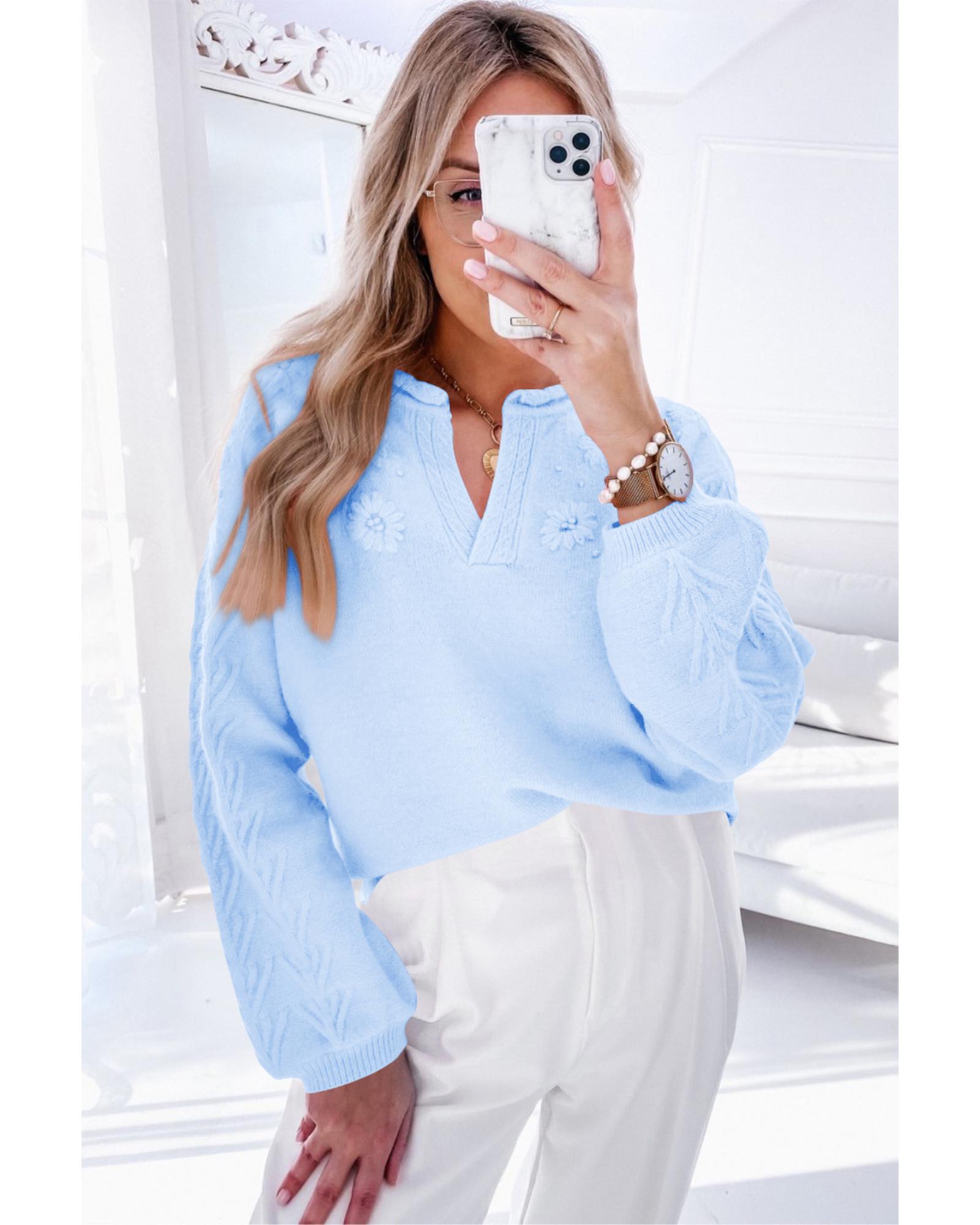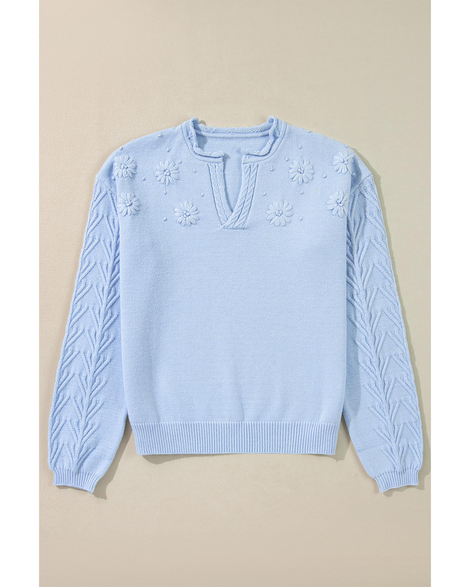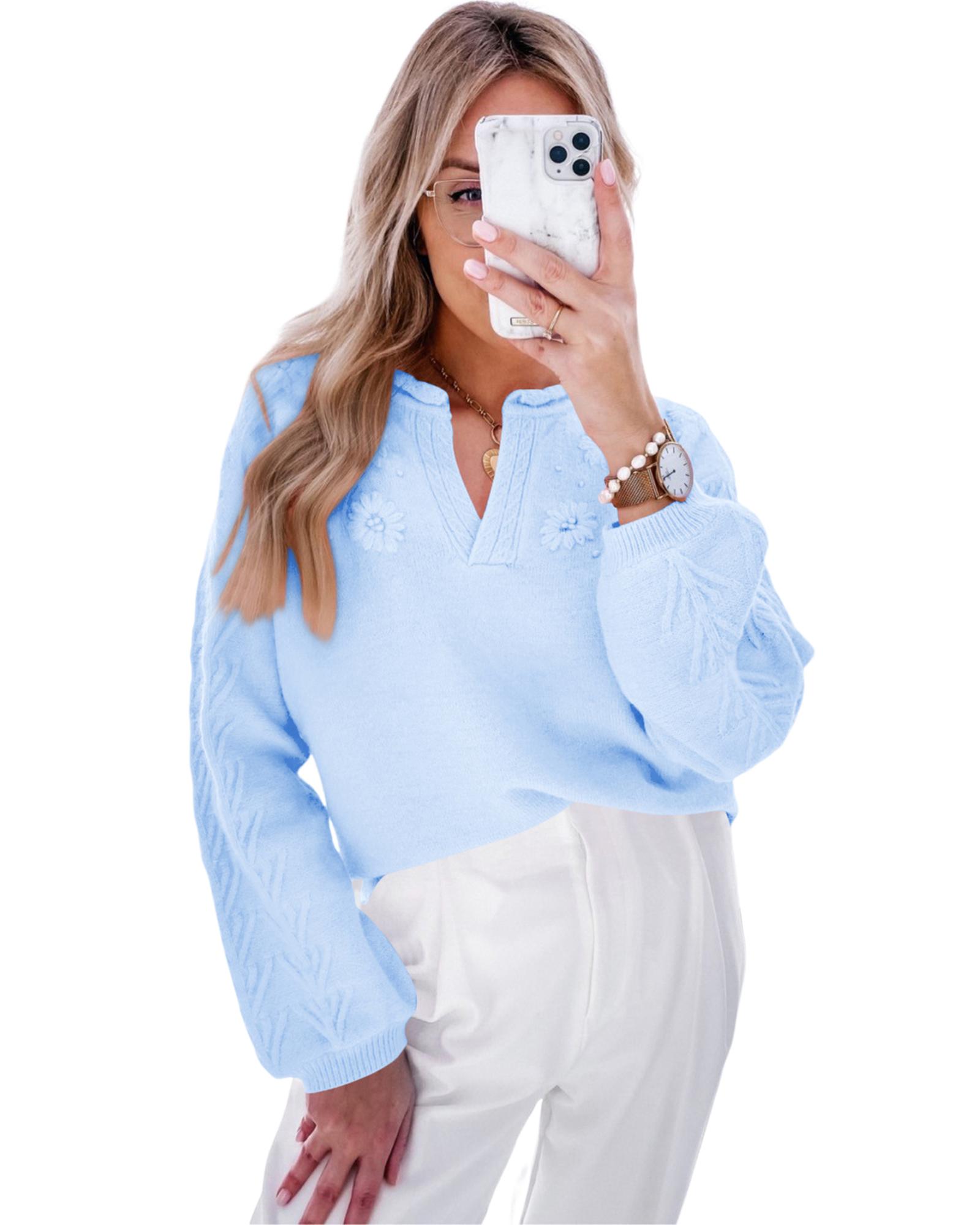 Beau Blue Flower Detail Knitted Notched Neck Sweater – 2XL