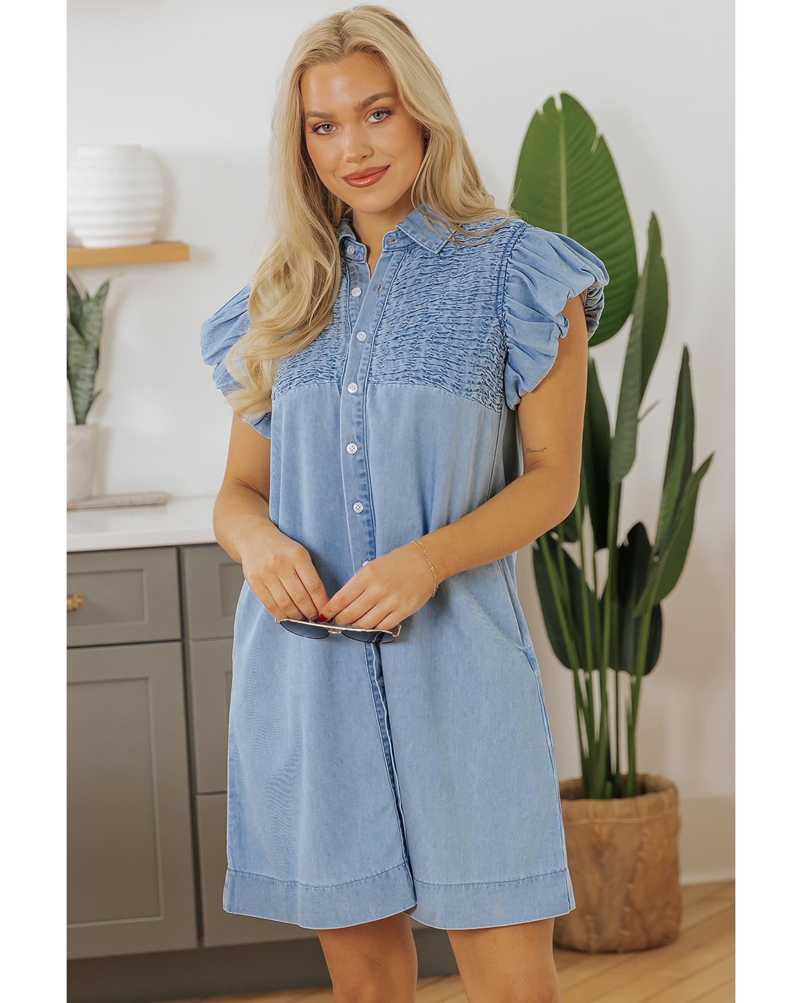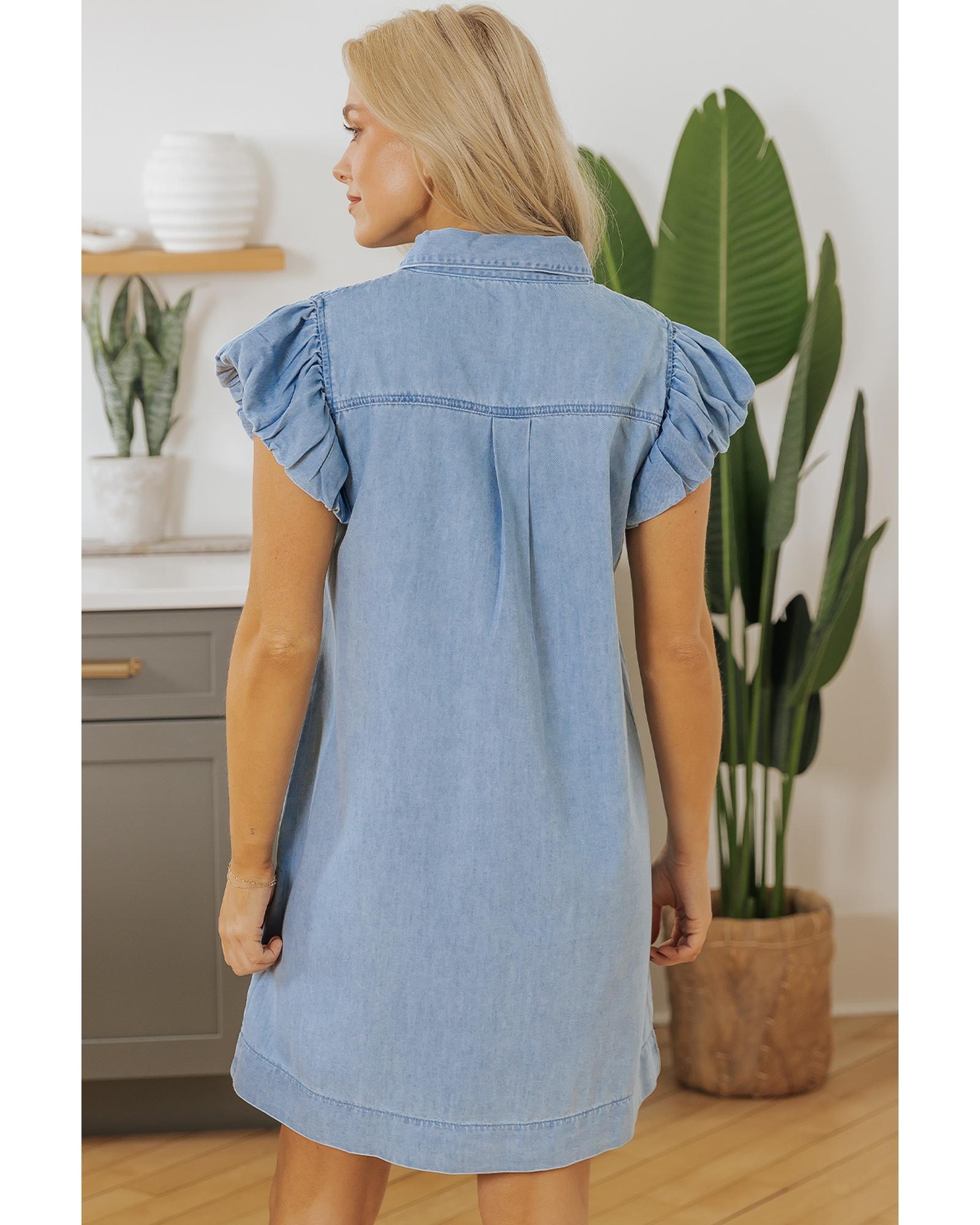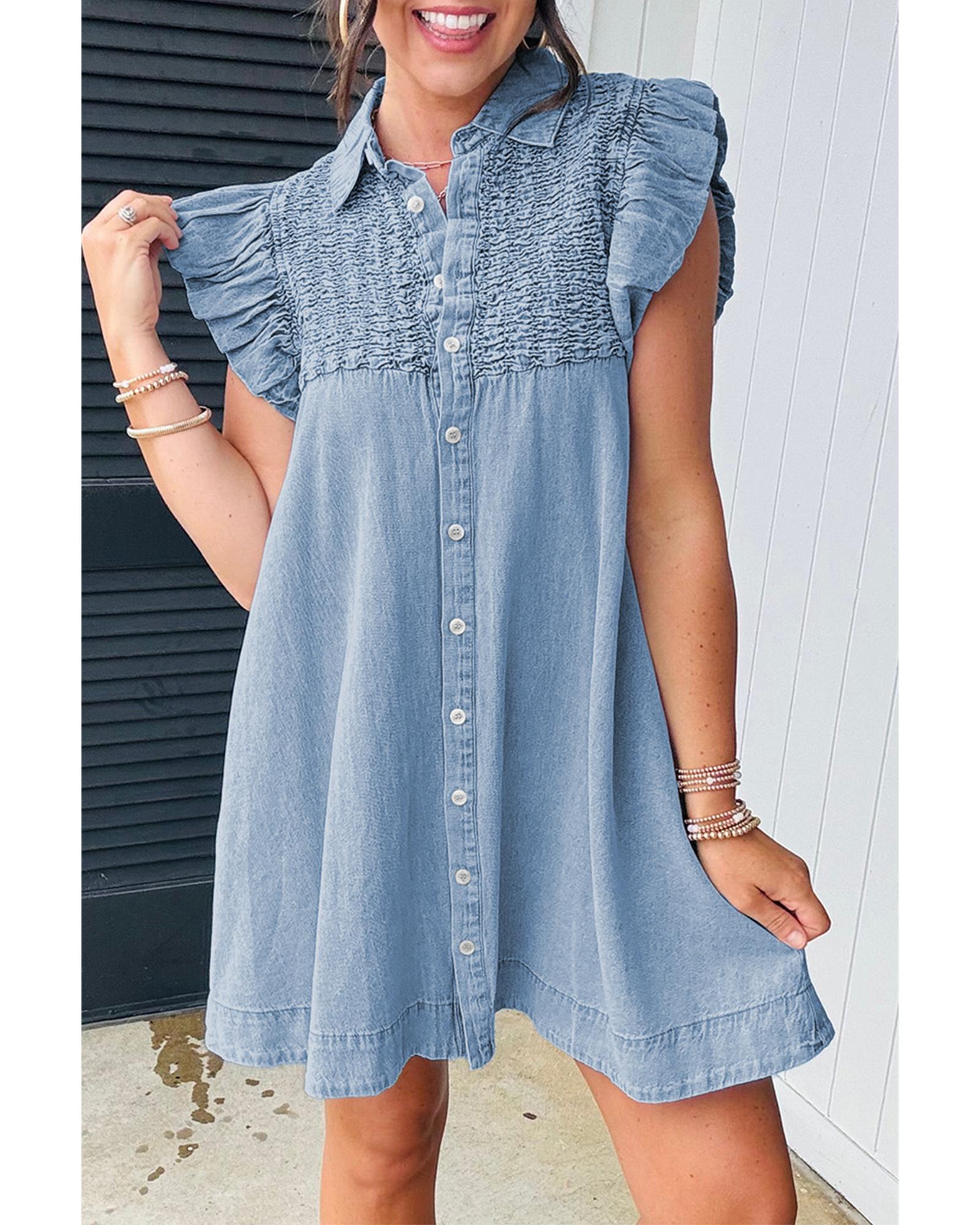 - Denim mini dress with flutter sleeves
