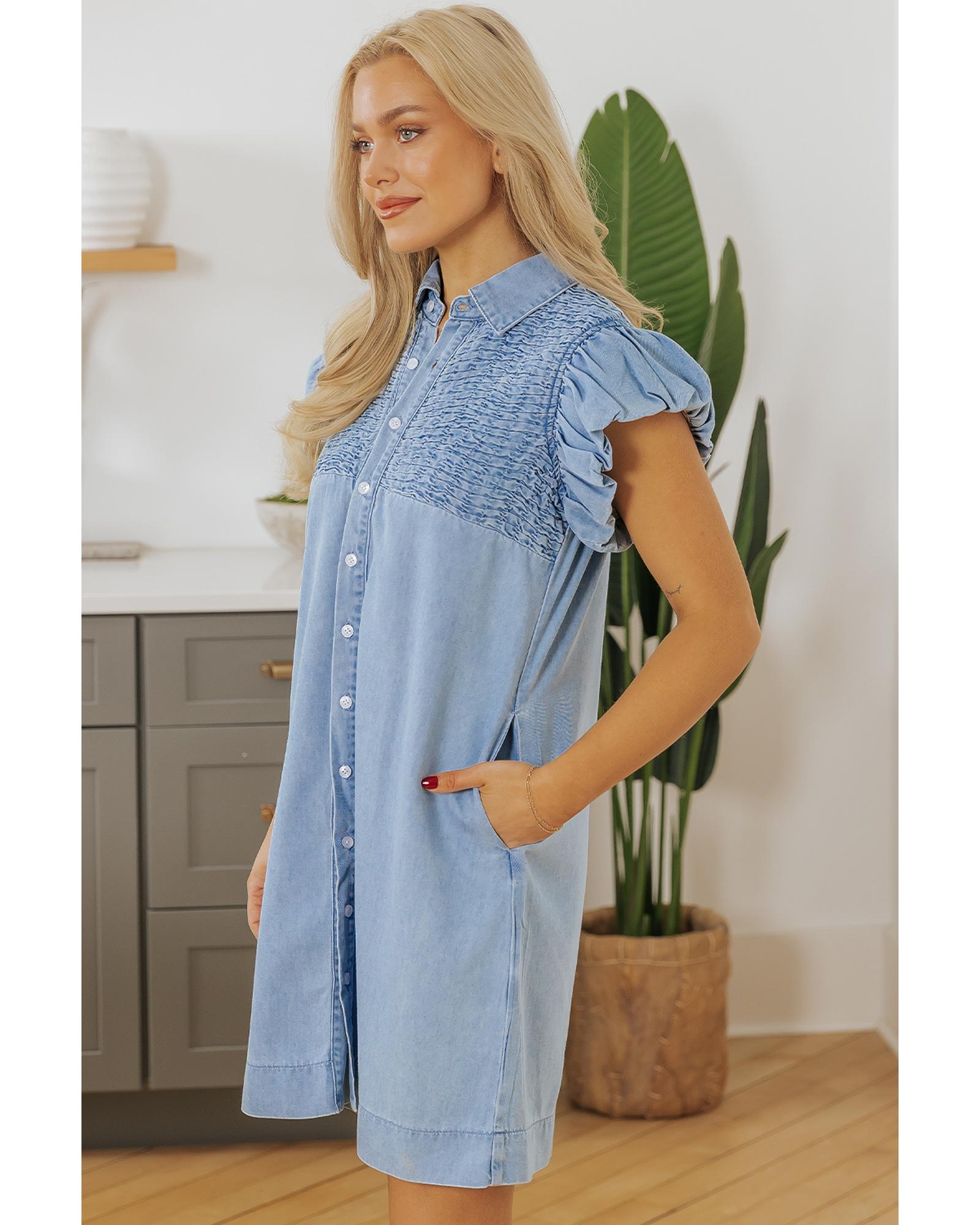 Beau Blue Flutter Sleeve Shirred Detail Button Up Denim Mini Dress – S
