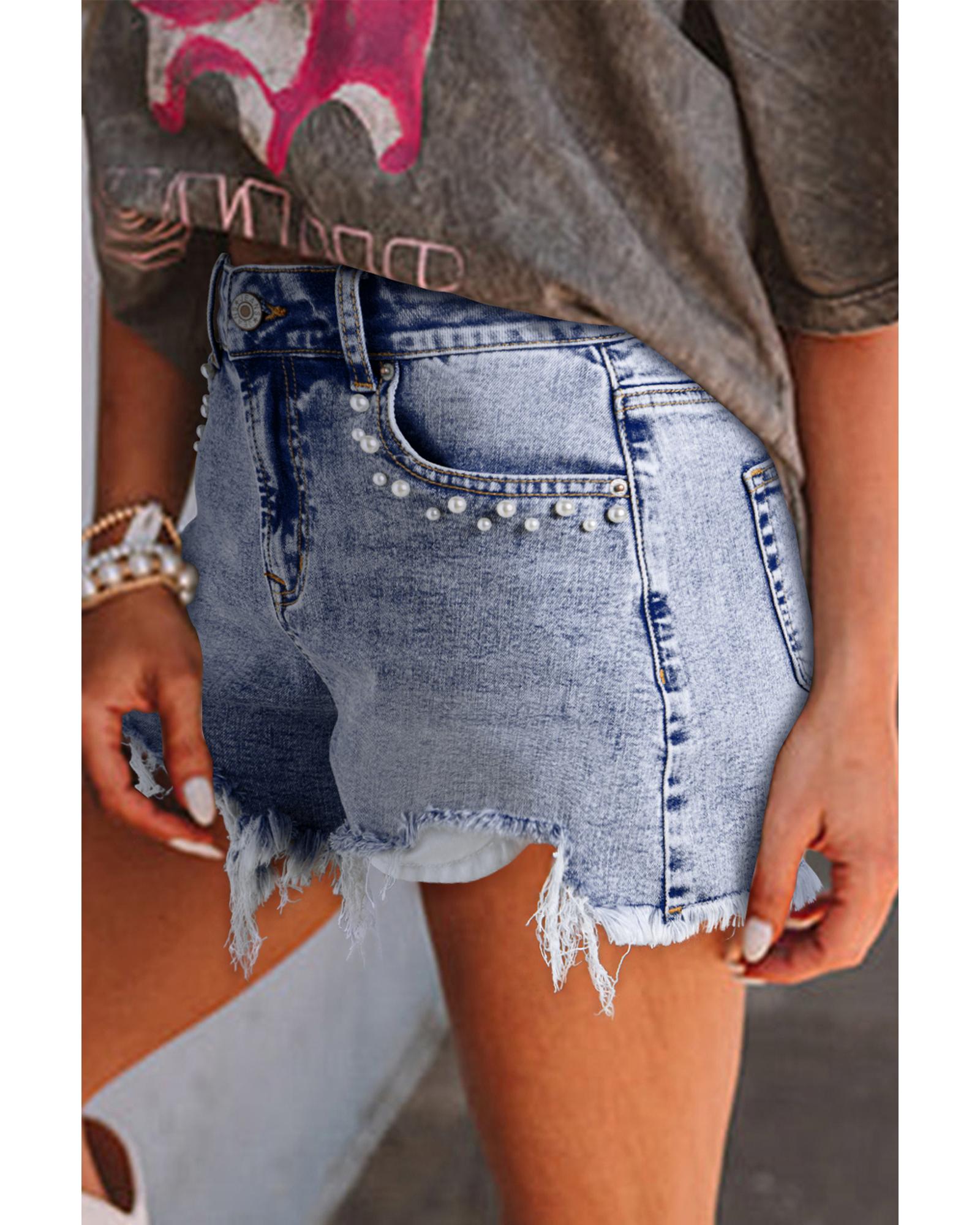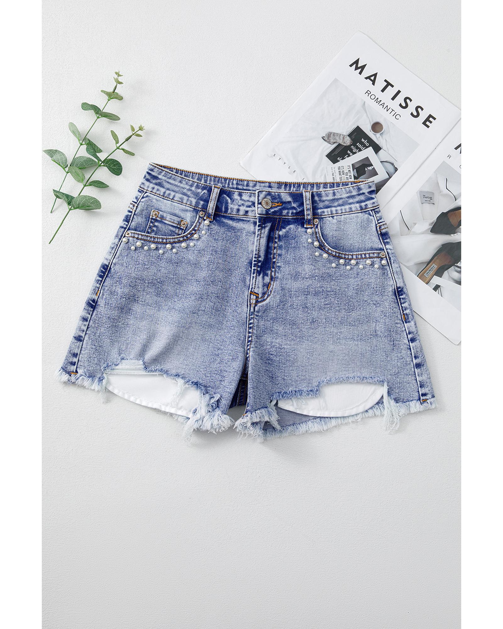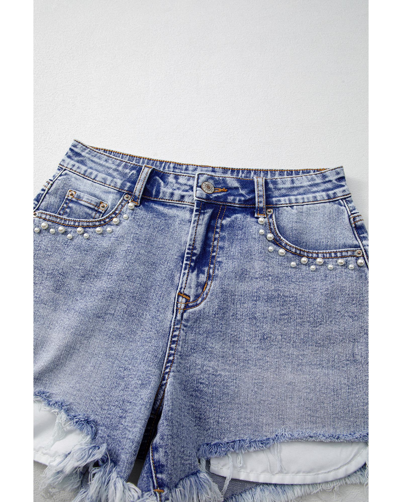 Beau Blue Pearl Studded Pockets Raw Hem Denim Shorts – 6 US