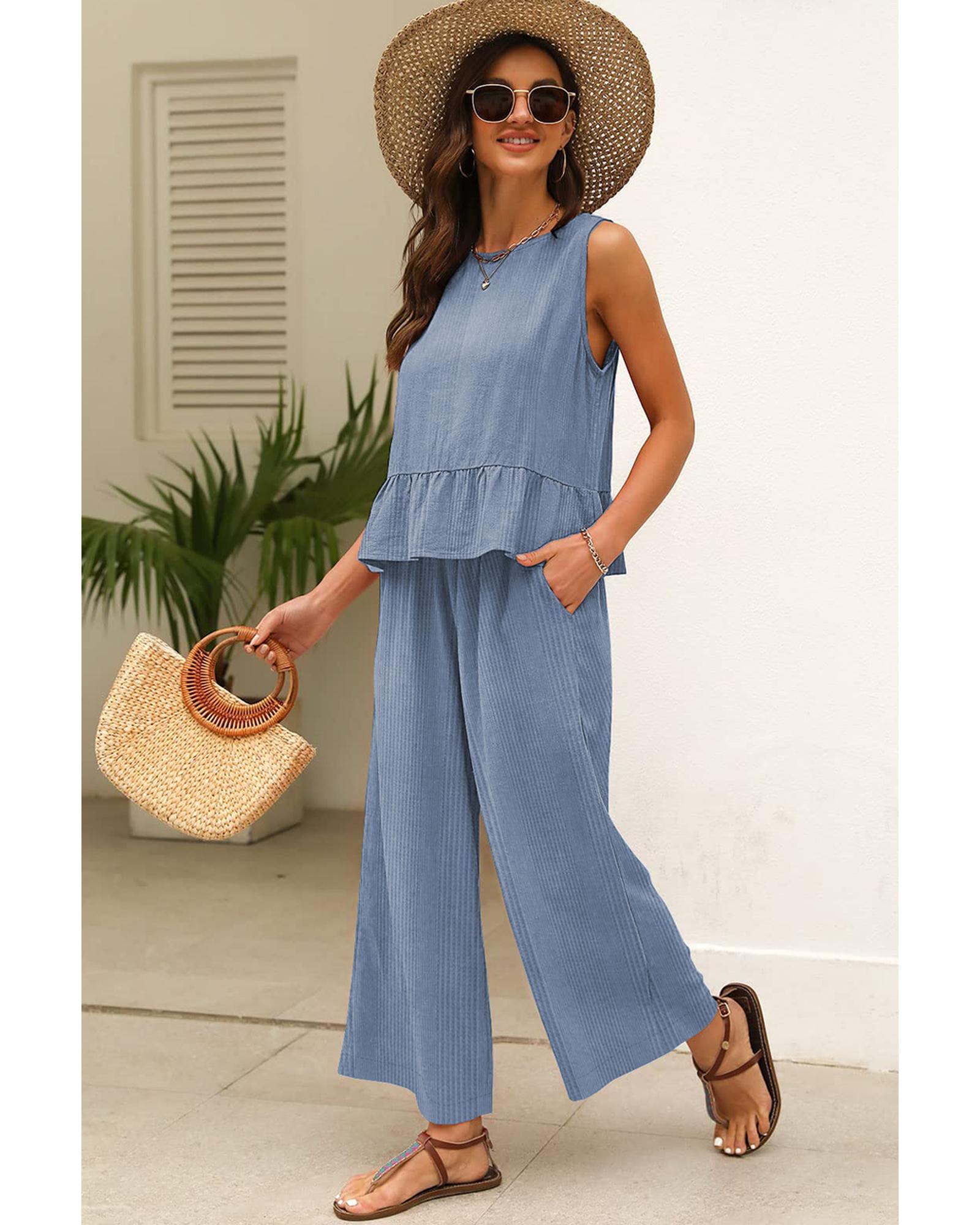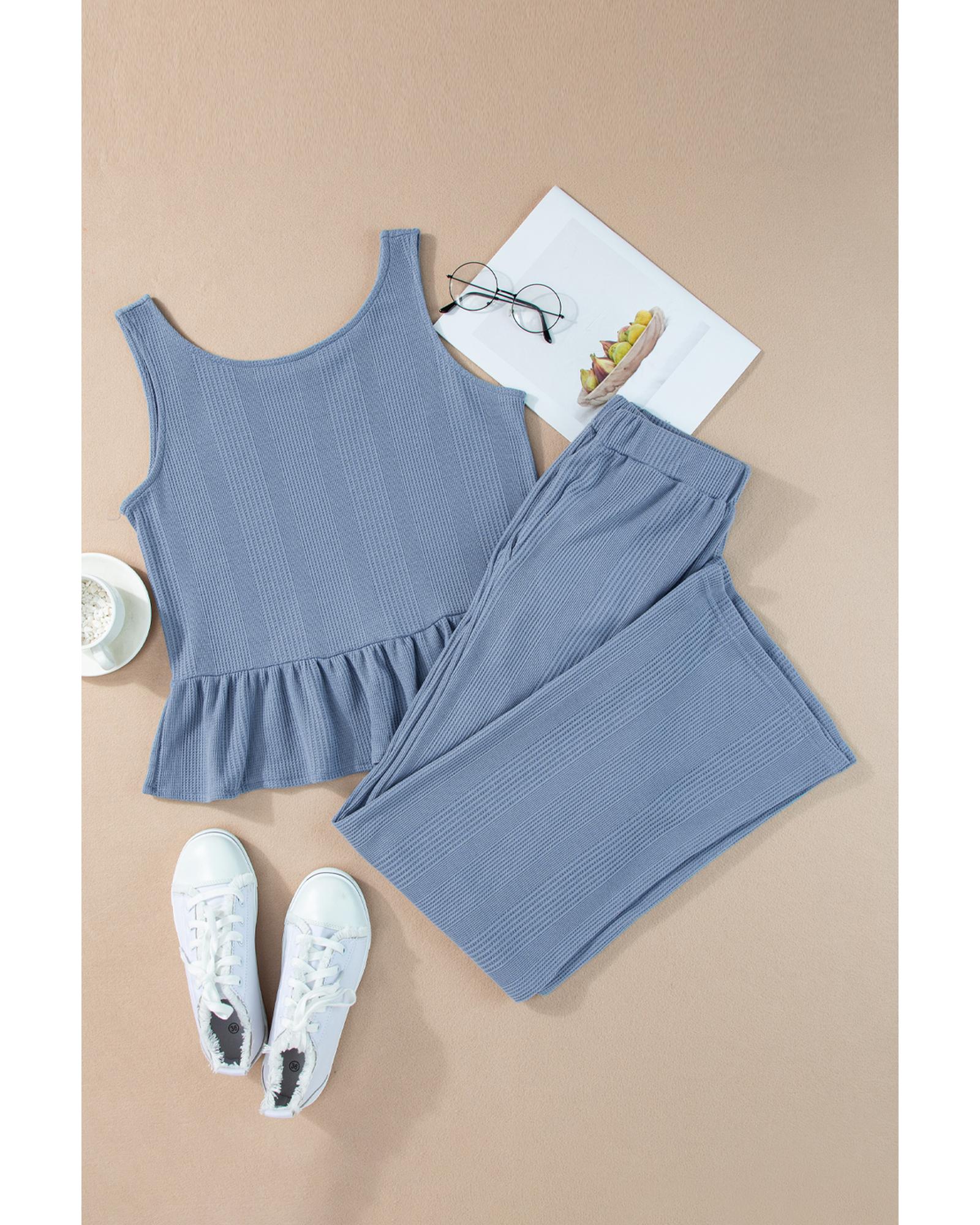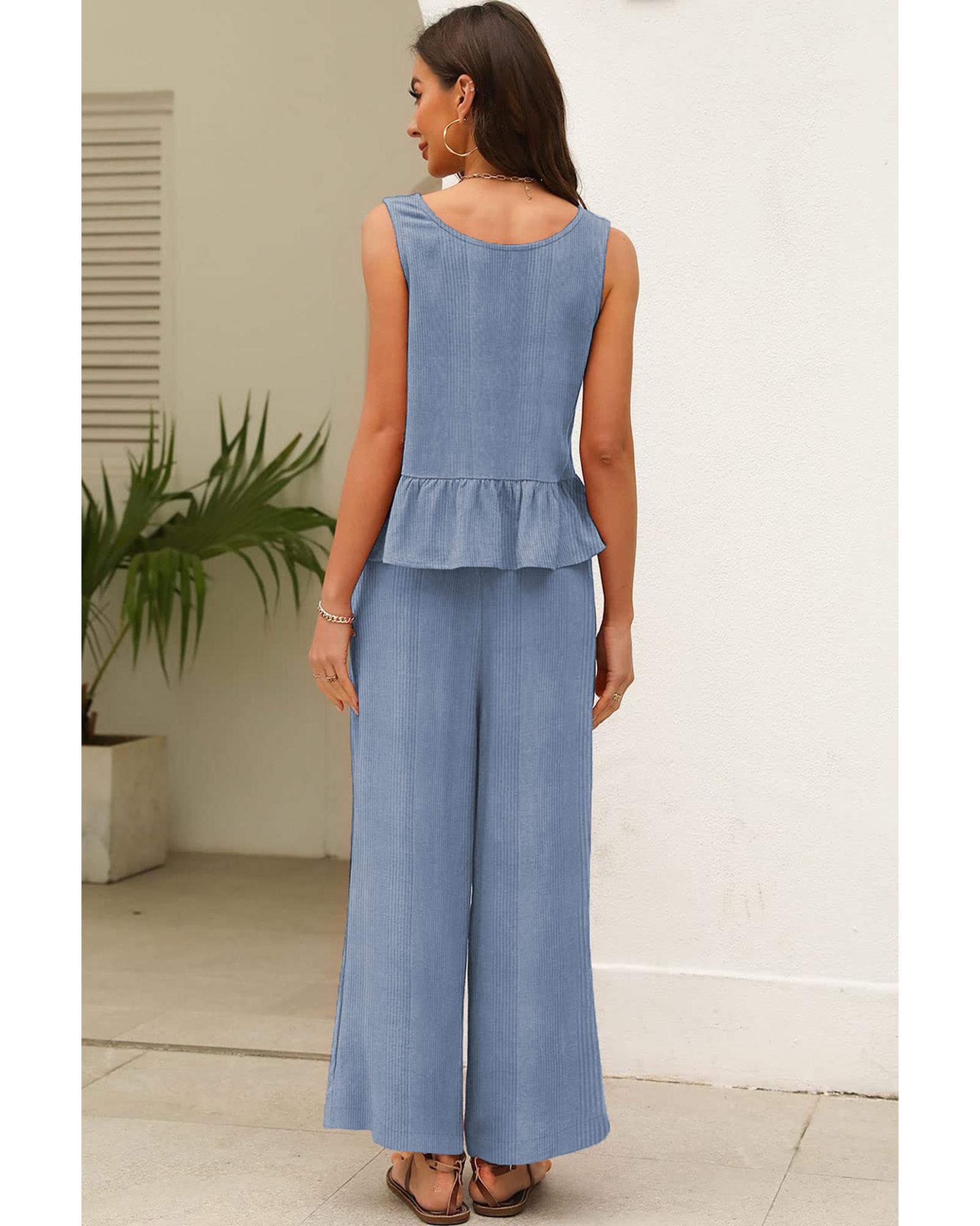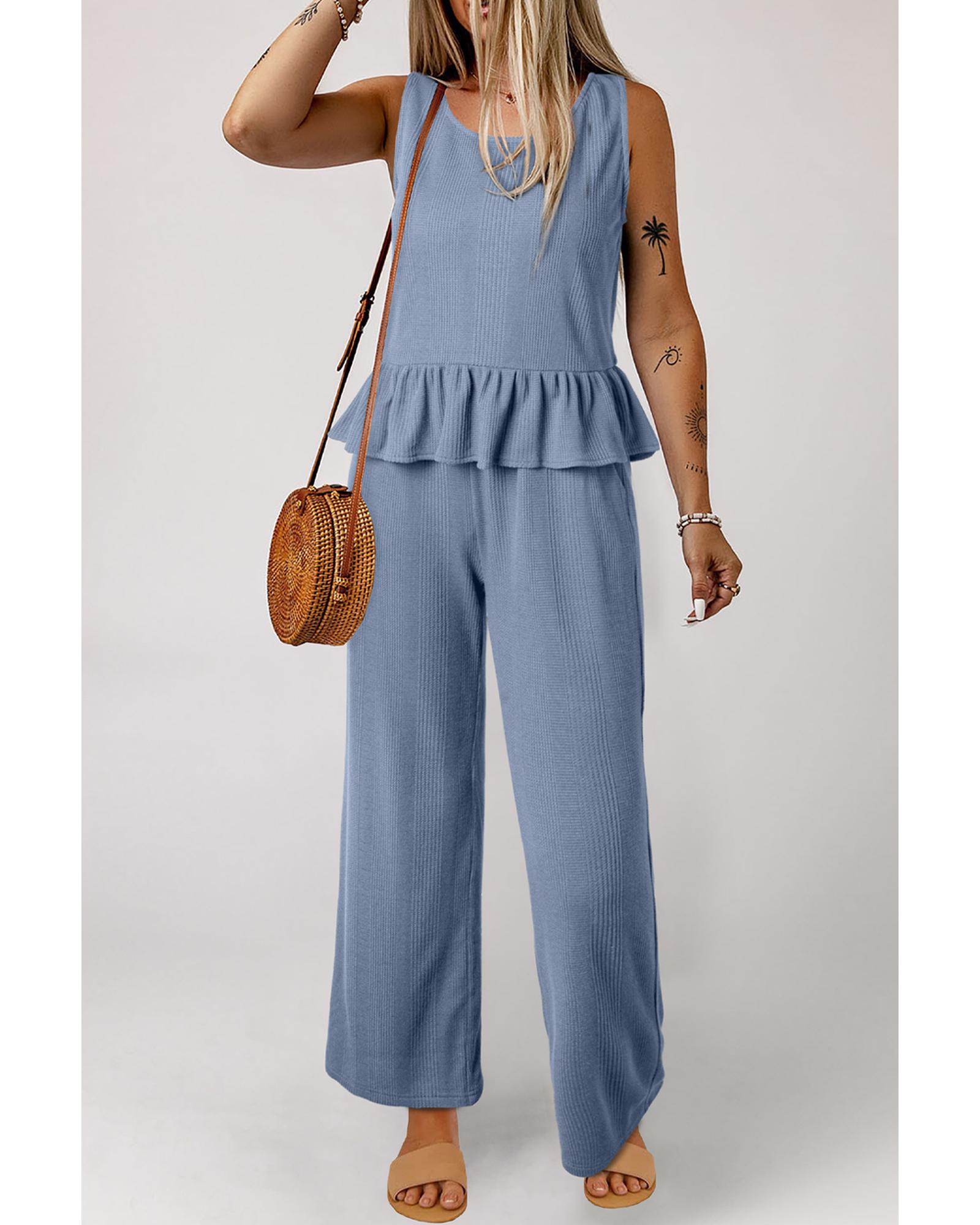 Beau Blue Solid Color Ribbed Ruffle Tank Top and Pants Set – L